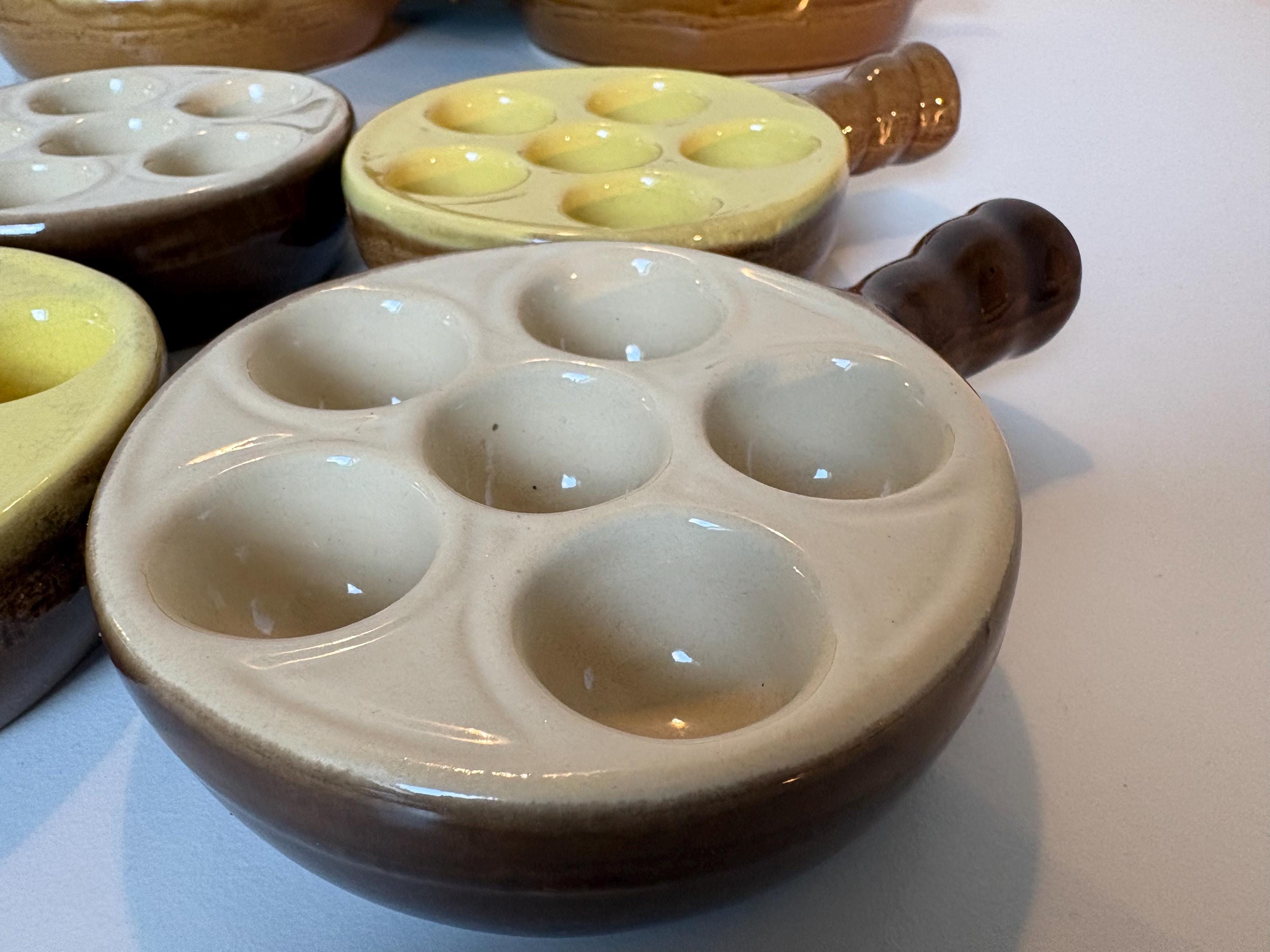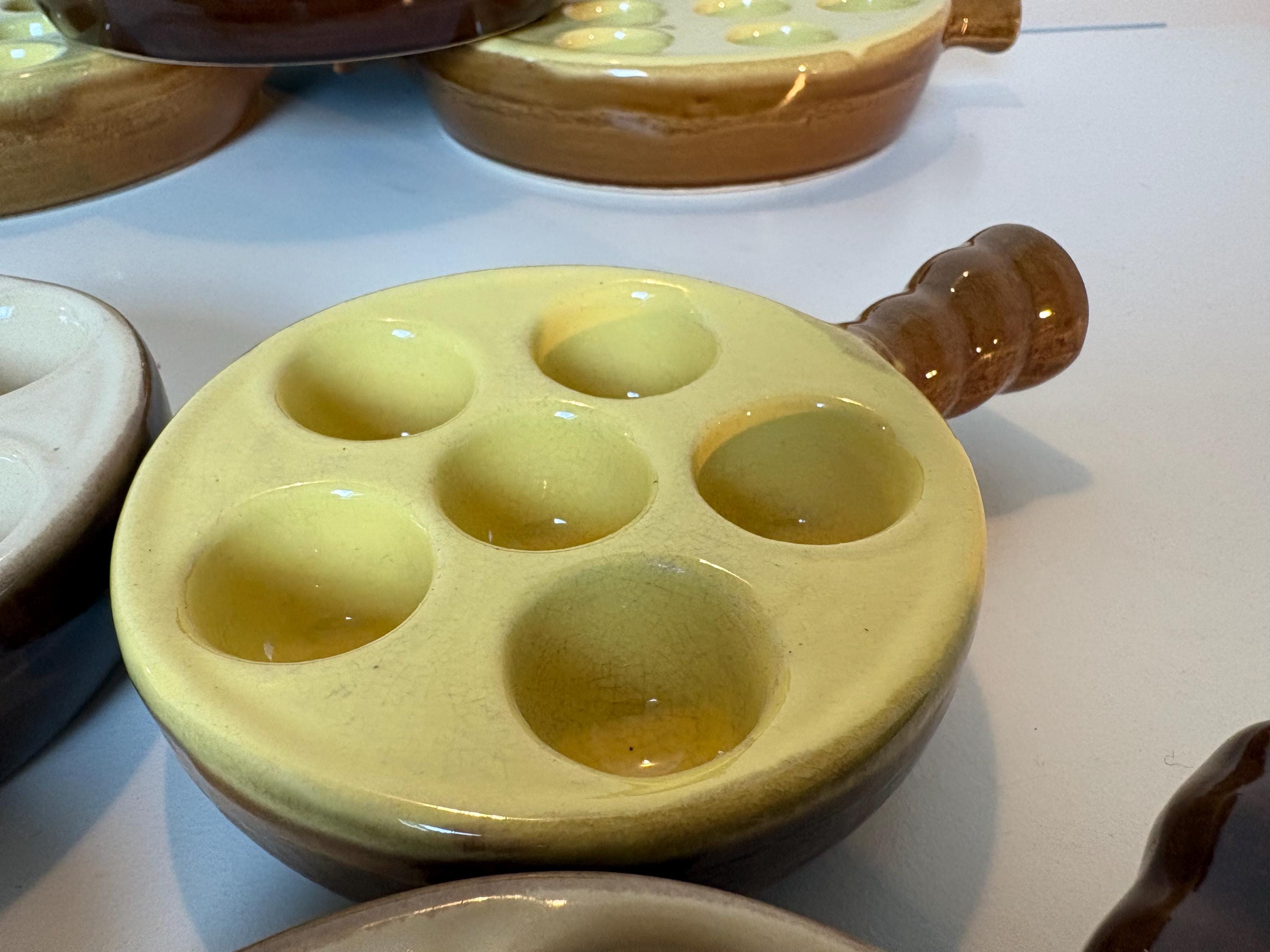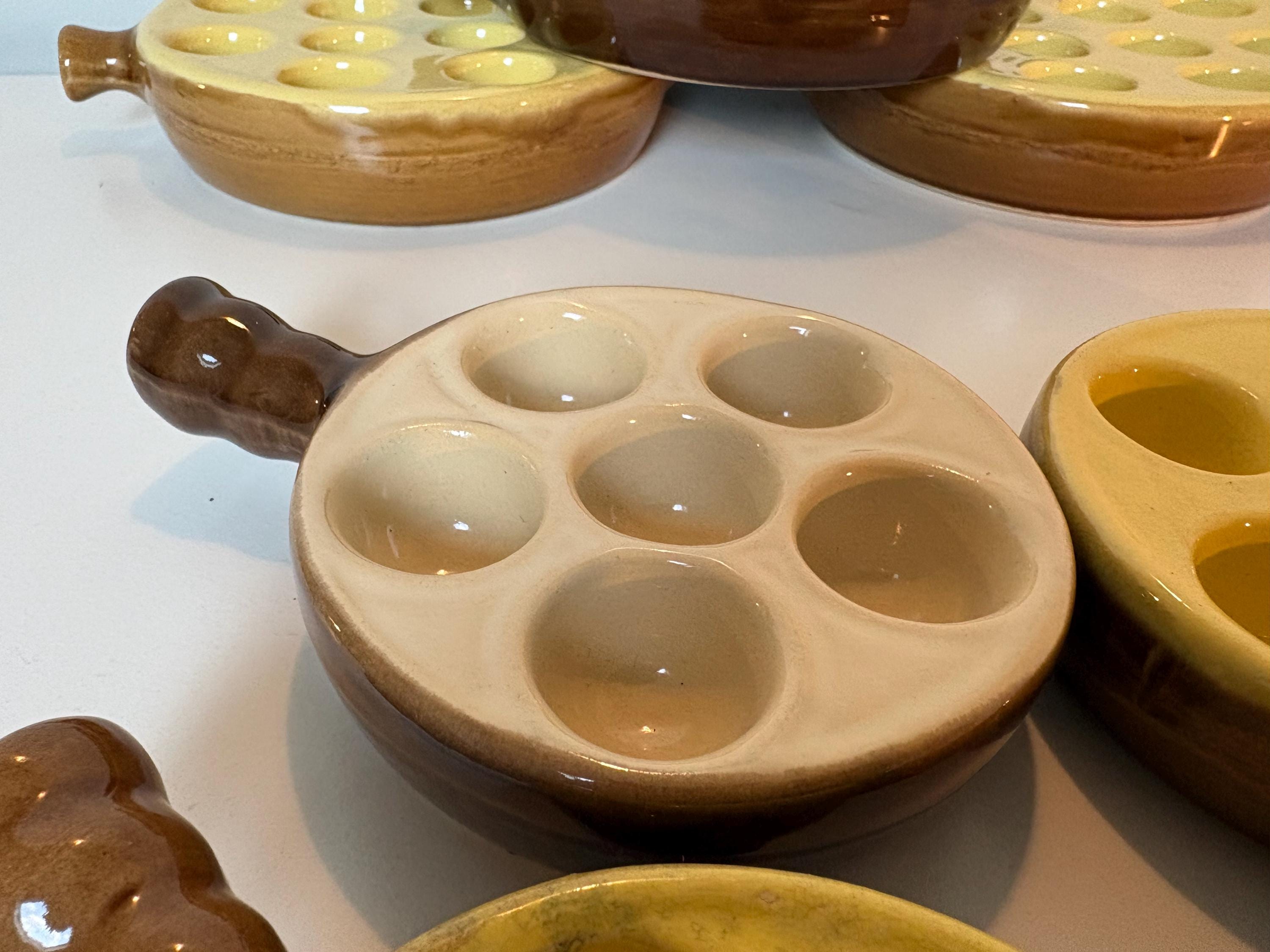 Set of 4 vintage escargot bakeware dishes in brown, beige and yellow shades made in France 1980s. Mix and match set.