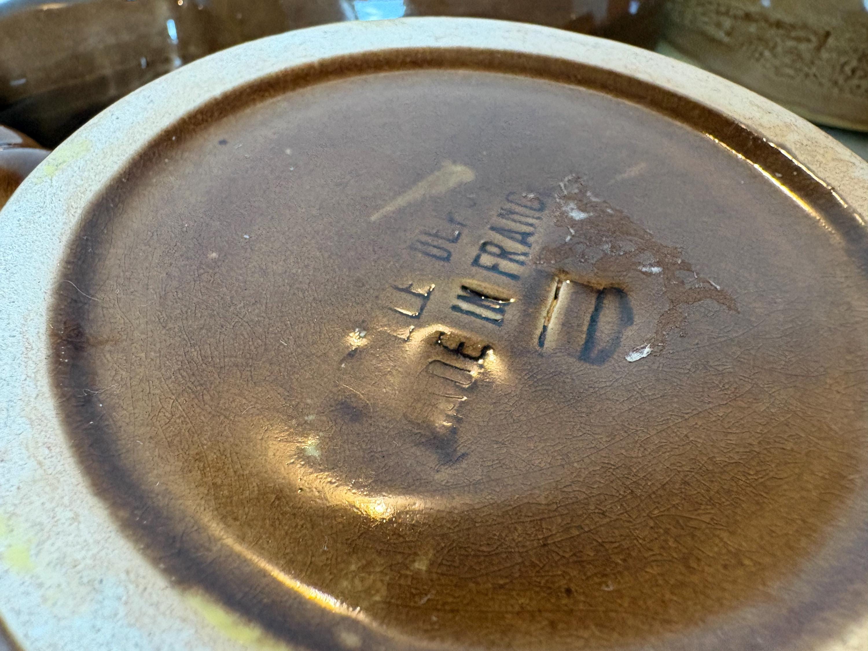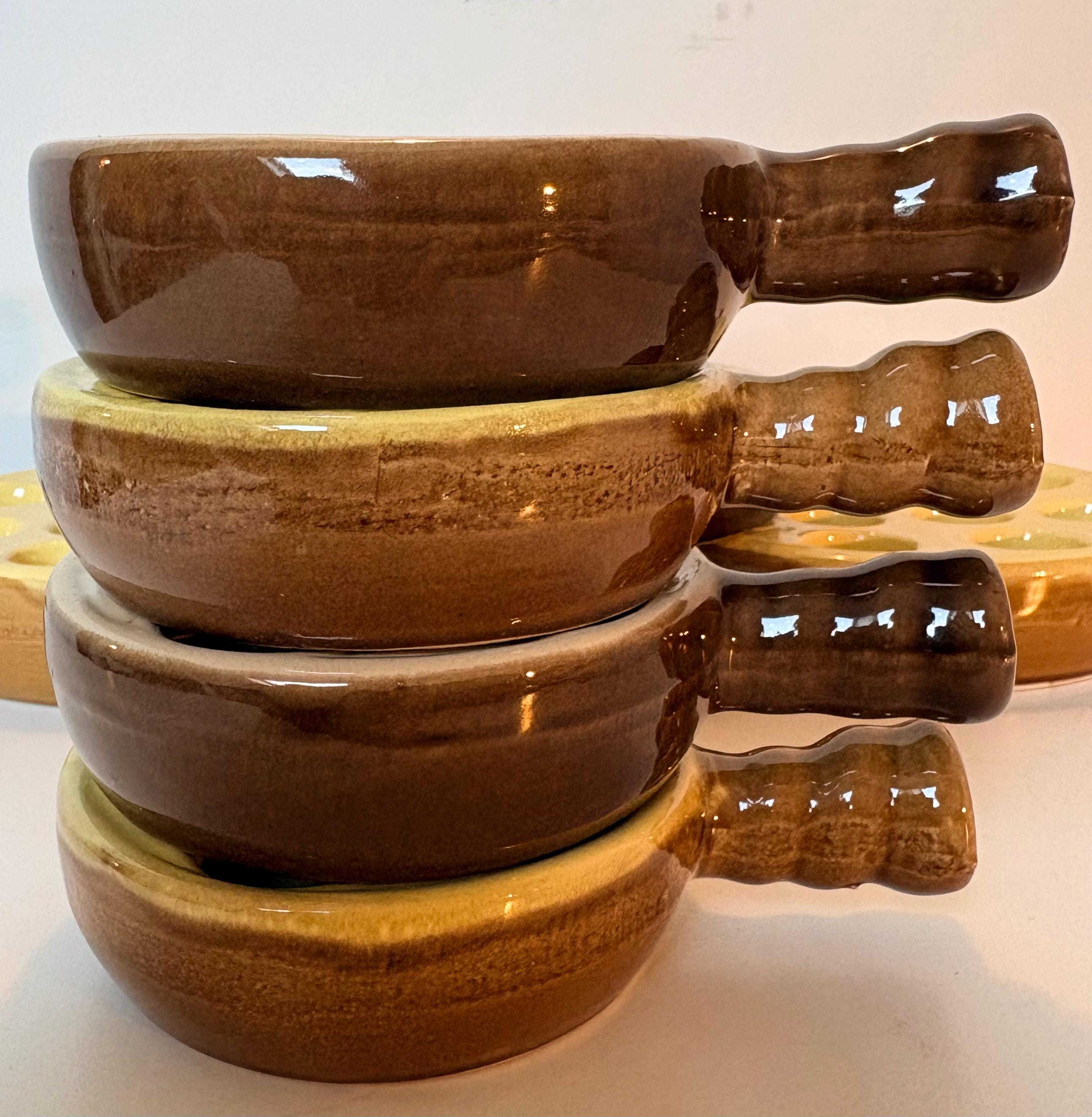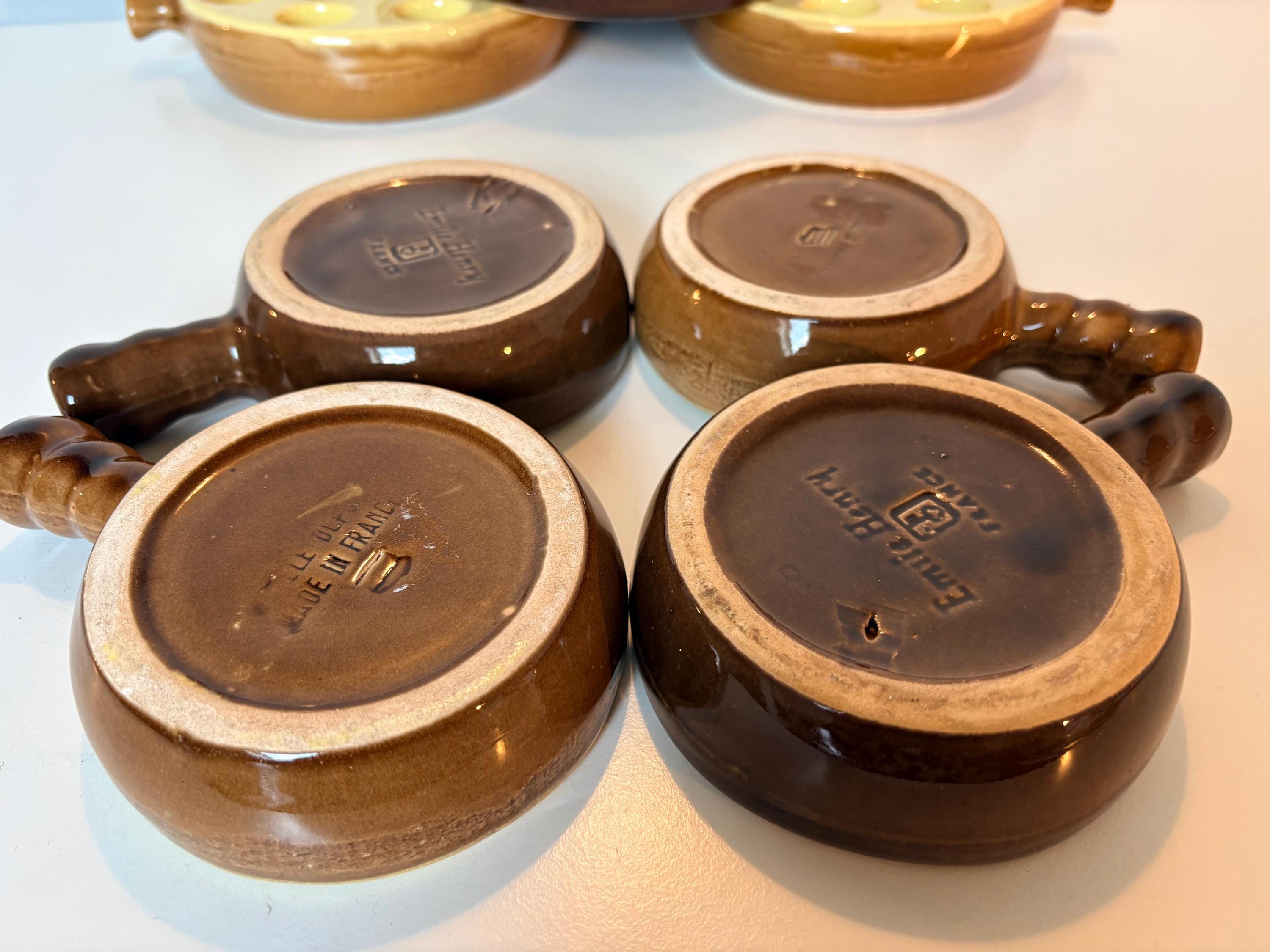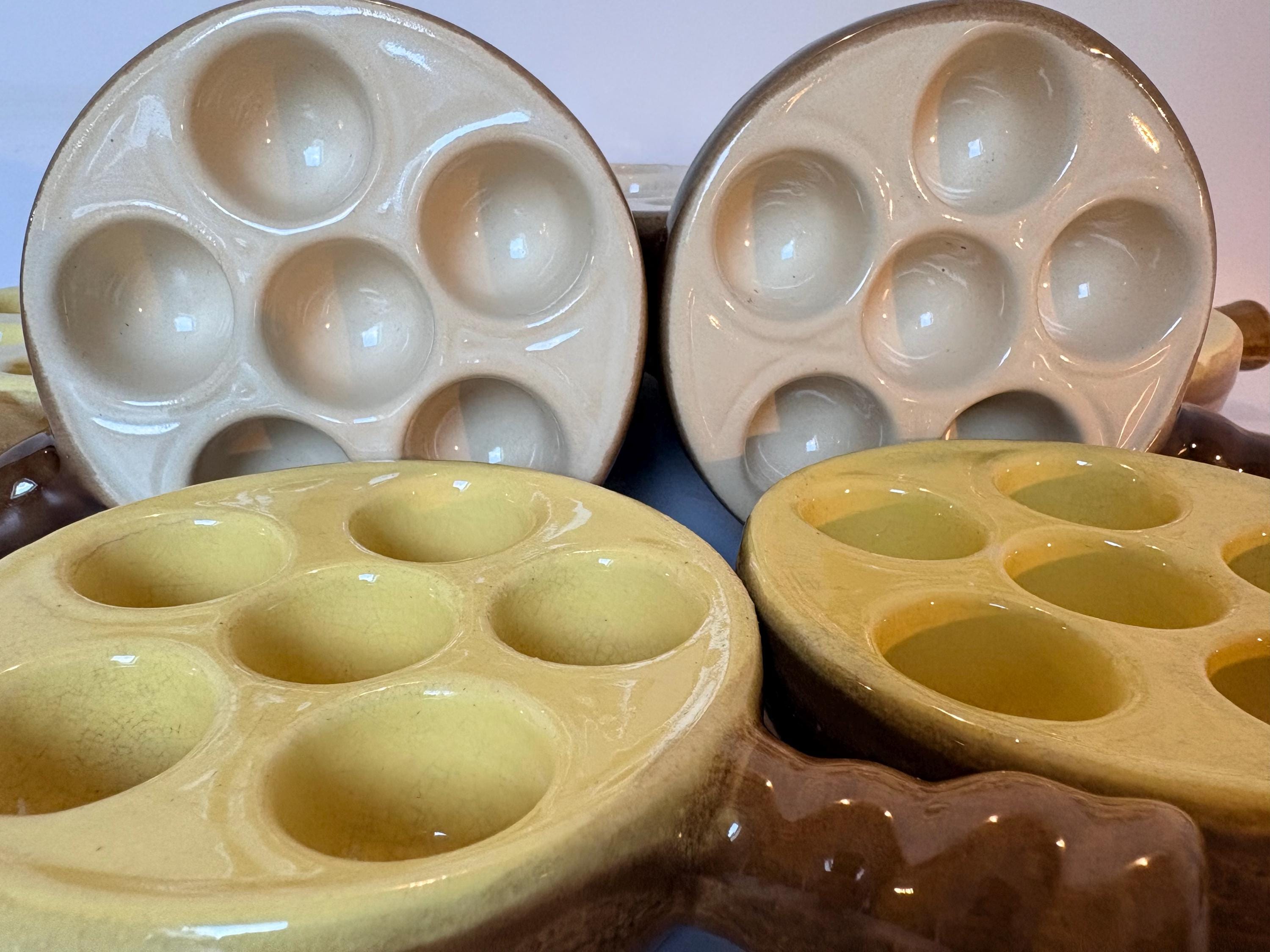 Set of 4 vintage escargot bakeware dishes in brown, beige and yellow shades made in France 1980s. Mix and match set.
