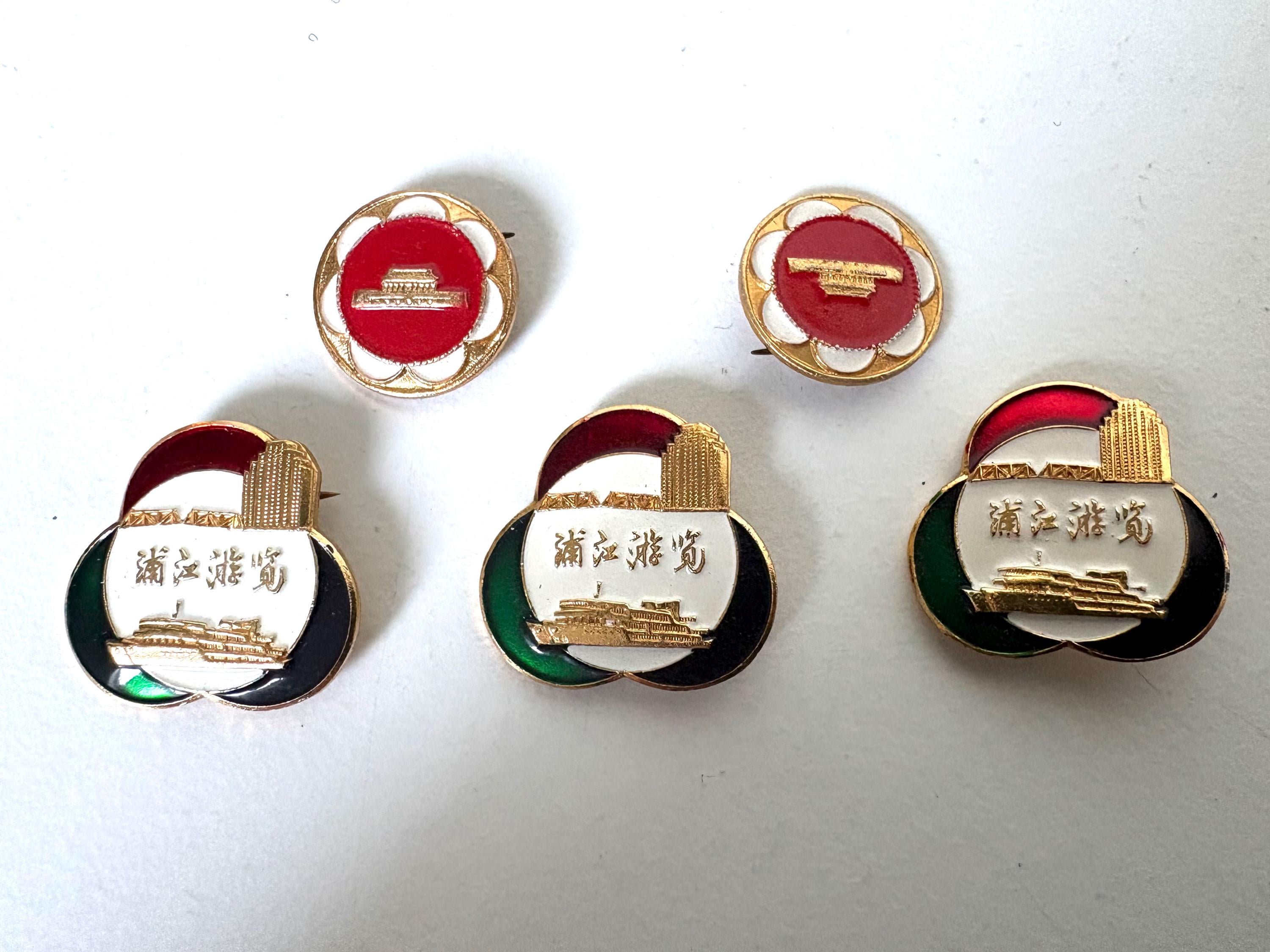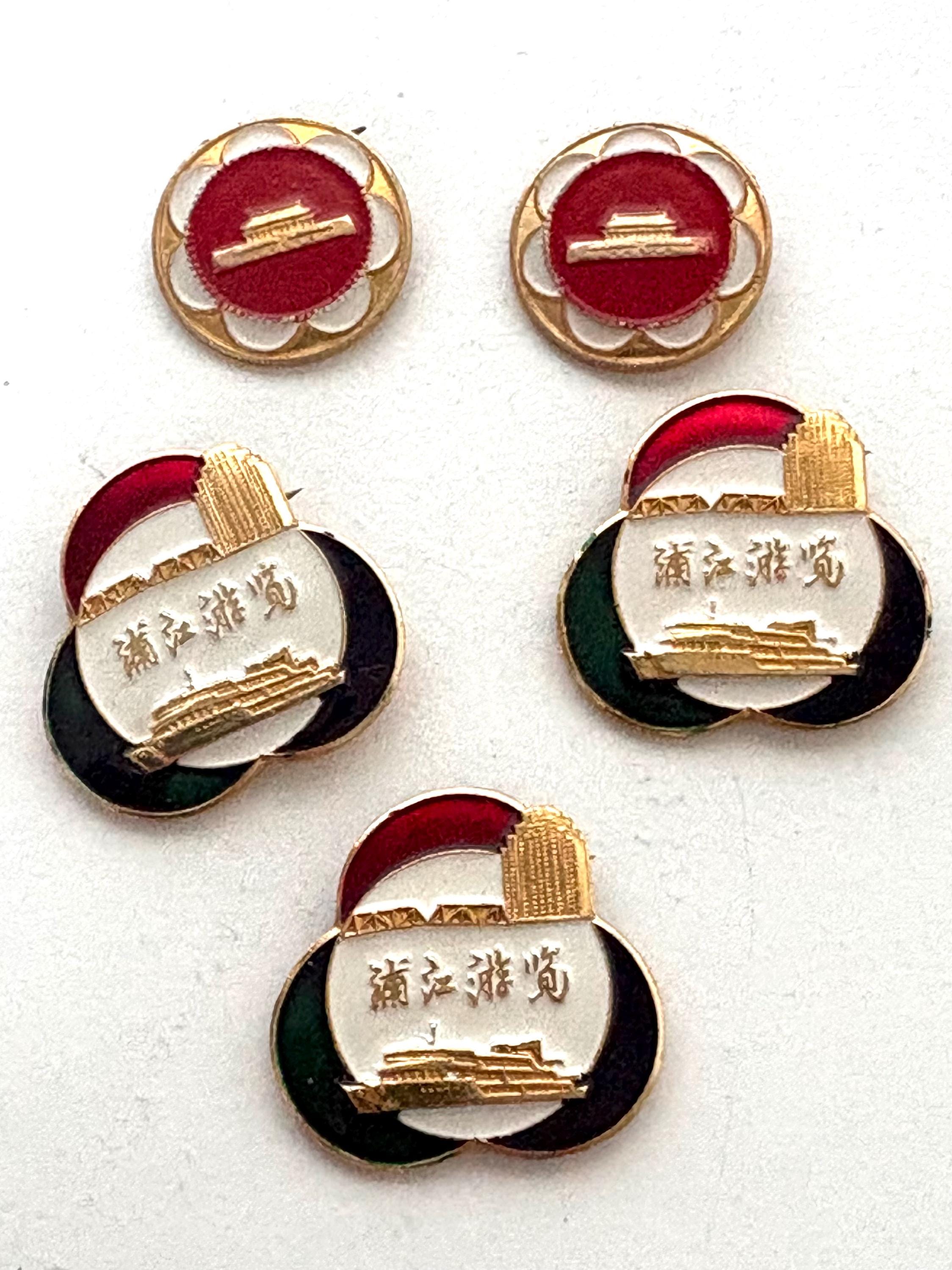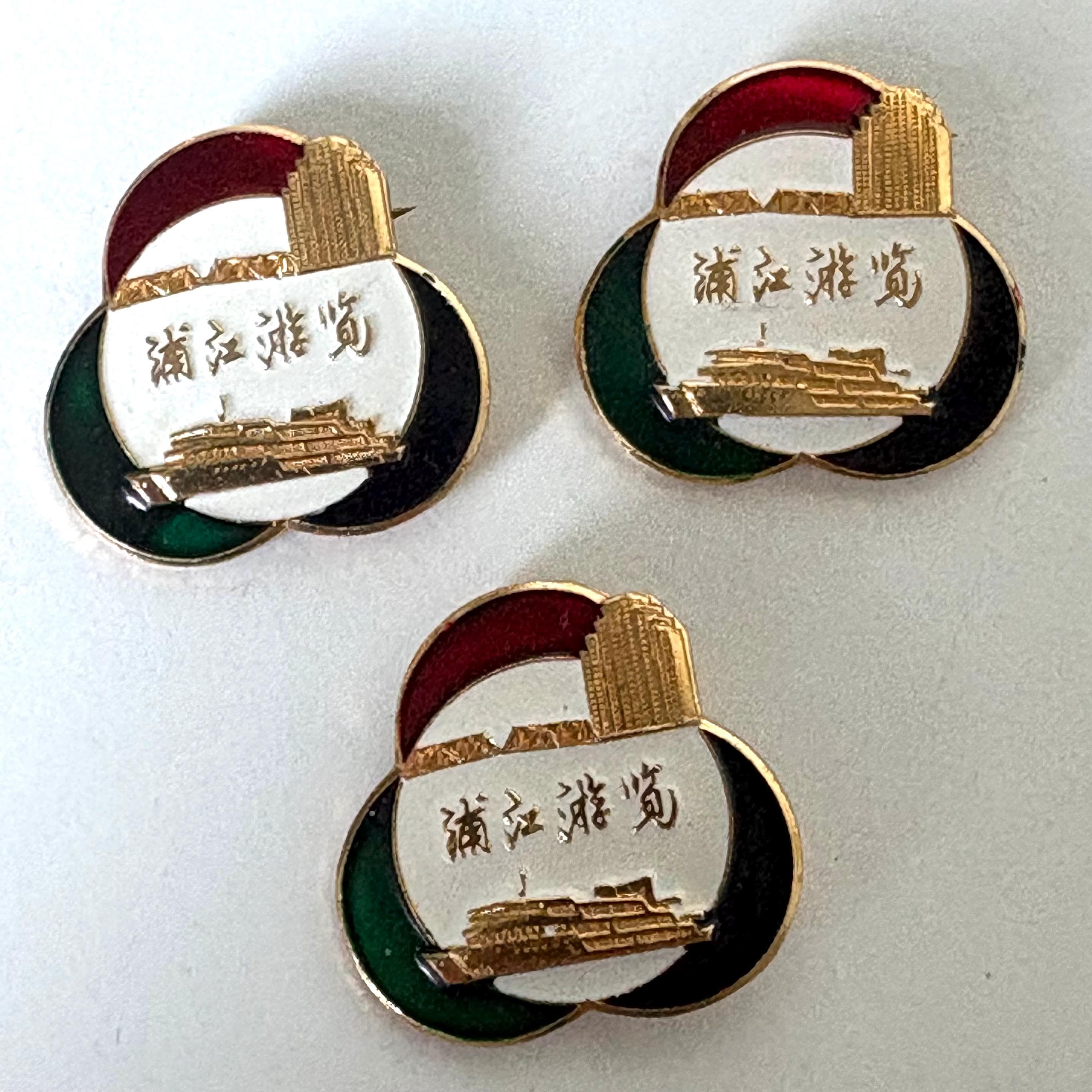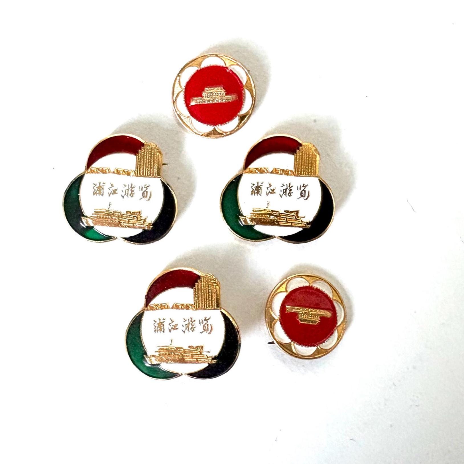 Vintage Souvenir Pins, Tiananmen Square, Heavenly Peace Square, Beijing and a river tour in Shanghai, China 1970s / 1980s.