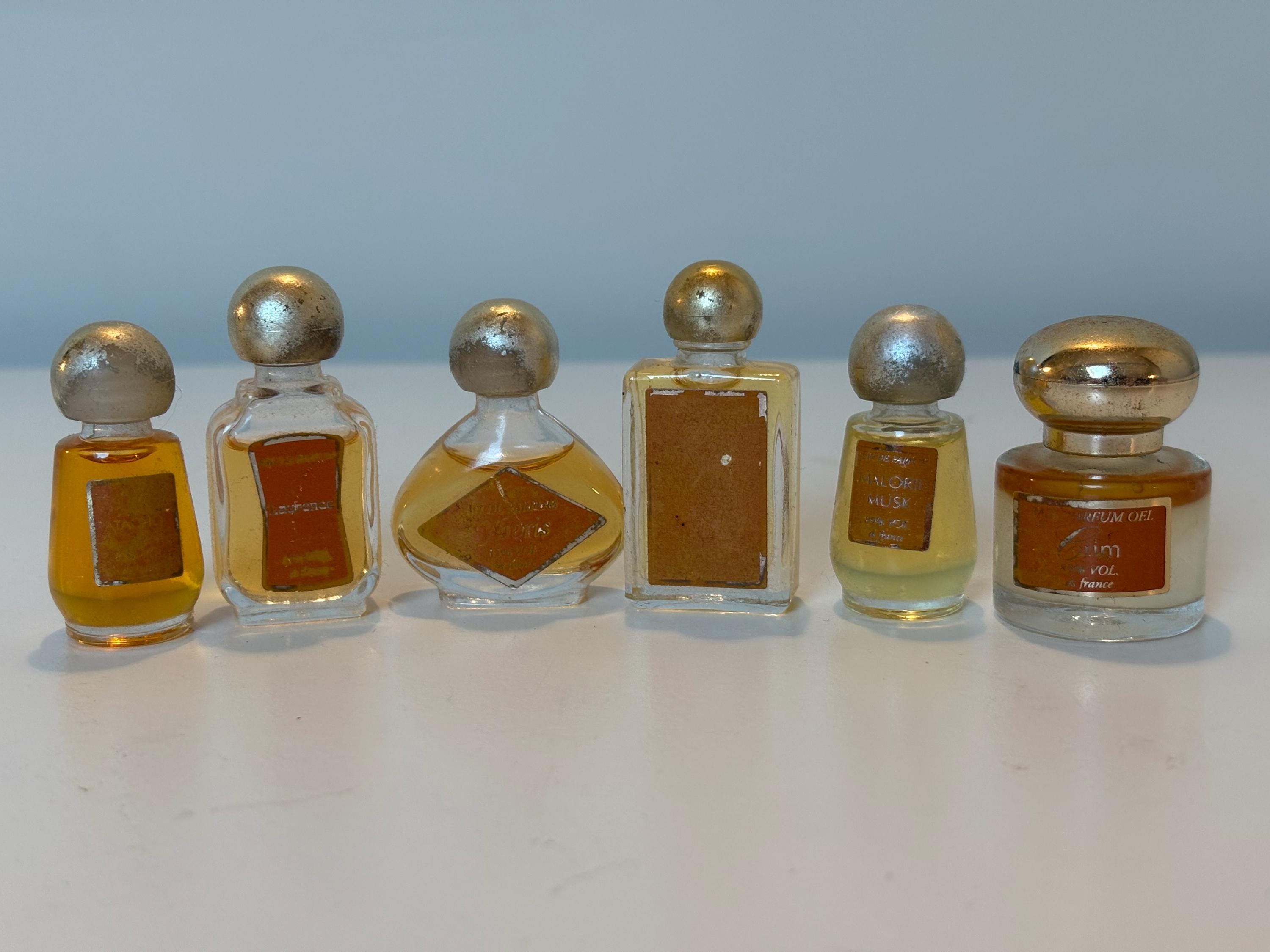 The French perfume bottles show some signs of age, the gold on the bottle caps has faded and not all the perfume names are legible anymore. See the pictures.