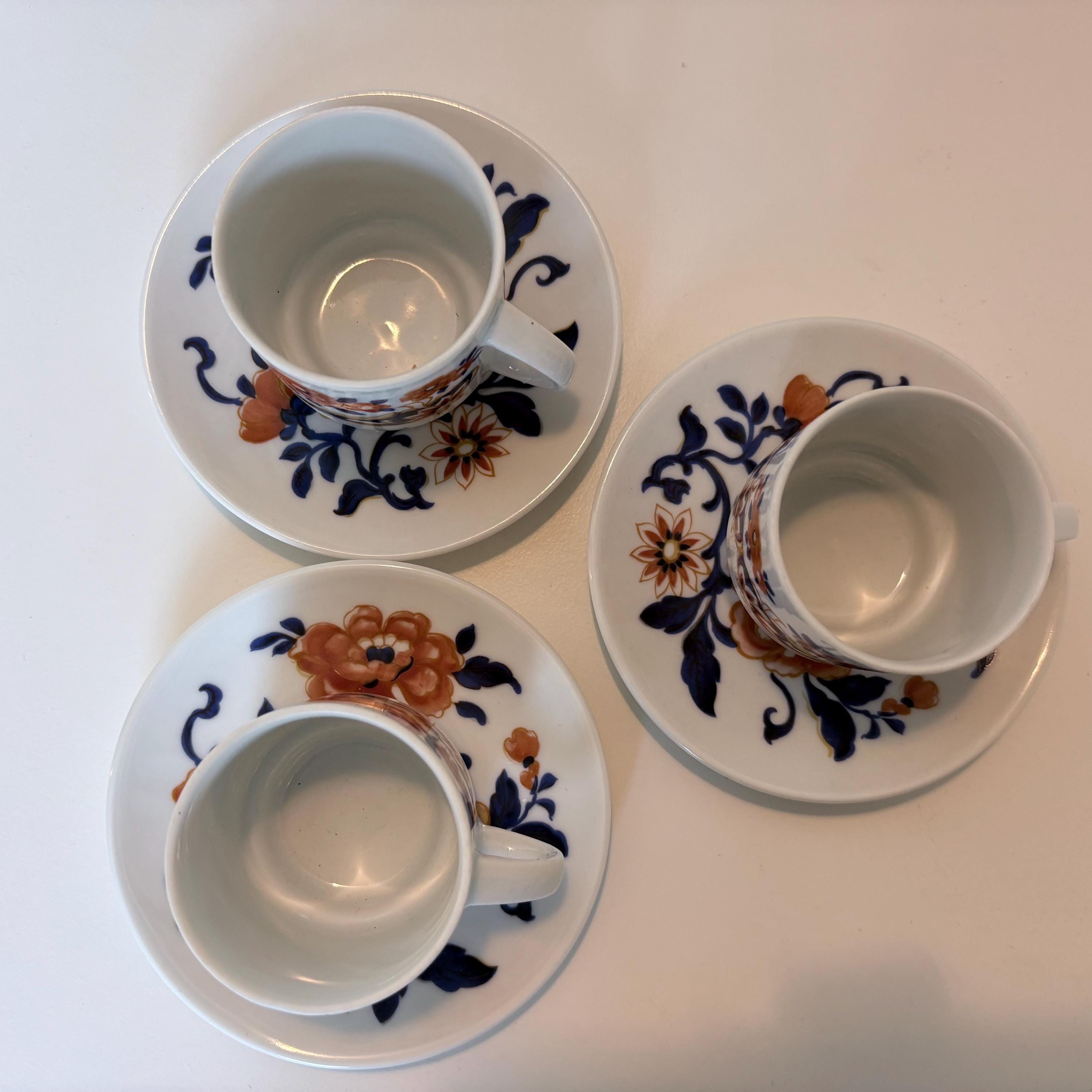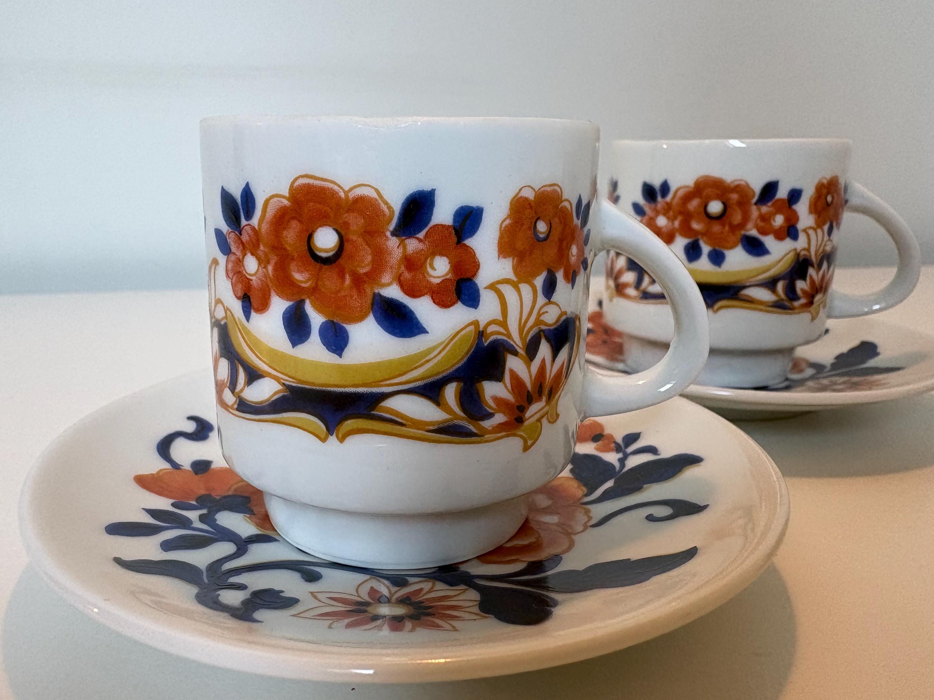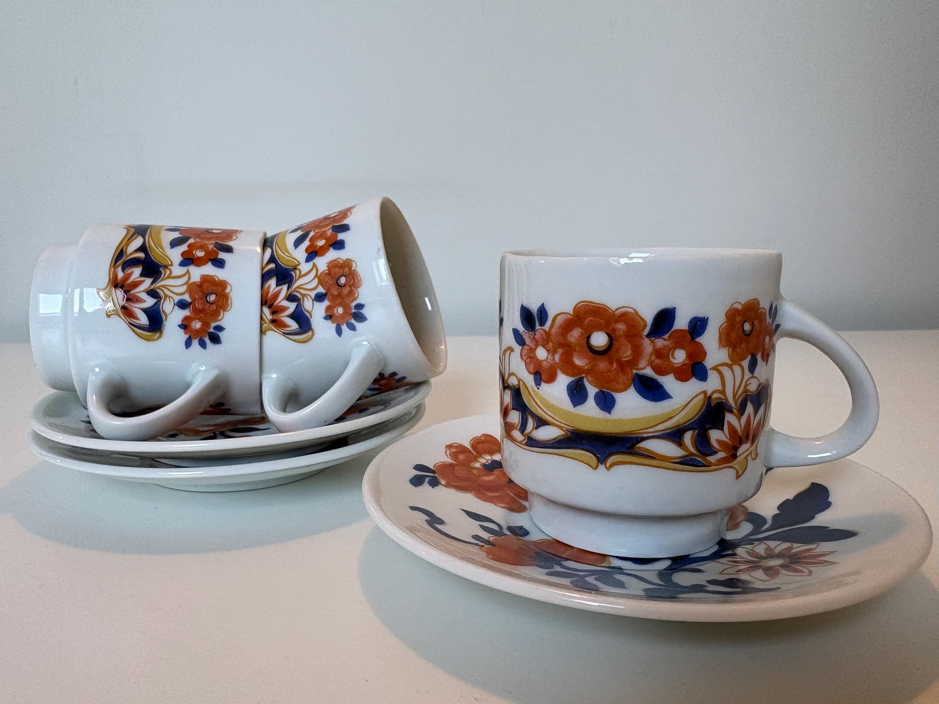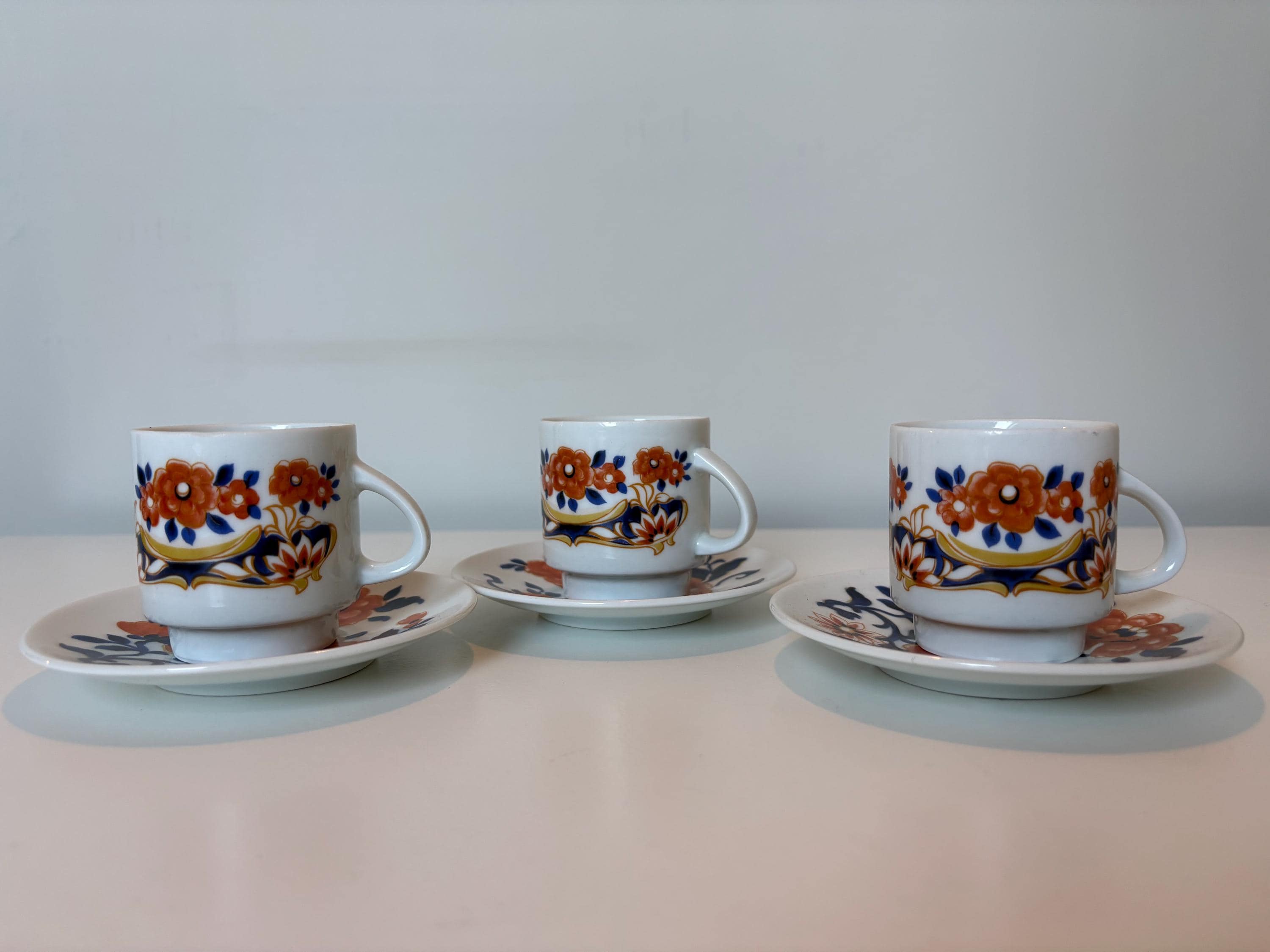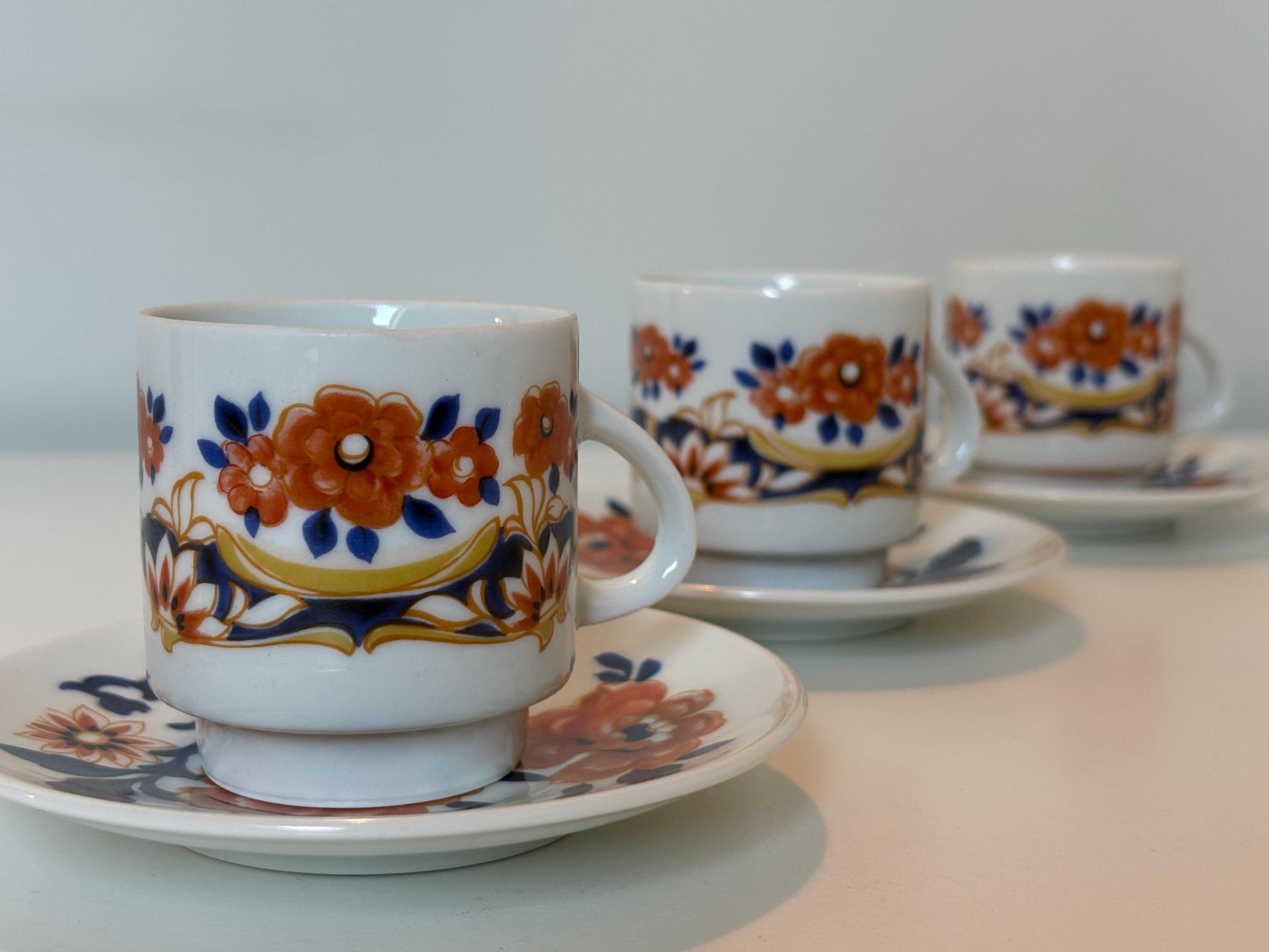 Sets of 3 very decorative retro coffee cups and saucers, porcelain decorated with flowers in bright colors. Vintage tableware from the 1980s.