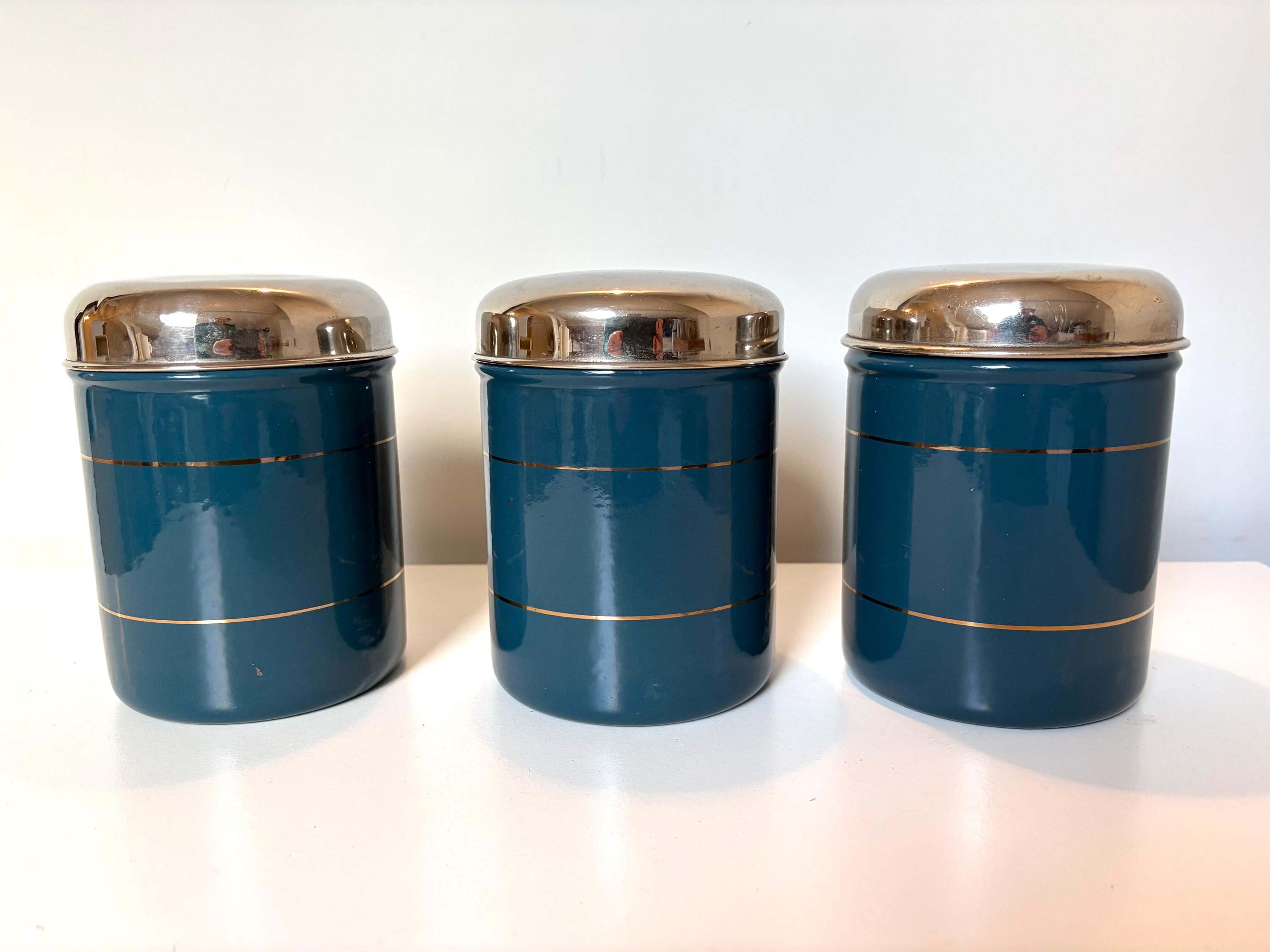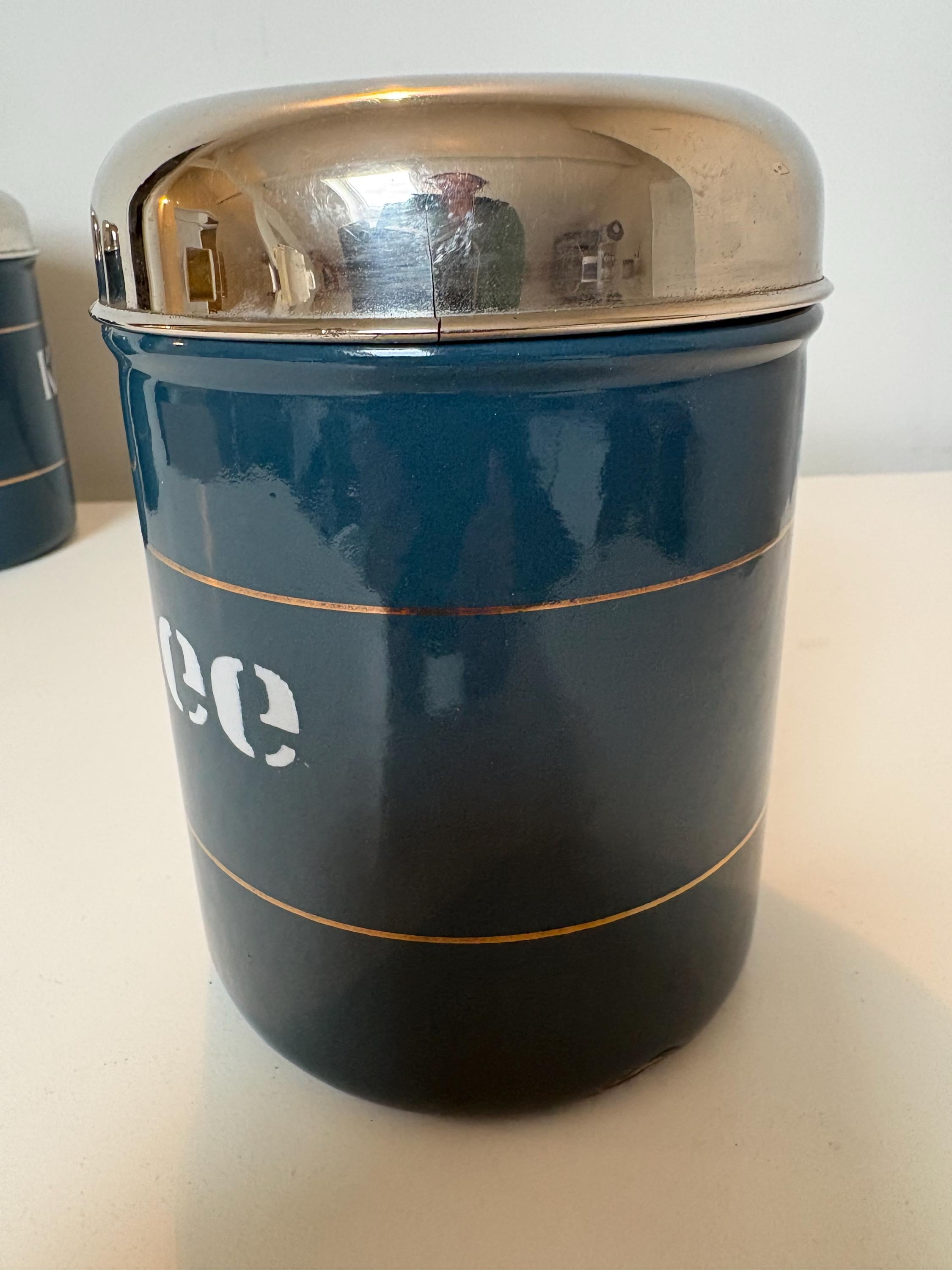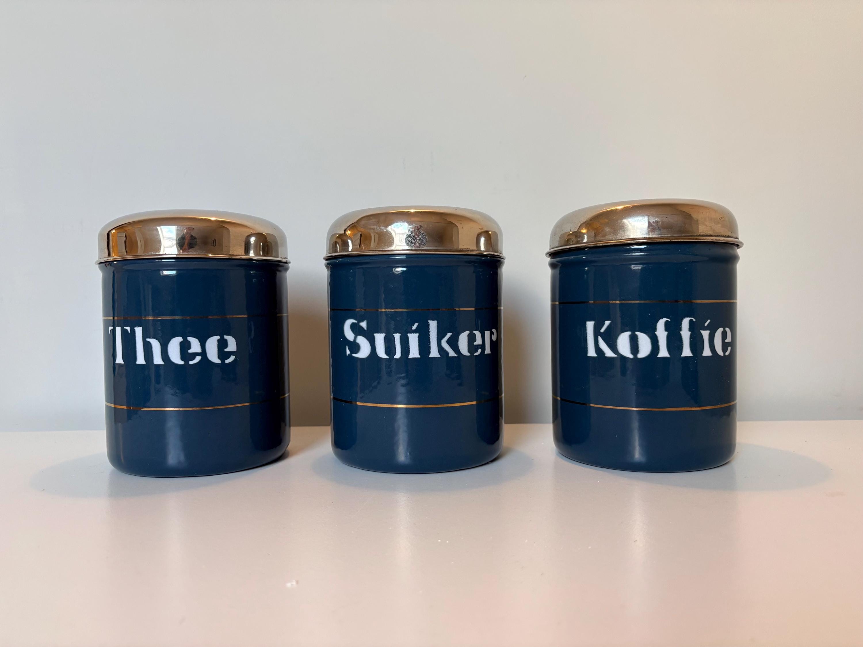Dutch vintage enamel storage containers coffee, tea, sugar, coffee, tea, sugar, in blue, set of 3, Manufactured in the Netherlands 1950s