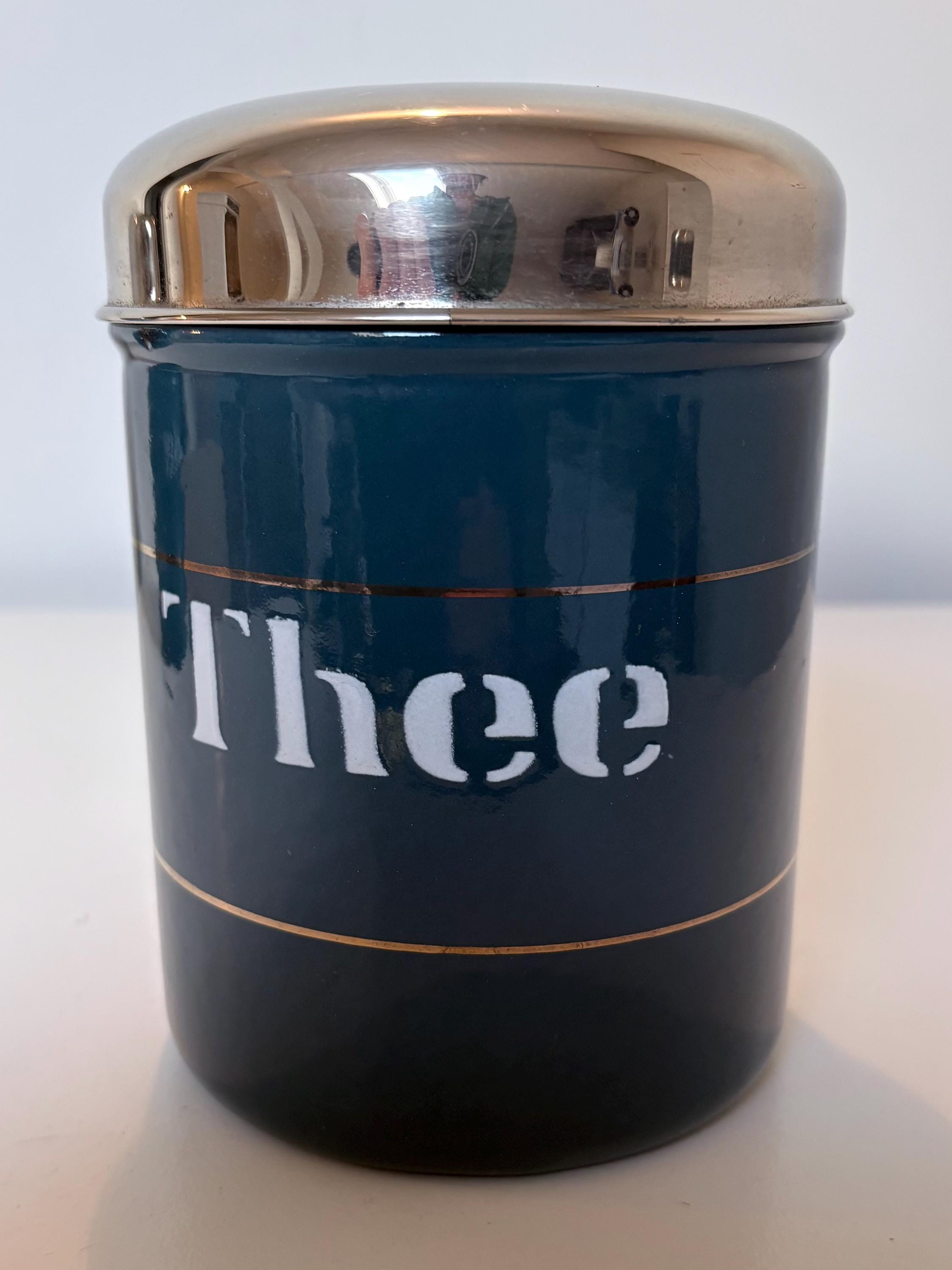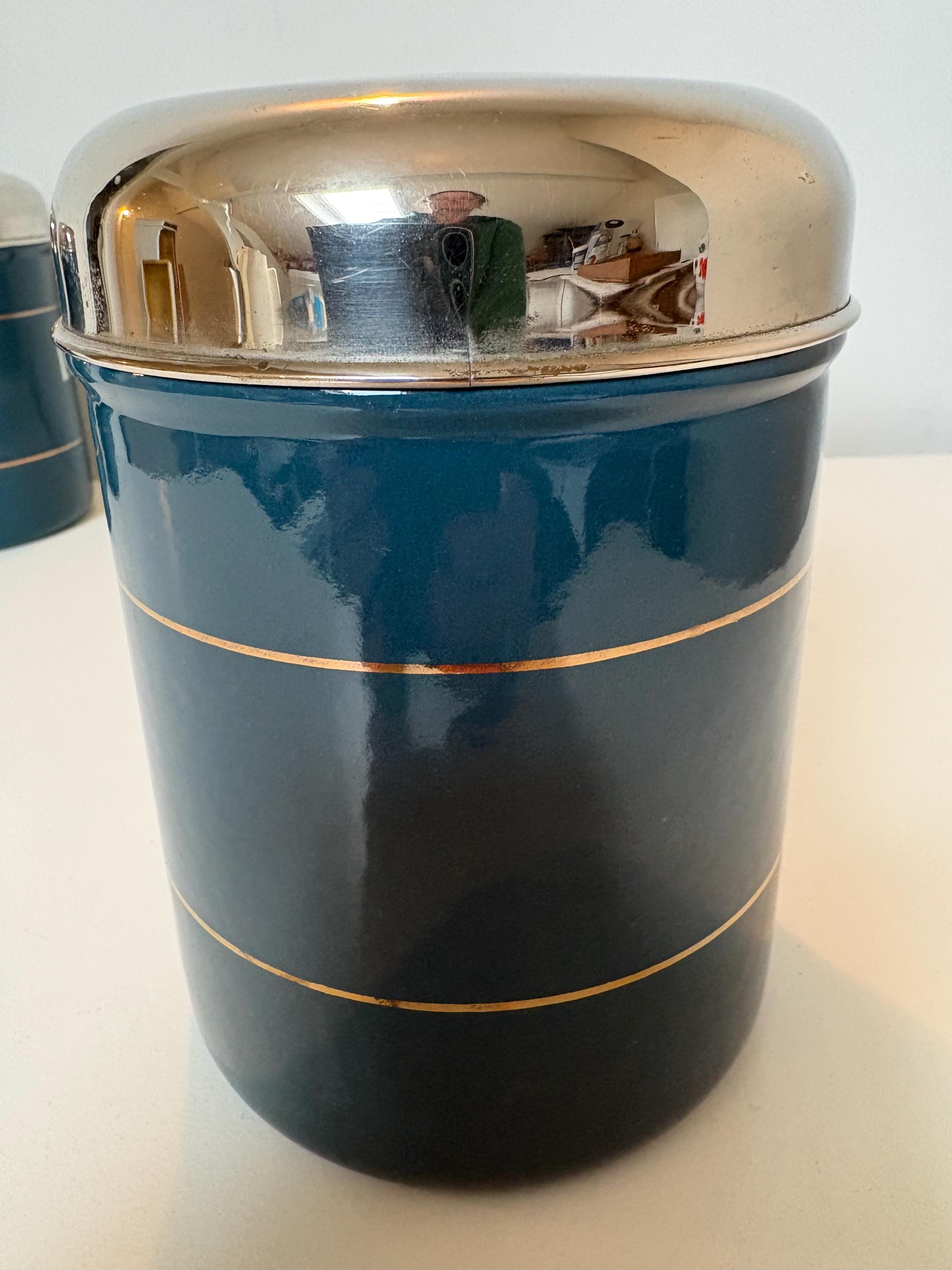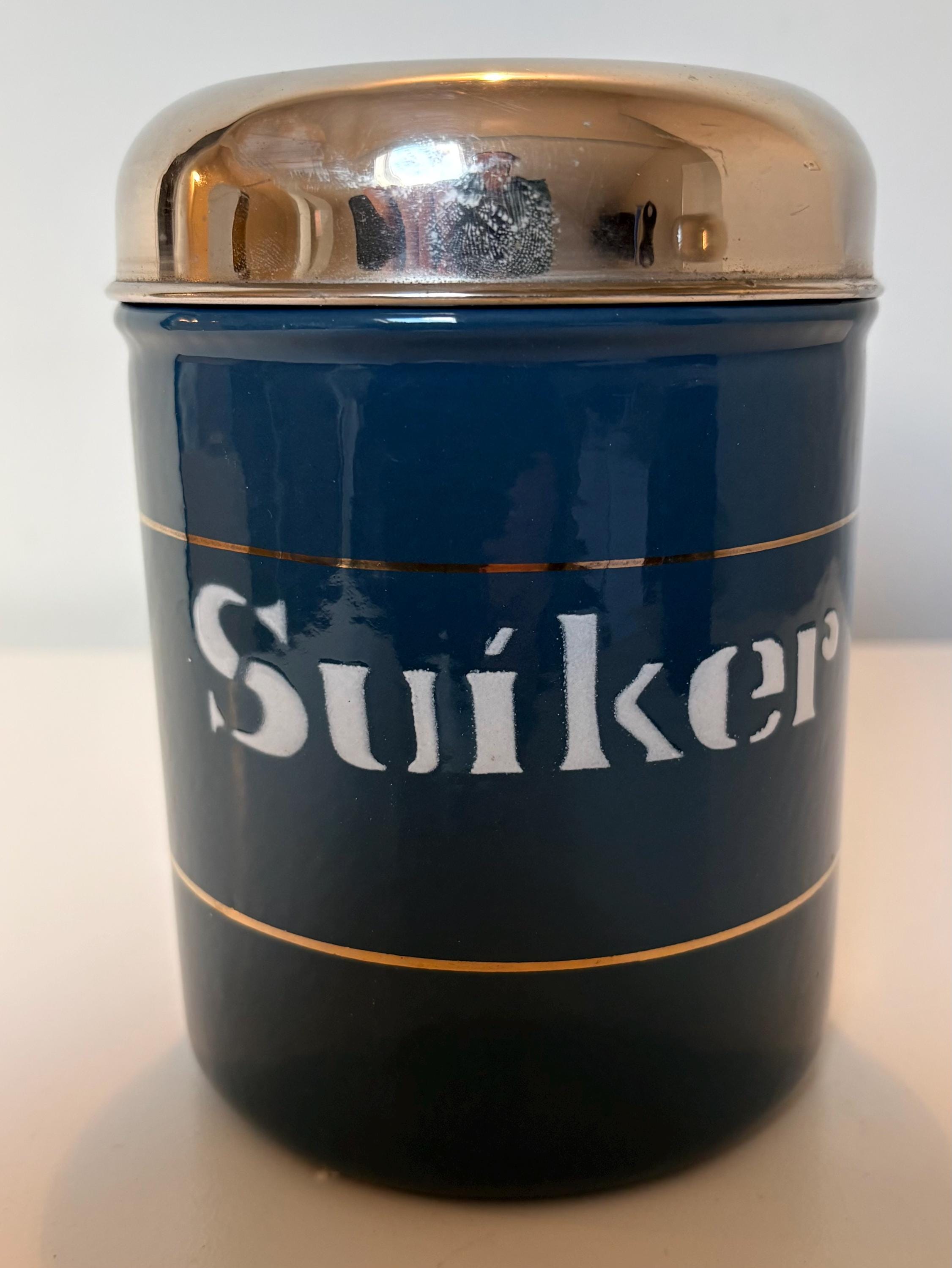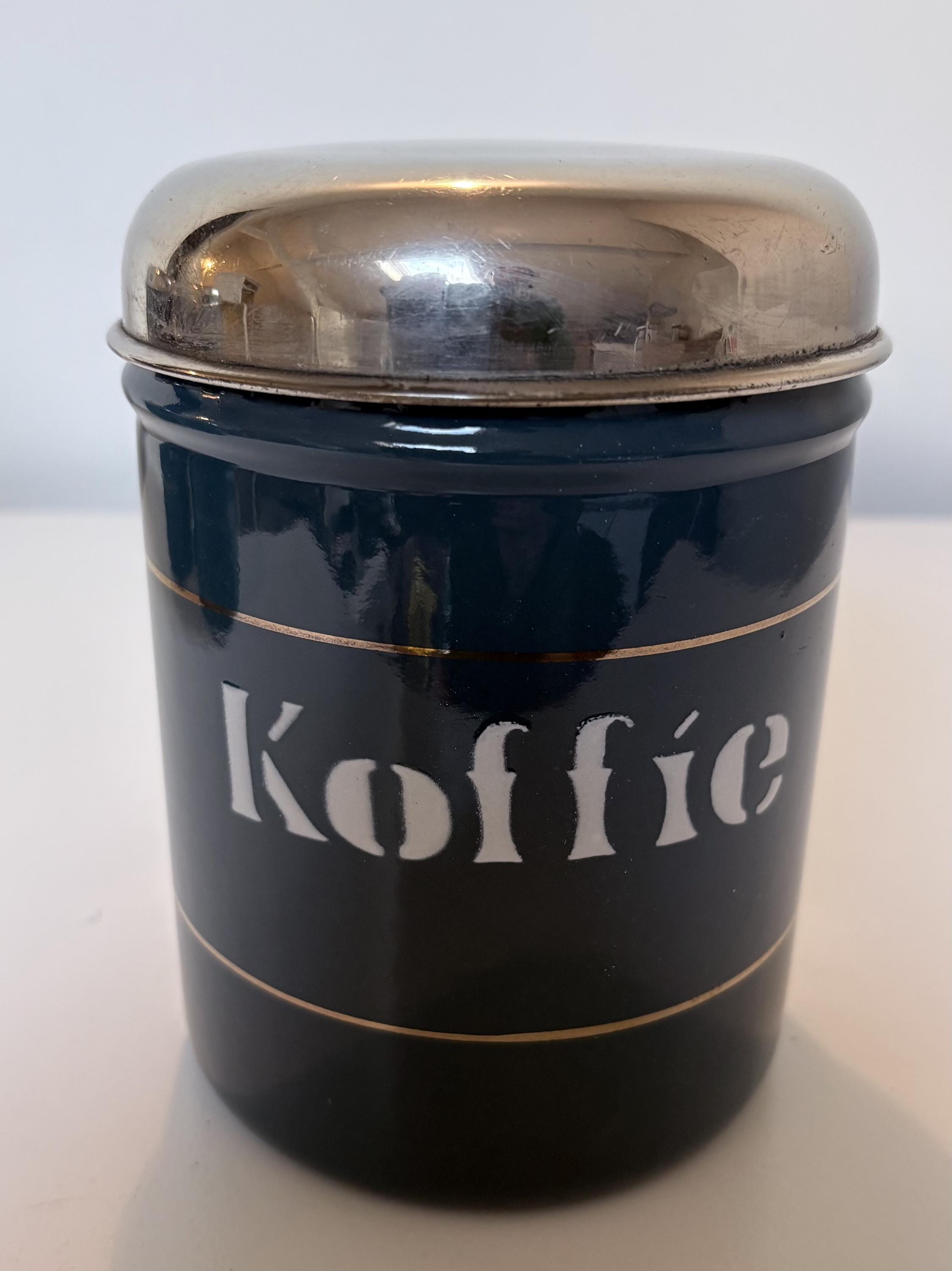 Dutch vintage enamel storage containers coffee, tea, sugar, coffee, tea, sugar, in blue, set of 3, Manufactured in the Netherlands 1950s