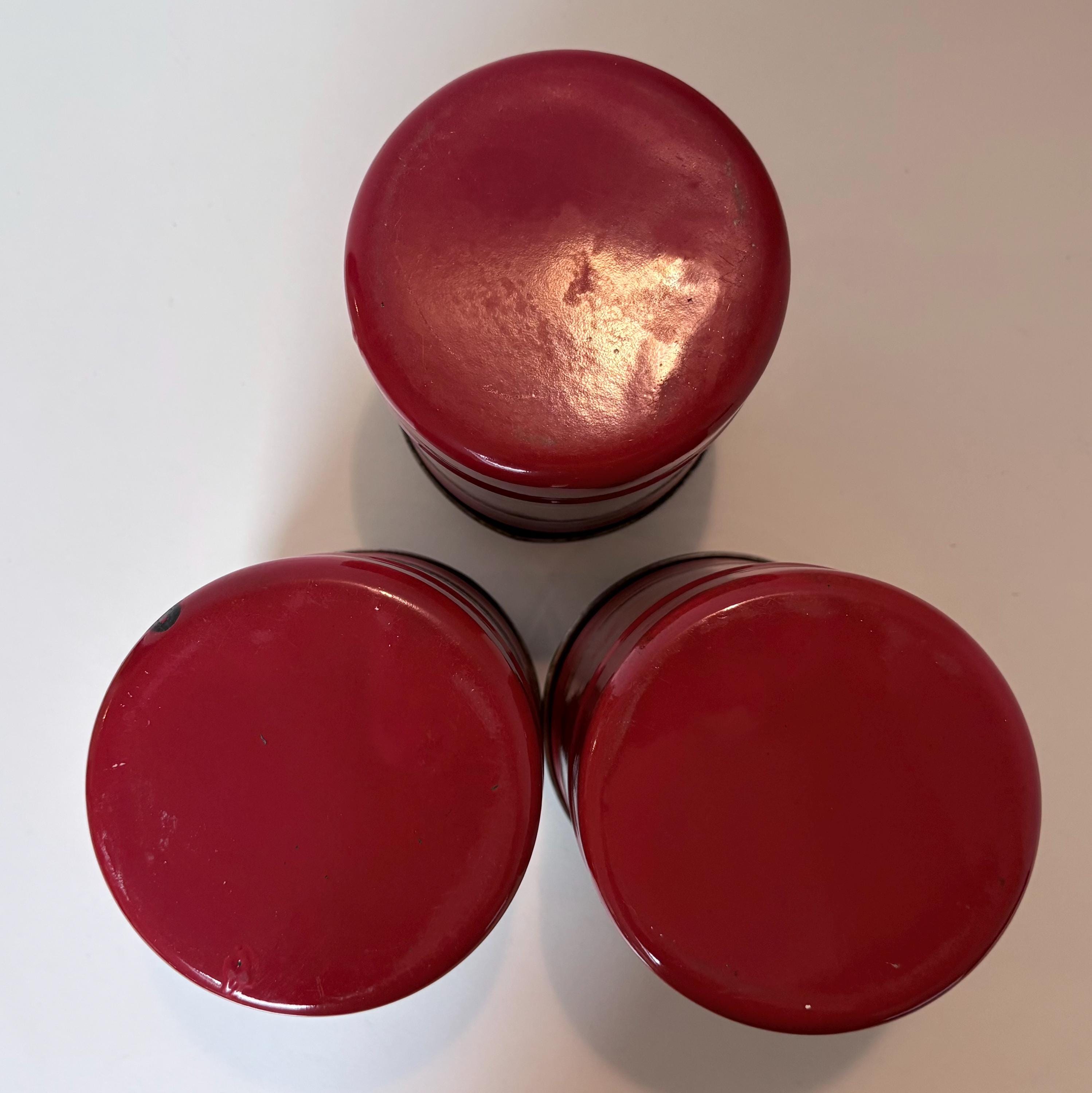 Set of 3 very decorative vintage red enamel metal storage containers with metal lid The containers are marked Coffee (coffee), Tea (tea) and Sugar (sugar) in white embossed letters. Mid century modern kitchenware from the 1950s.