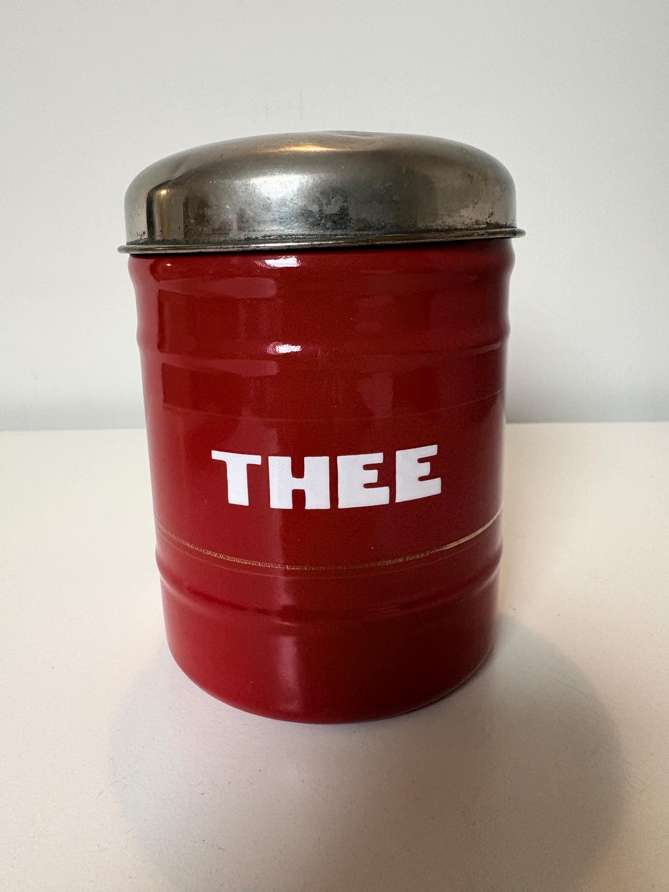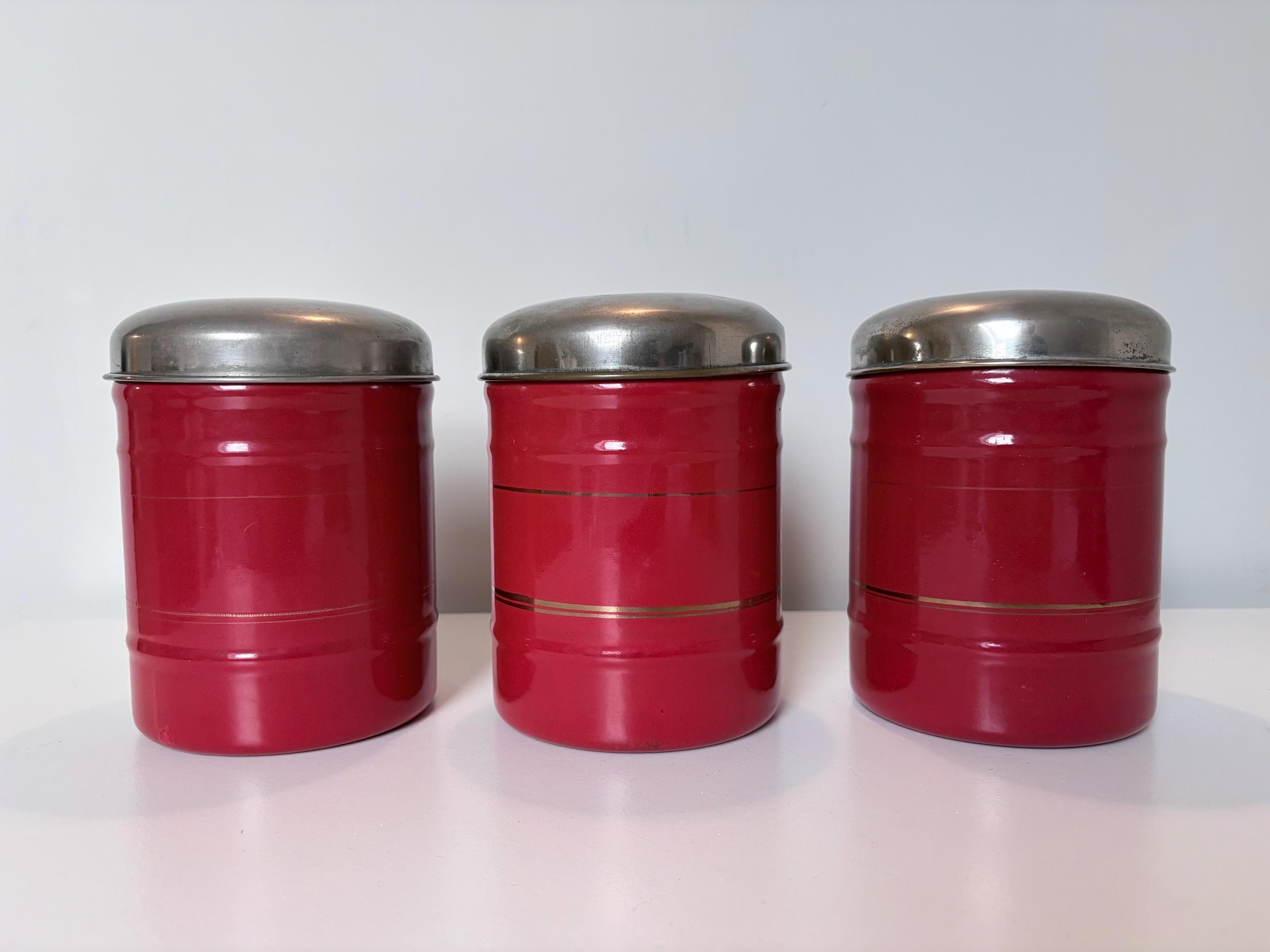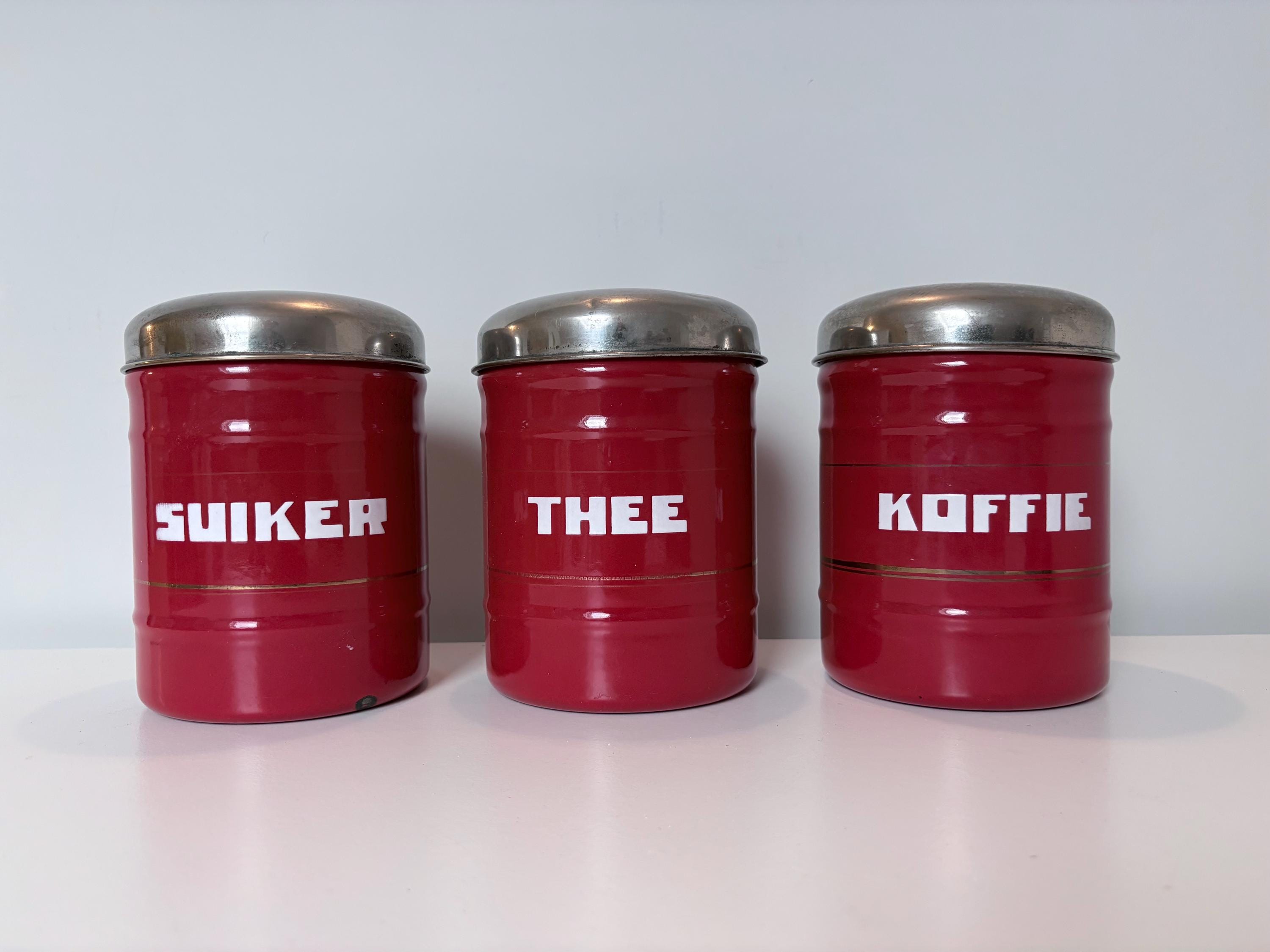 Dutch vintage enamel storage containers coffee, tea, sugar, coffee, tea, sugar, in red, set of 3, Manufactured in the Netherlands 1950s