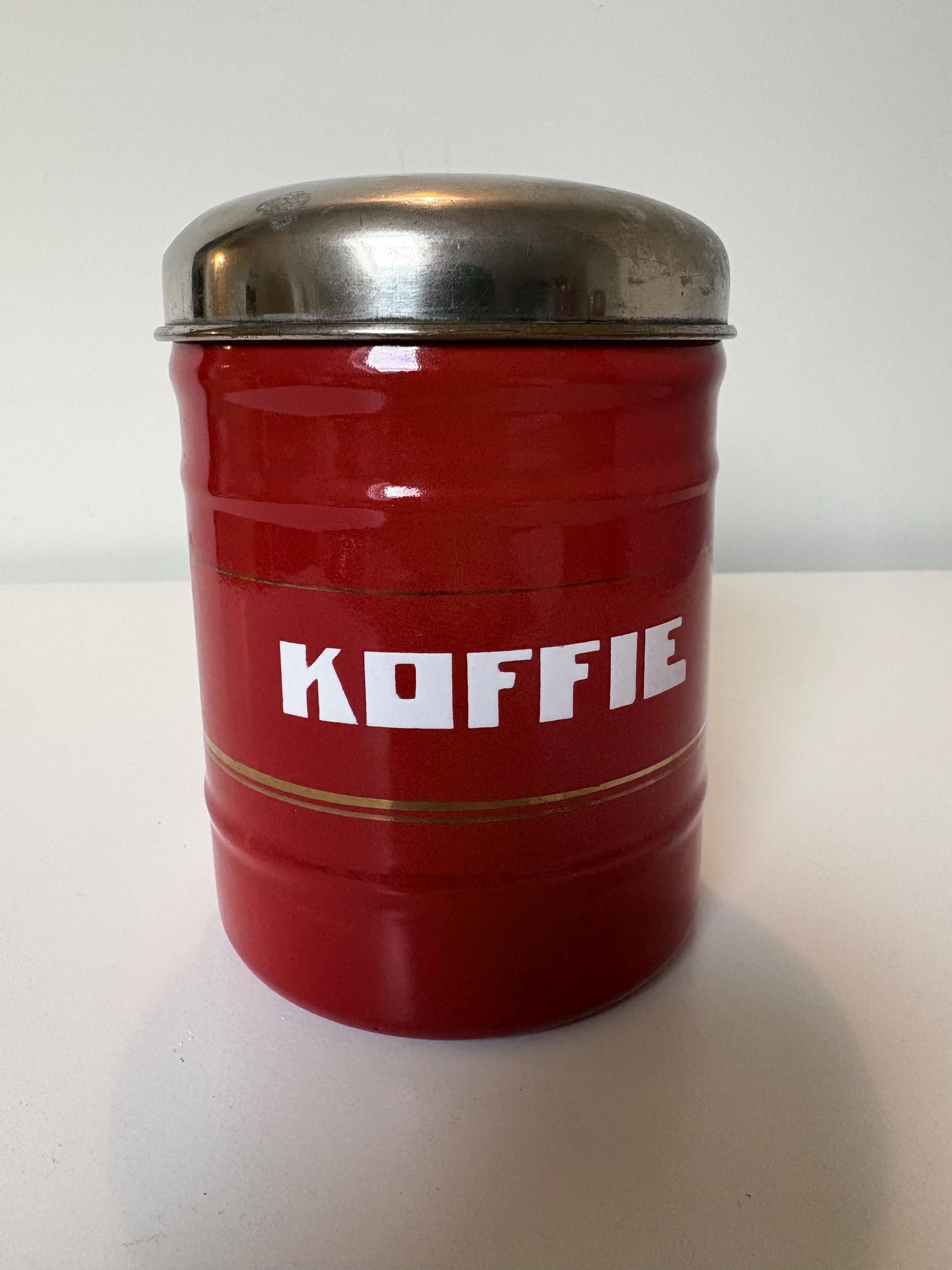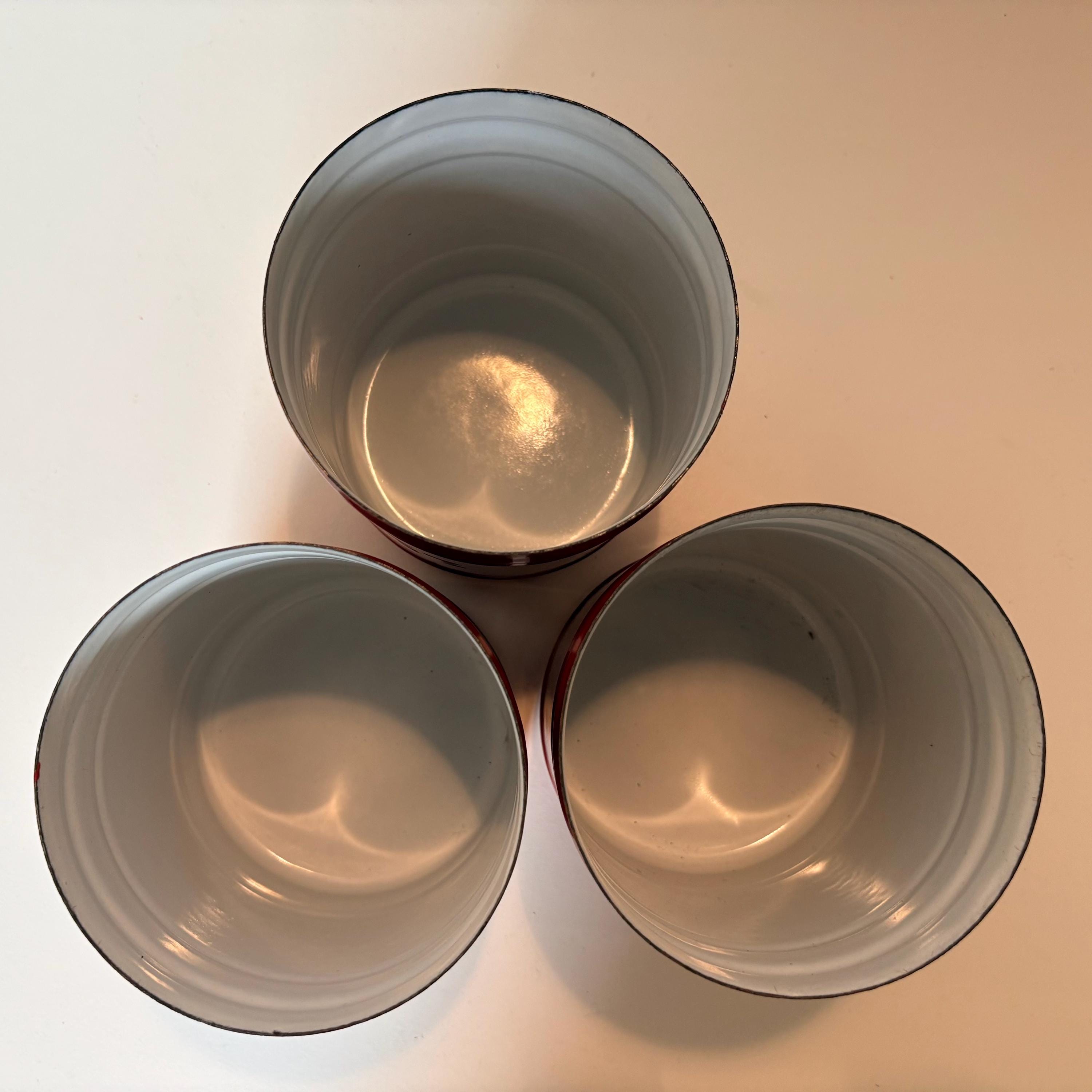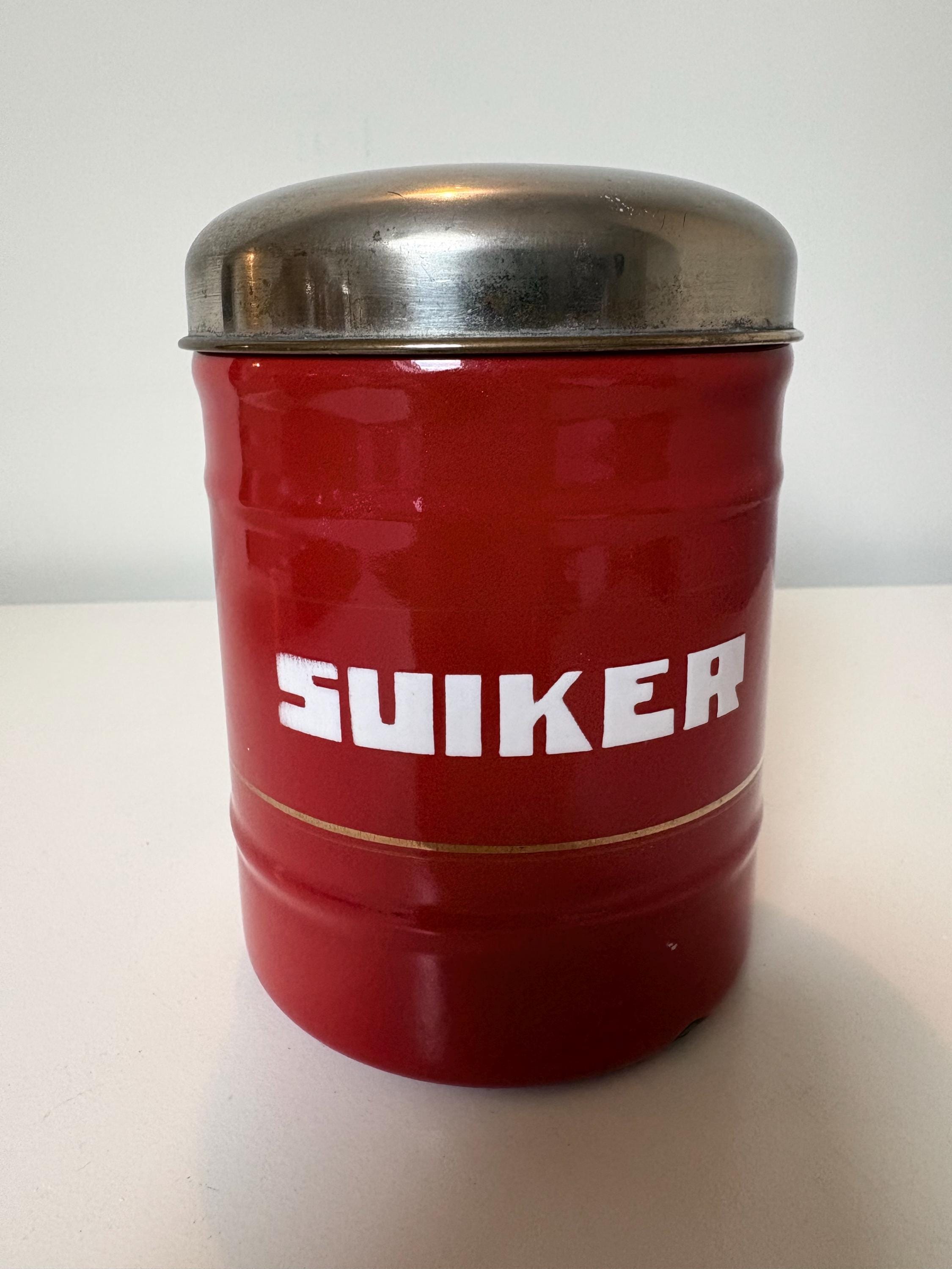 Dutch vintage enamel storage containers coffee, tea, sugar, coffee, tea, sugar, in red, set of 3, Manufactured in the Netherlands 1950s