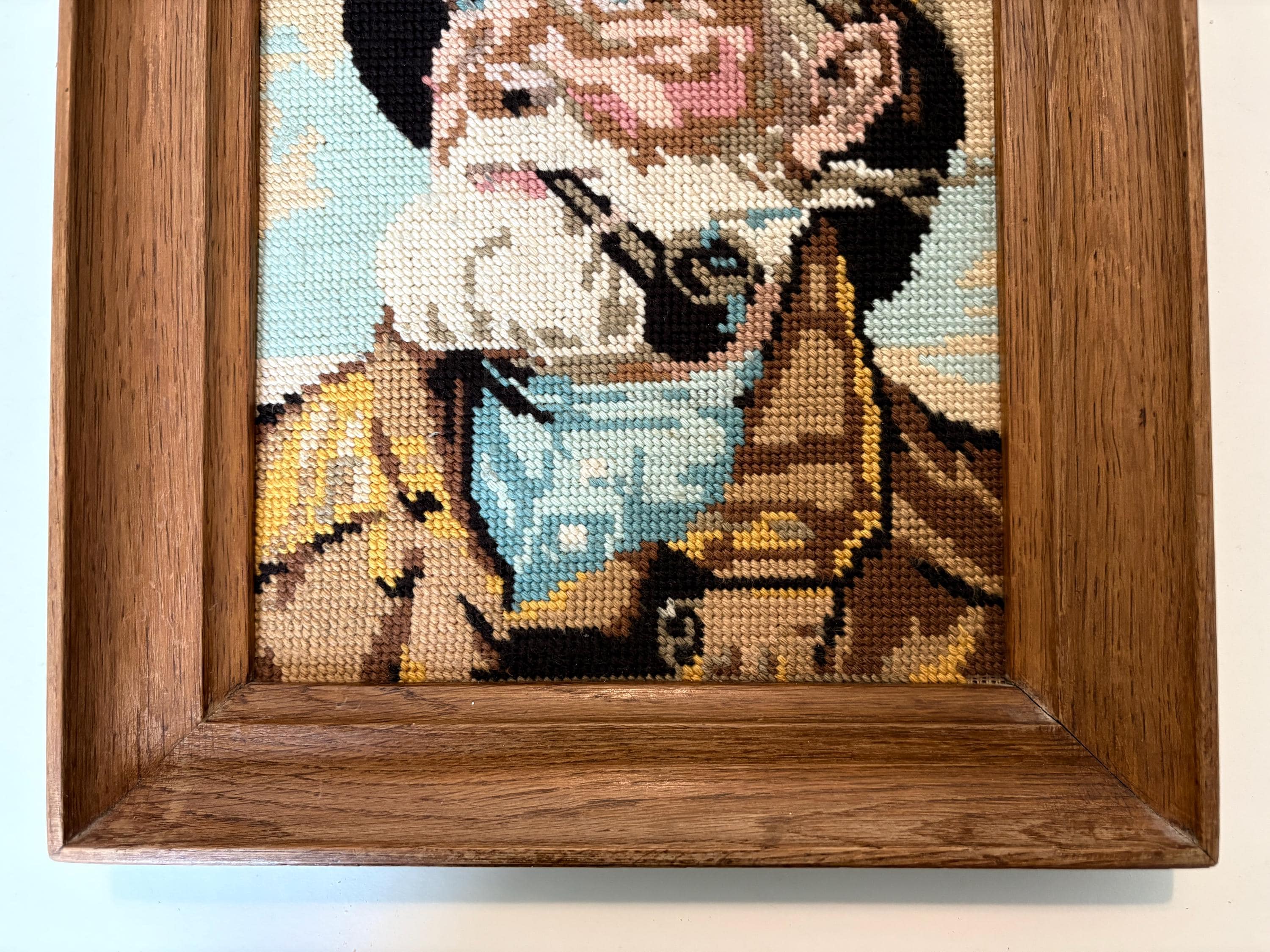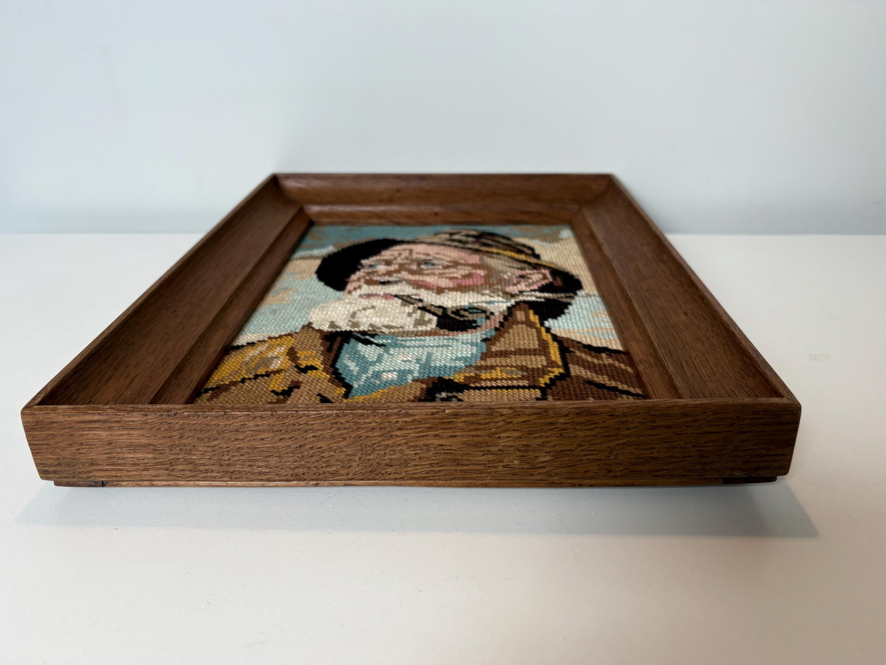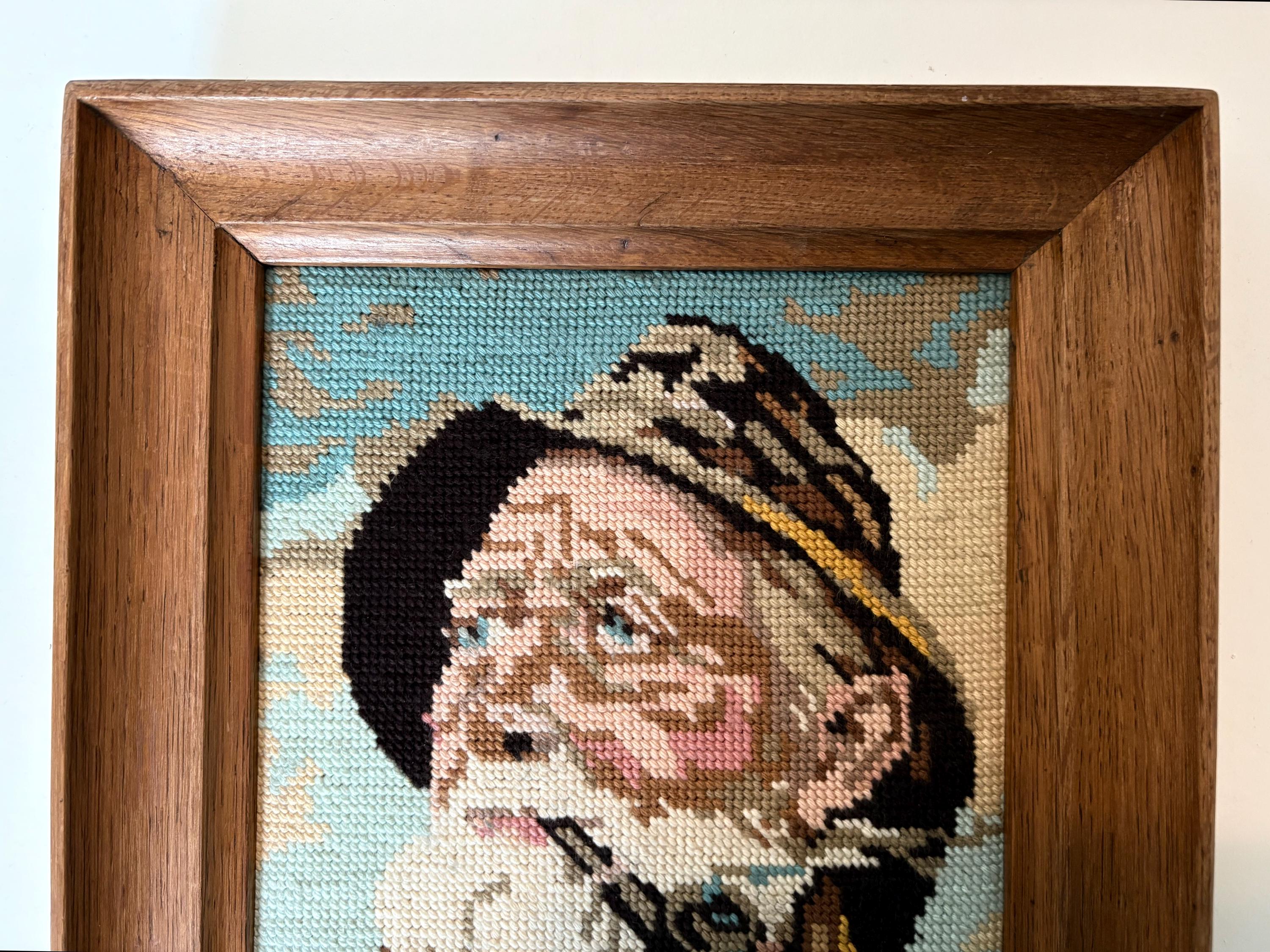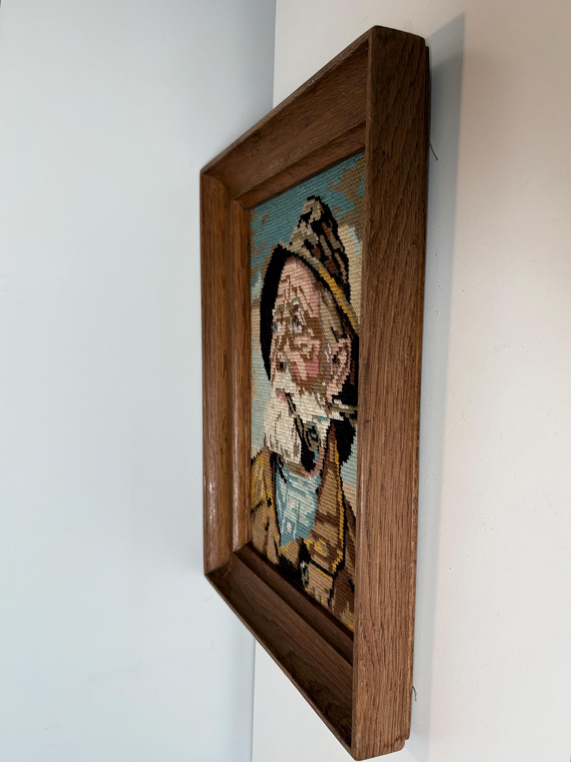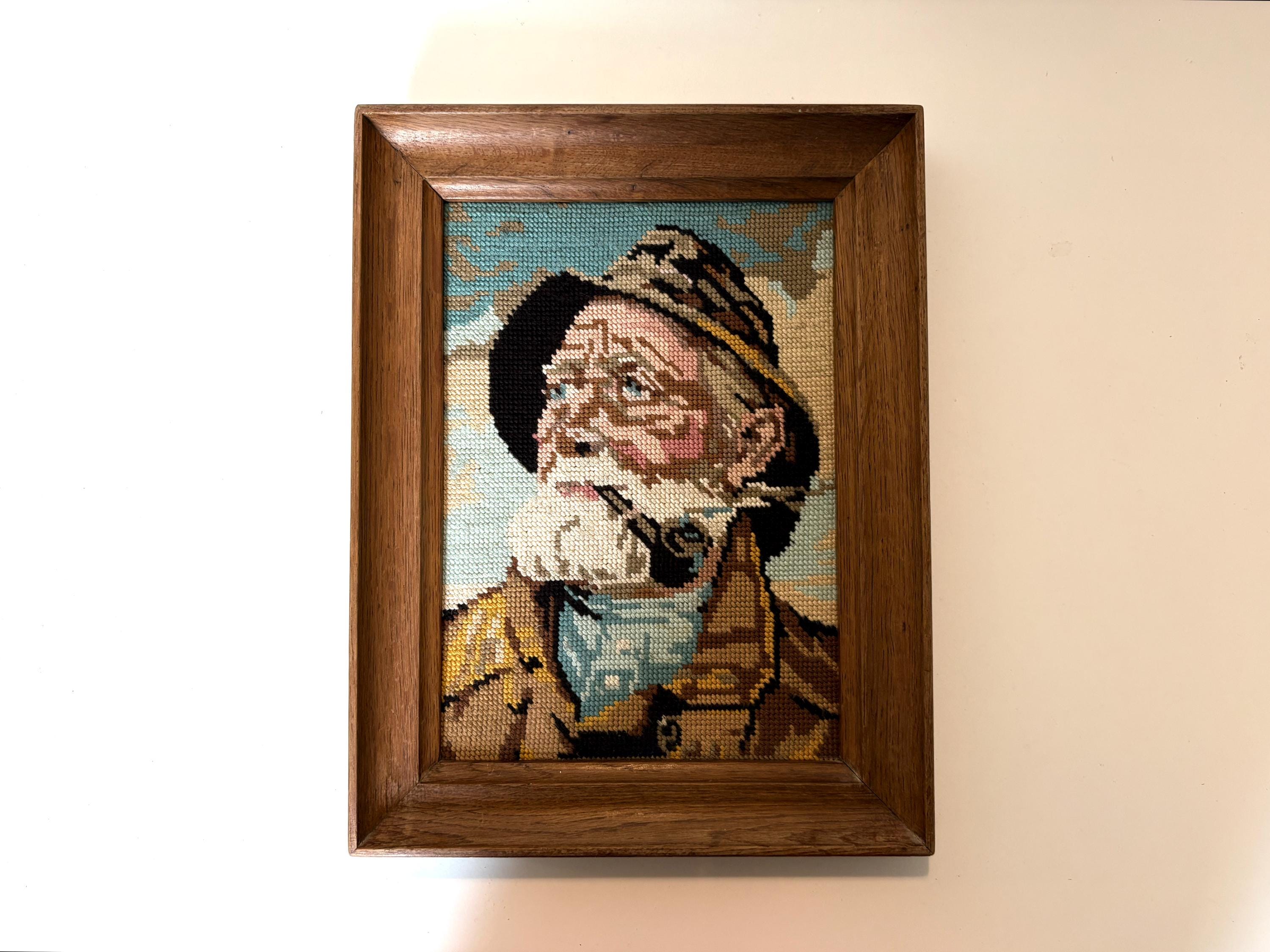 Very nice vintage wood framed embroidery portrait of Dorus Rijkers, a pipe-smoking fisherman, an old sailor. Mid-century wall art from the 1970s. Original by Harry Haerendel.