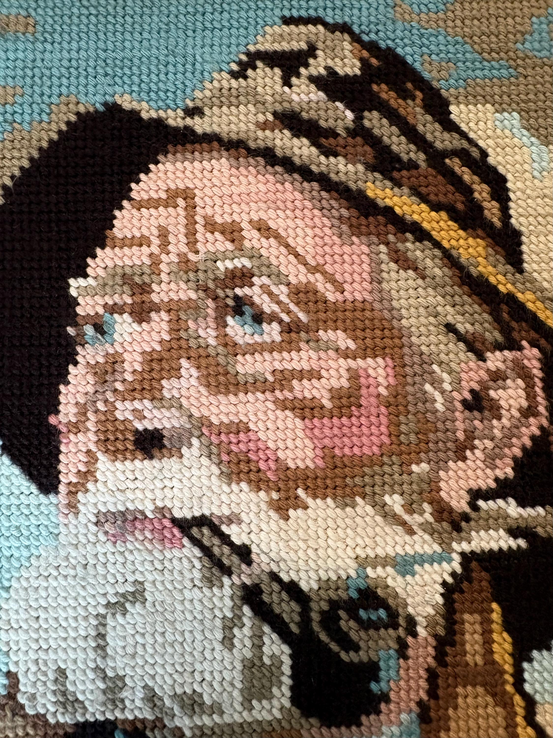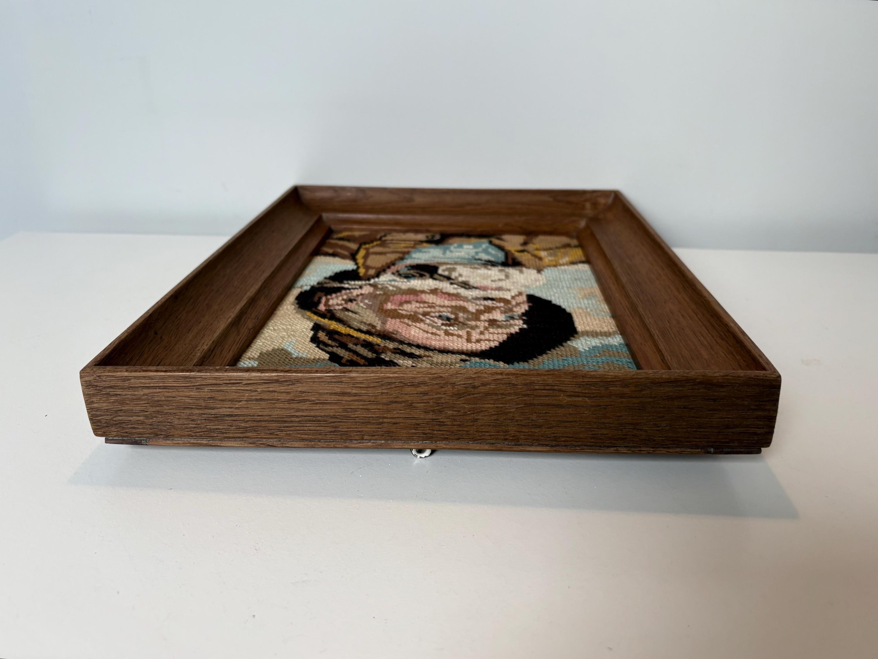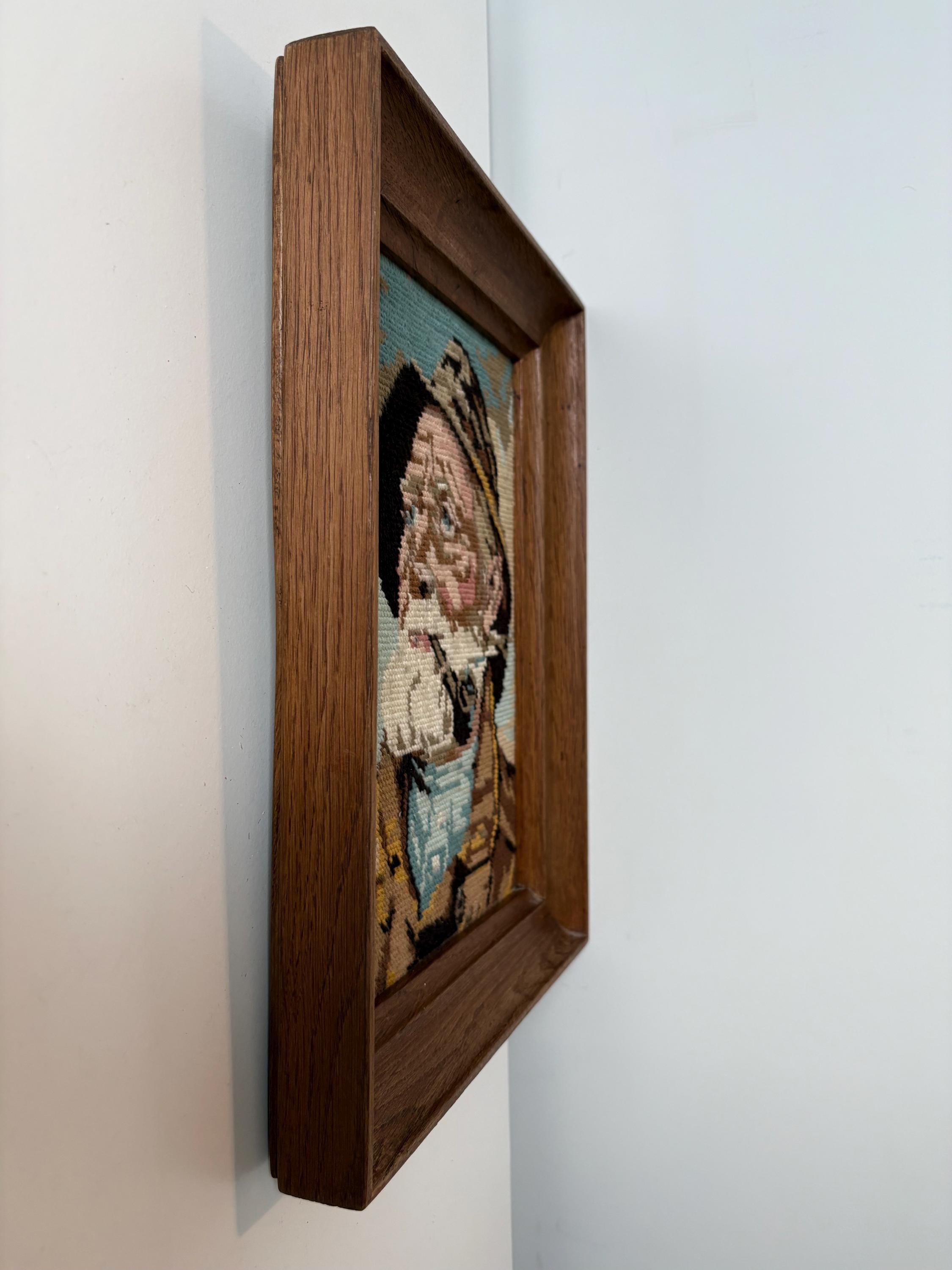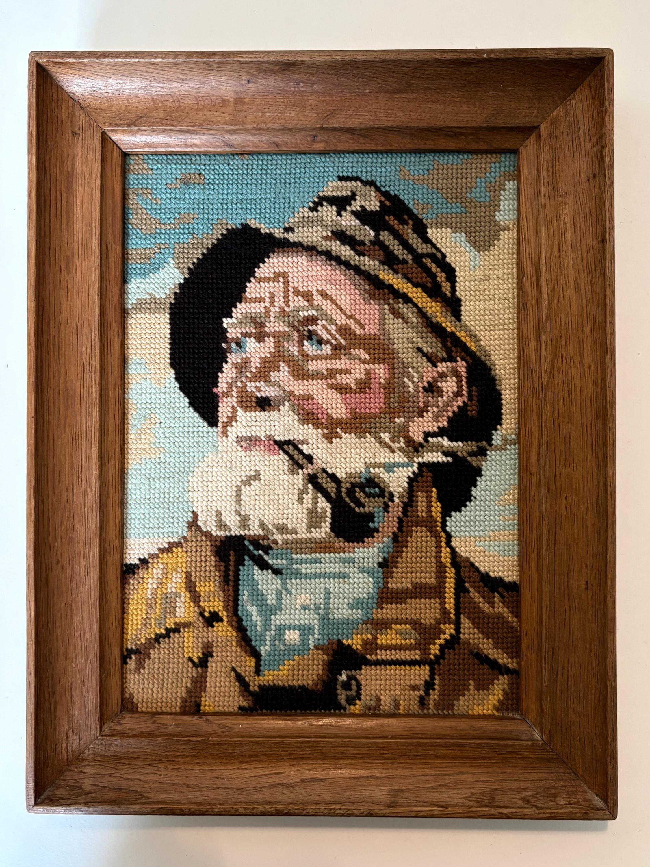 Vintage embroidery framed portrait of Dorus Rijkers, a pipe-smoking fisherman, mid century wall art 1970s, Original by Harry Haerendel