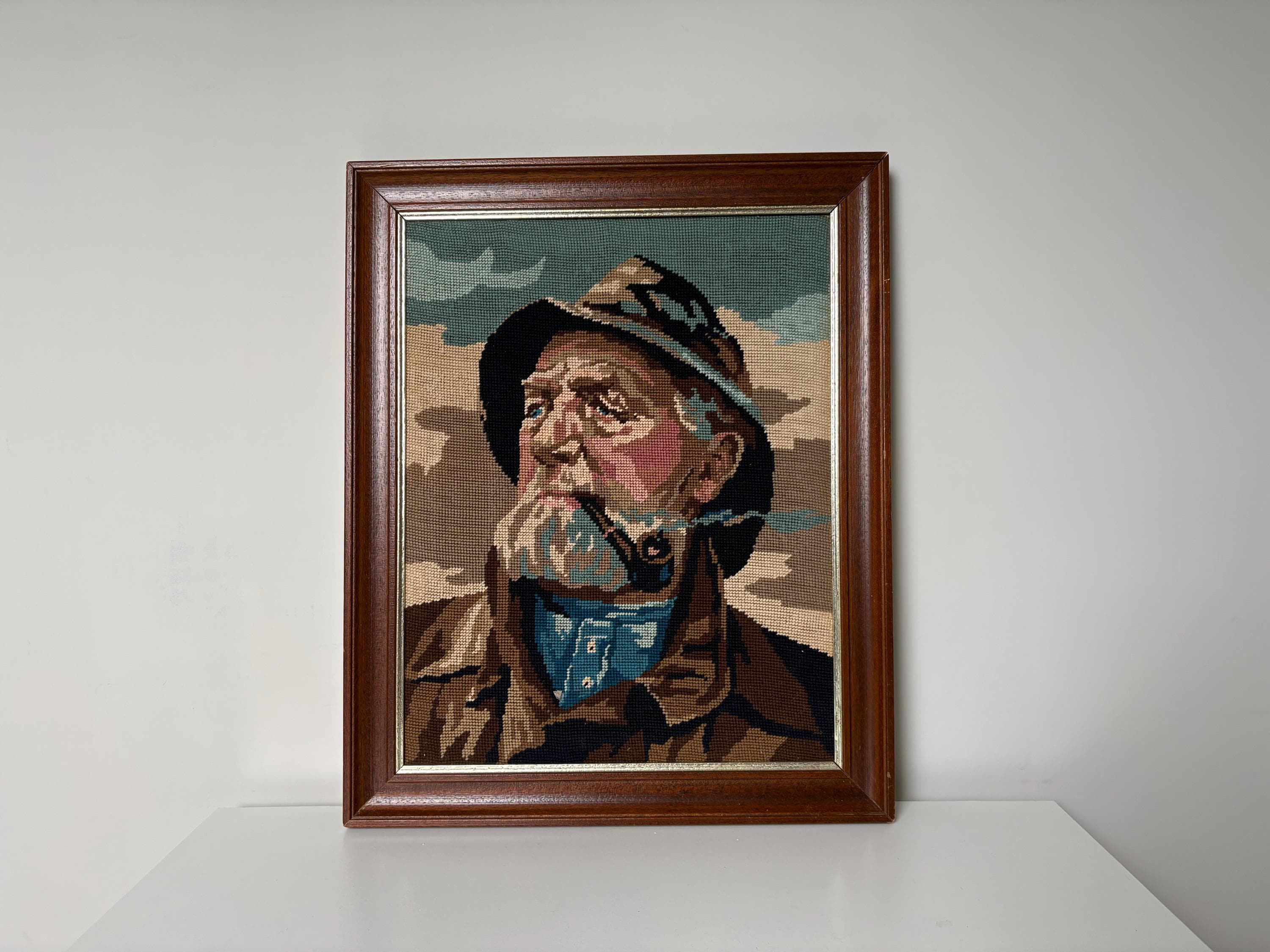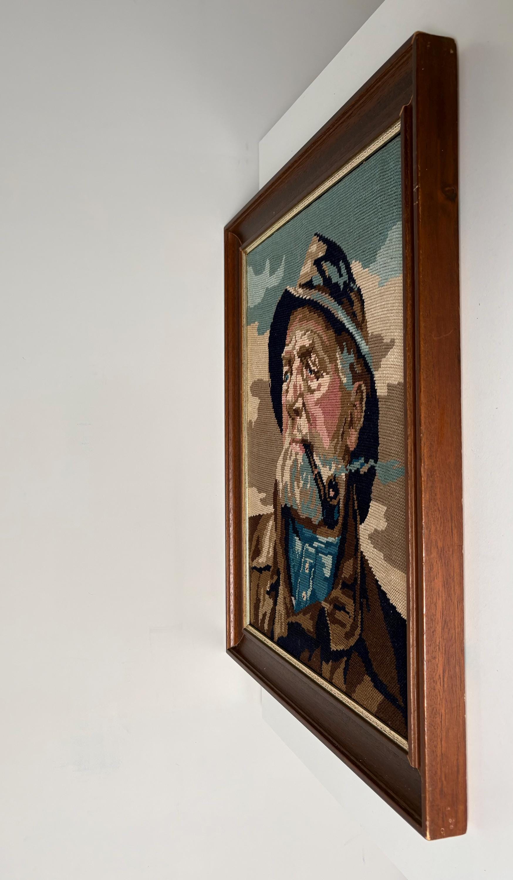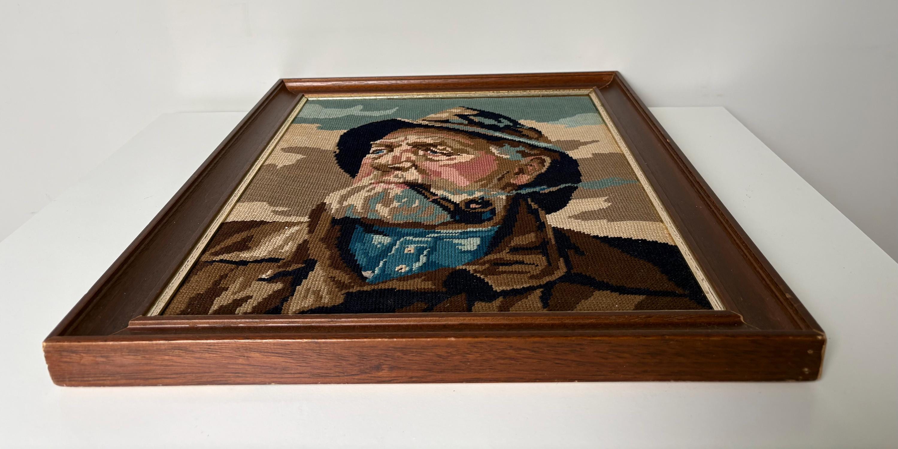 Very nice large vintage wood framed embroidery portrait of Dorus Rijkers, a pipe-smoking fisherman, an old sailor. Mid century wall art from the 1970s. Original by Harry Haerendel.