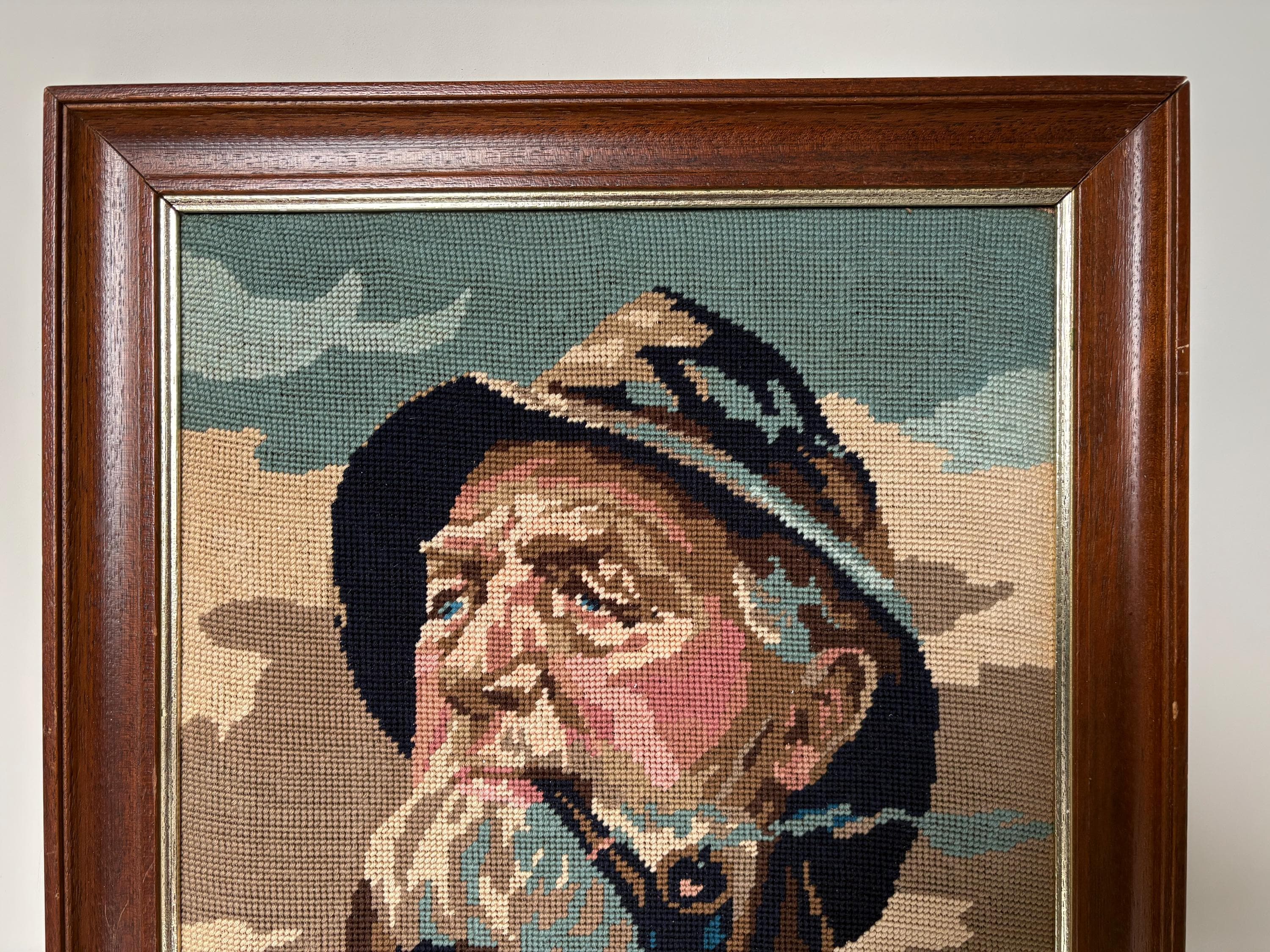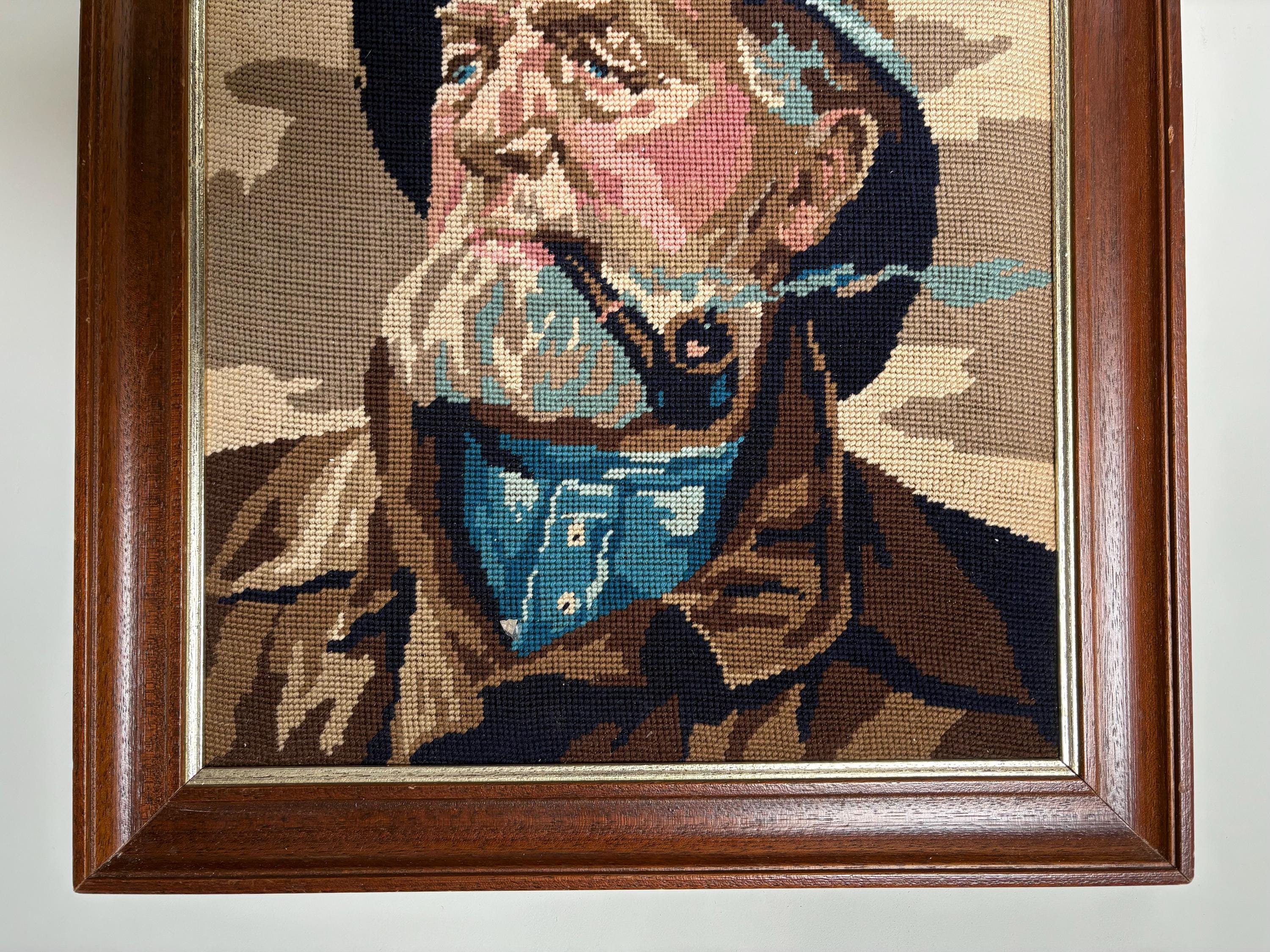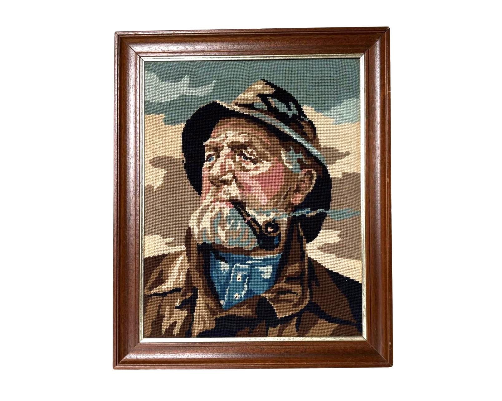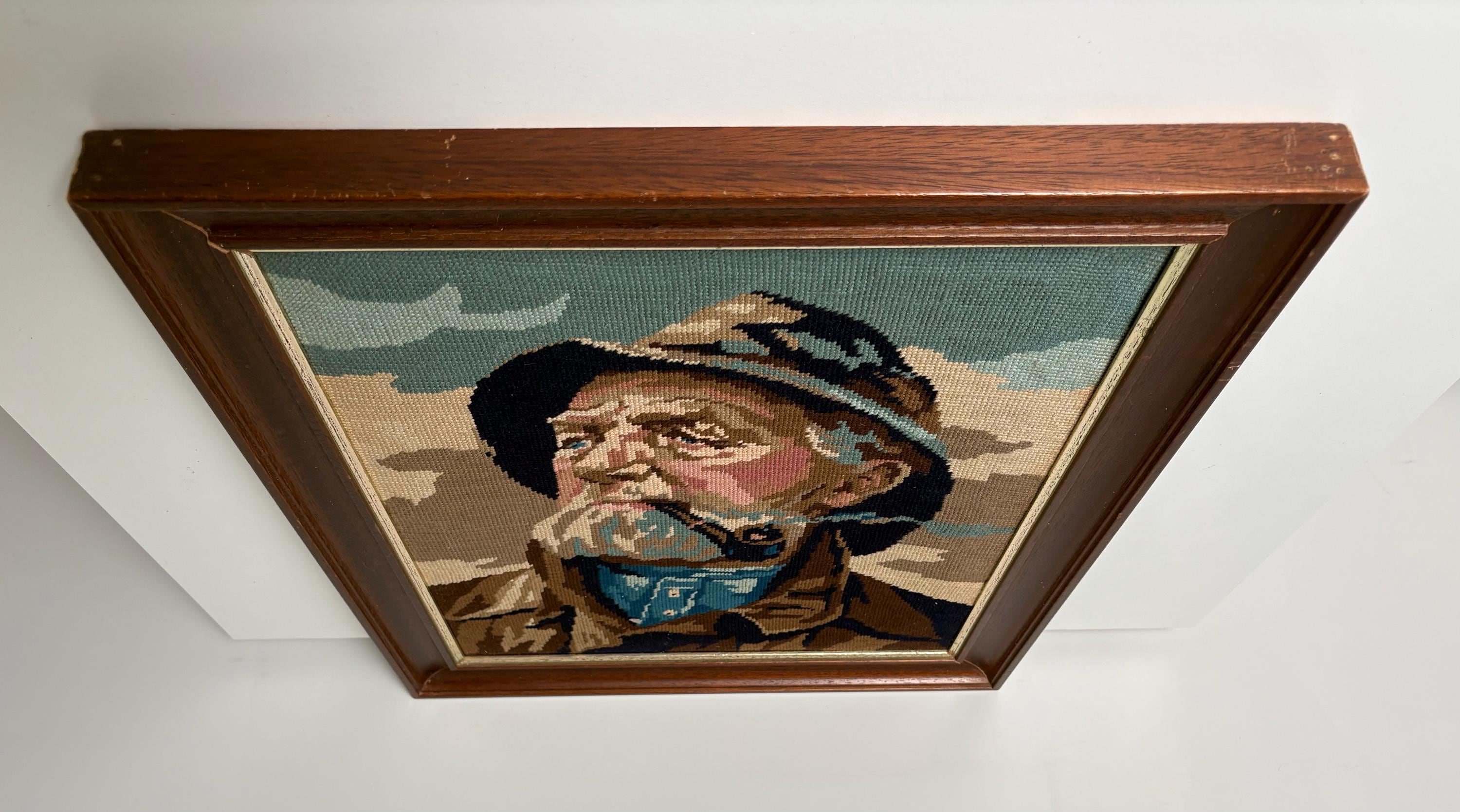 Very nice large vintage wood framed embroidery portrait of Dorus Rijkers, a pipe-smoking fisherman, an old sailor. Mid century wall art from the 1970s. Original by Harry Haerendel.