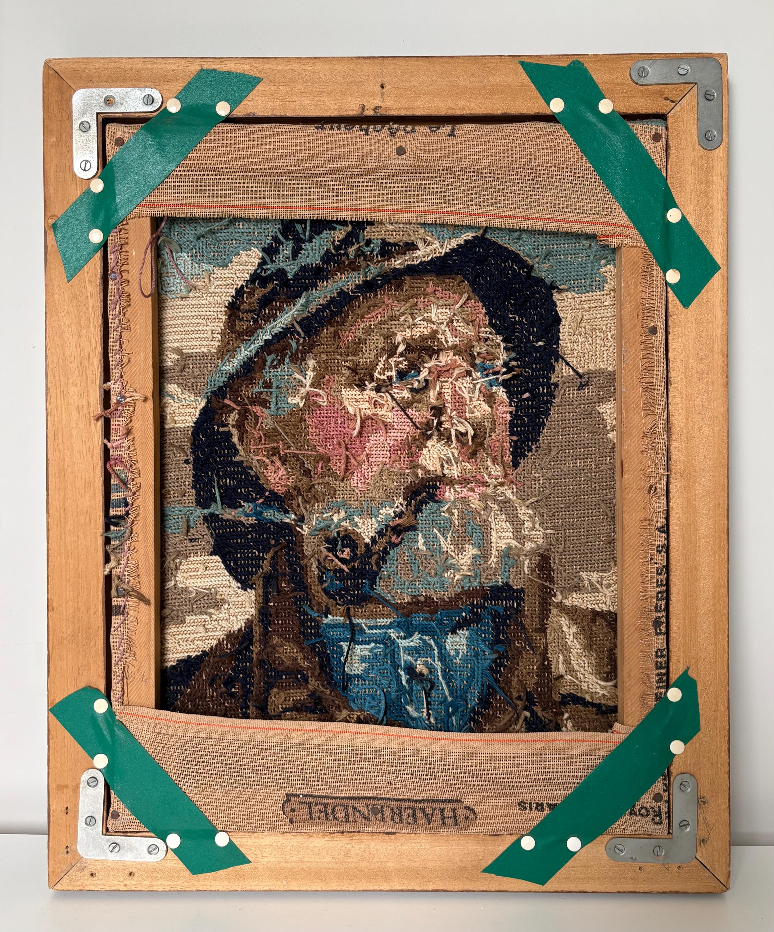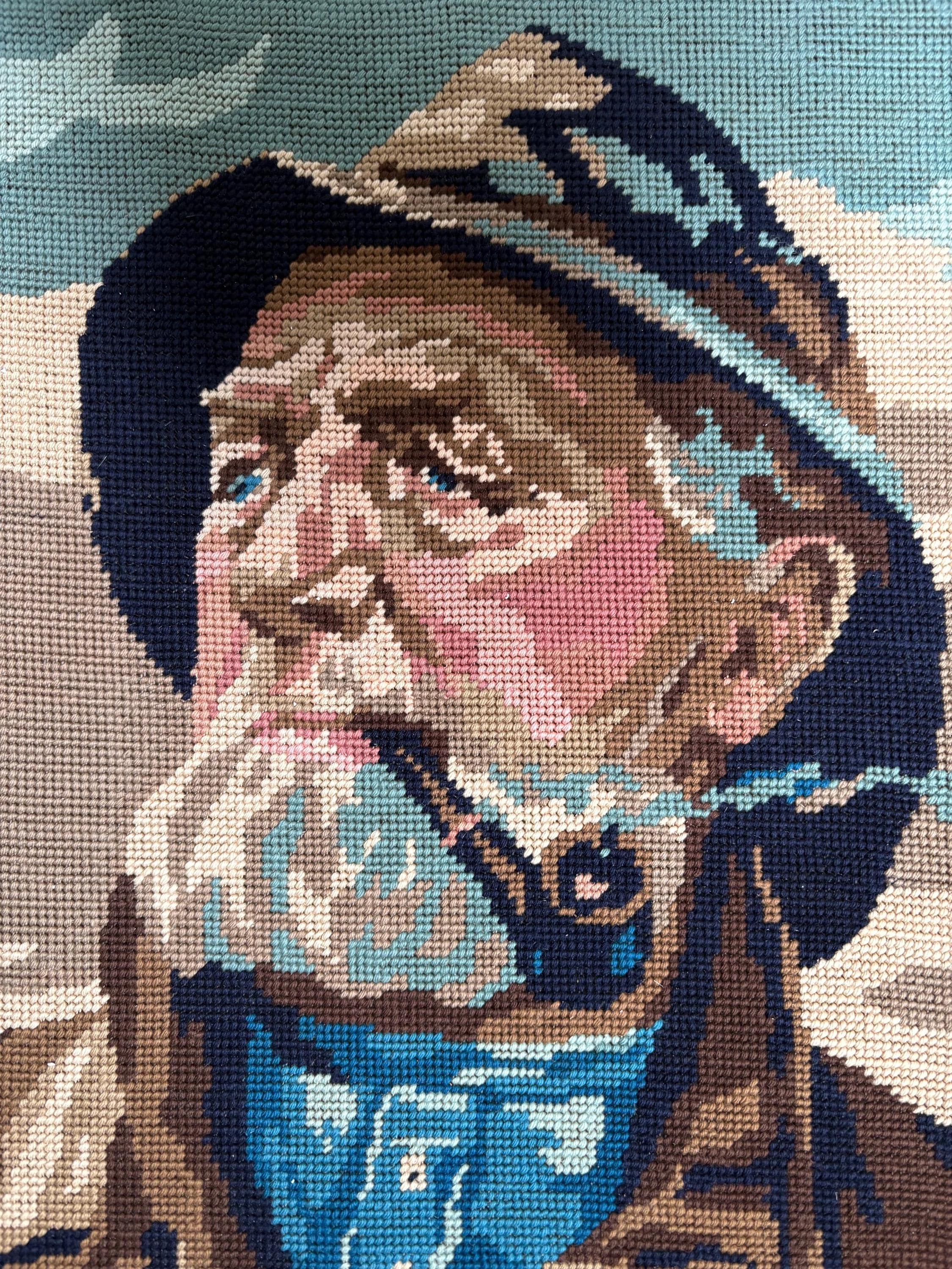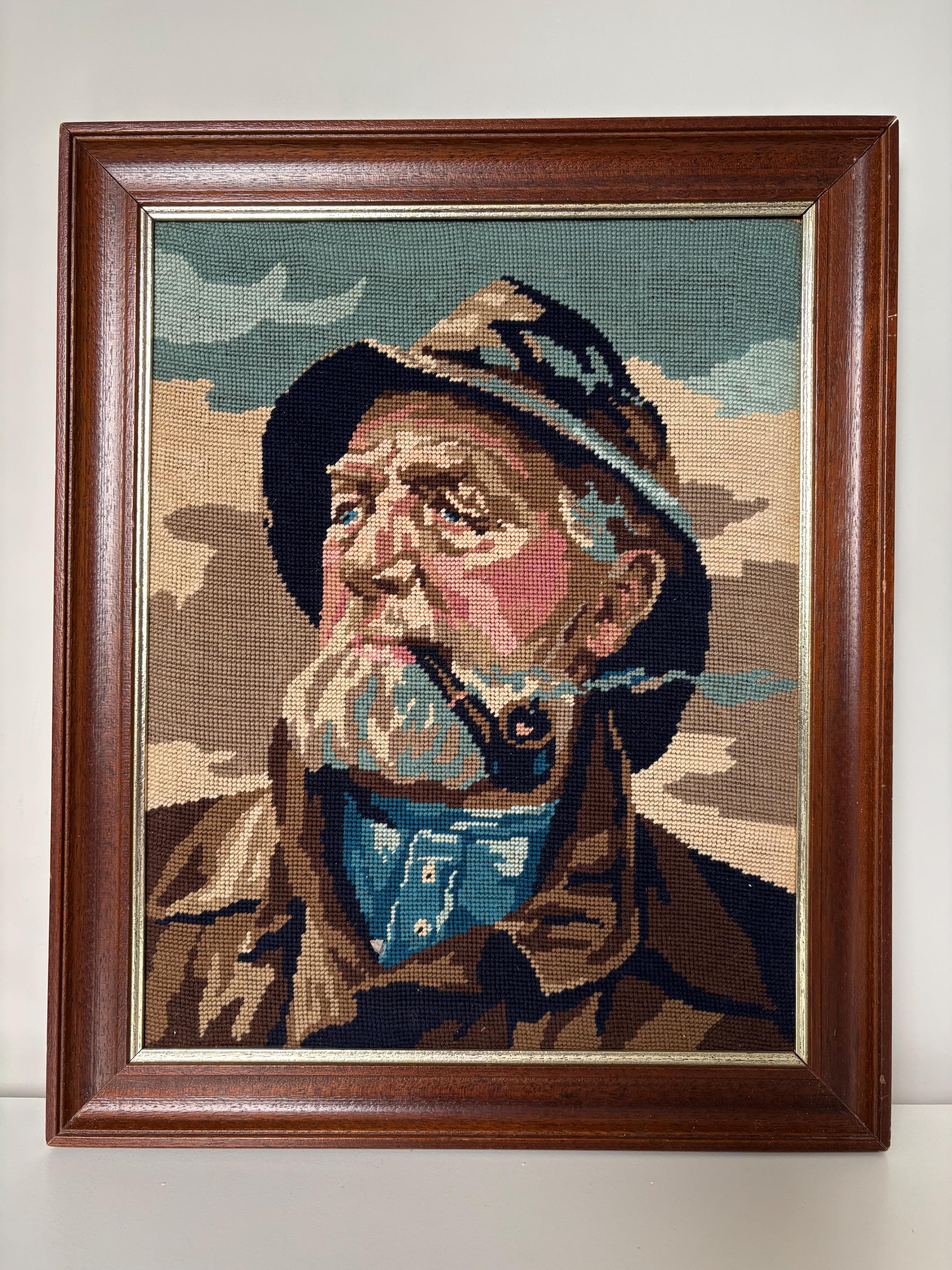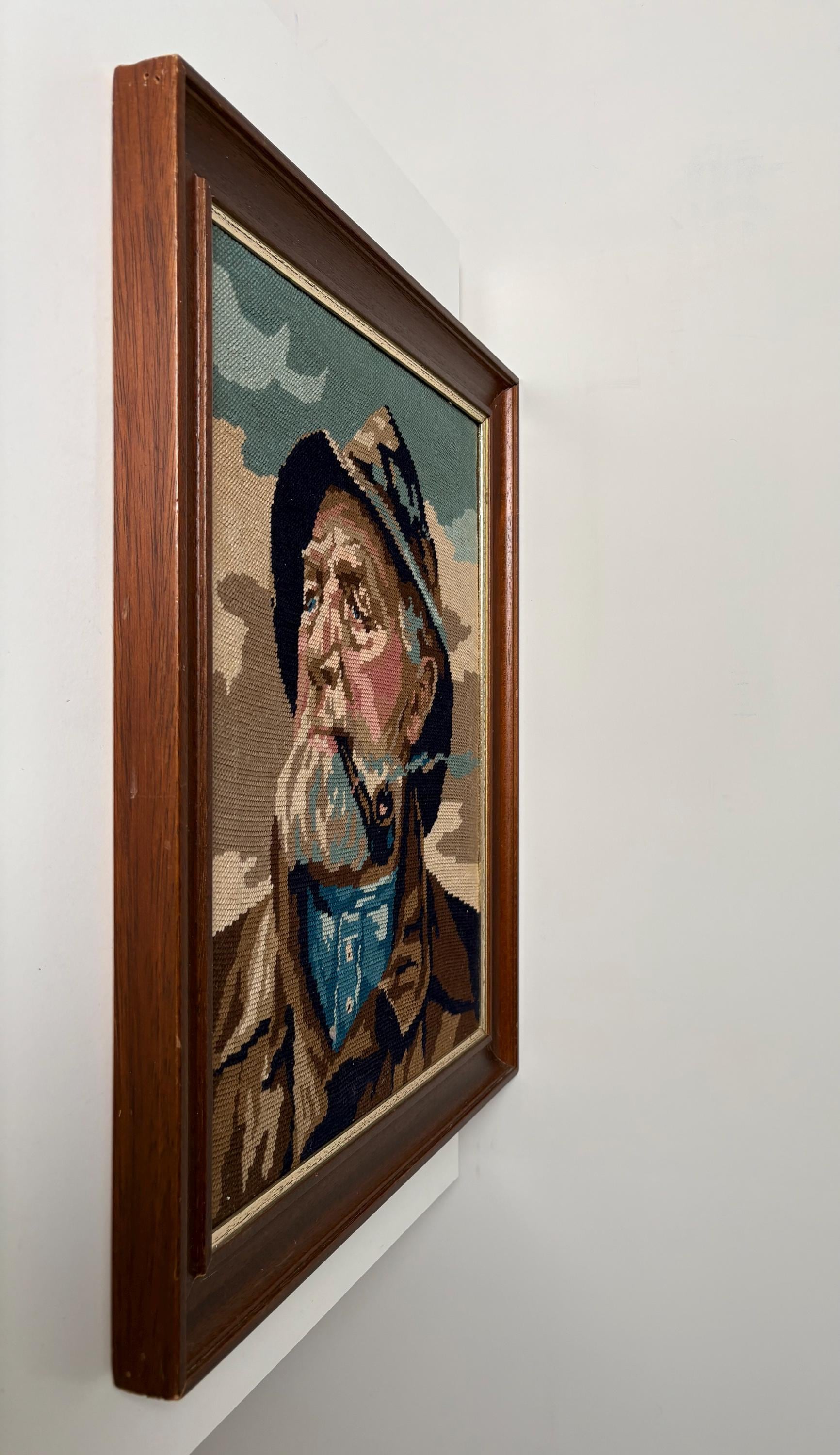 Large vintage embroidery framed portrait of Dorus Rijkers, a pipe-smoking fisherman, mid century wall art 1970s, Original by Harry Haerendel