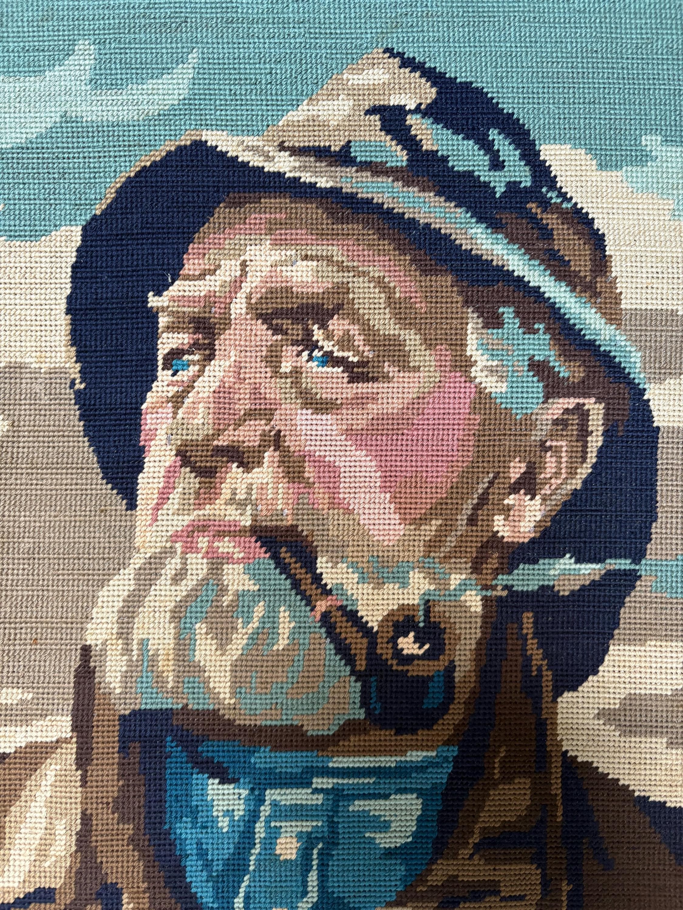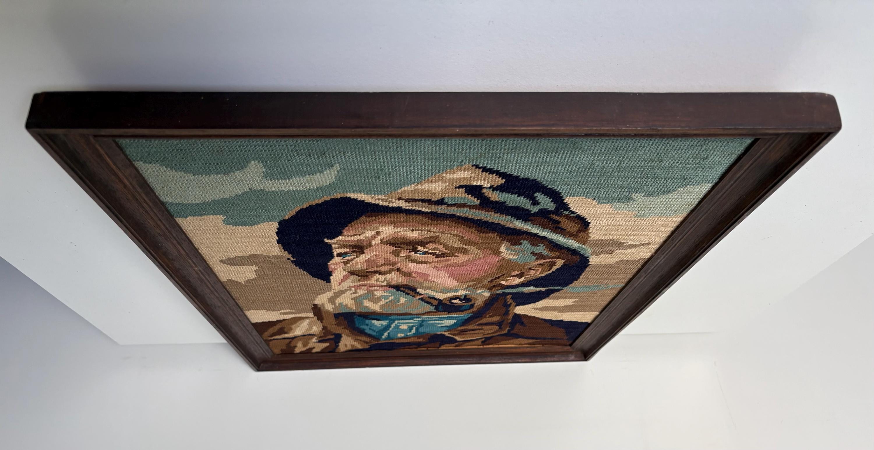 Vintage embroidery framed portrait of Dorus Rijkers, a pipe-smoking fisherman, mid century wall art 1970's, Original by Harry Haerendel