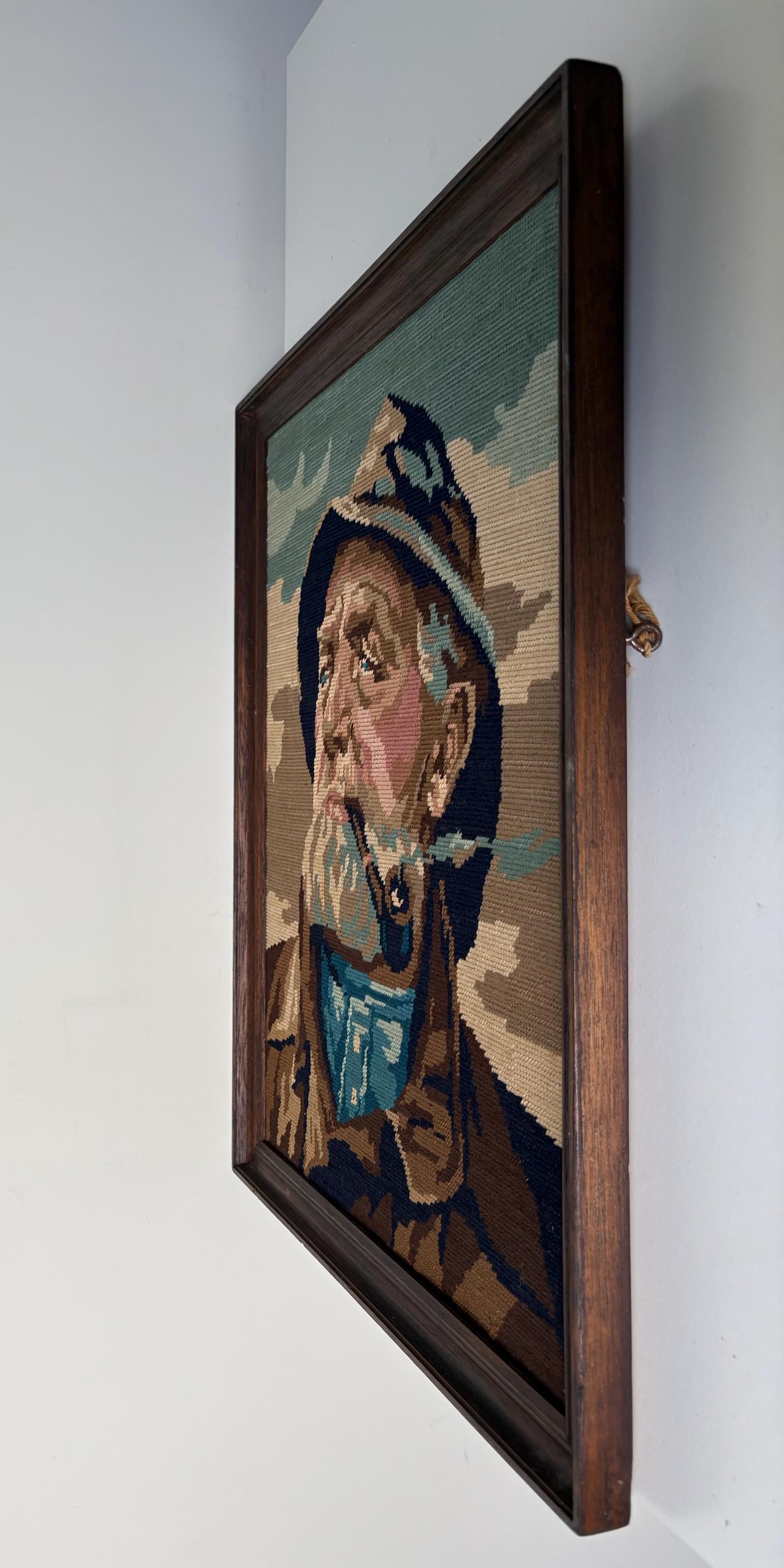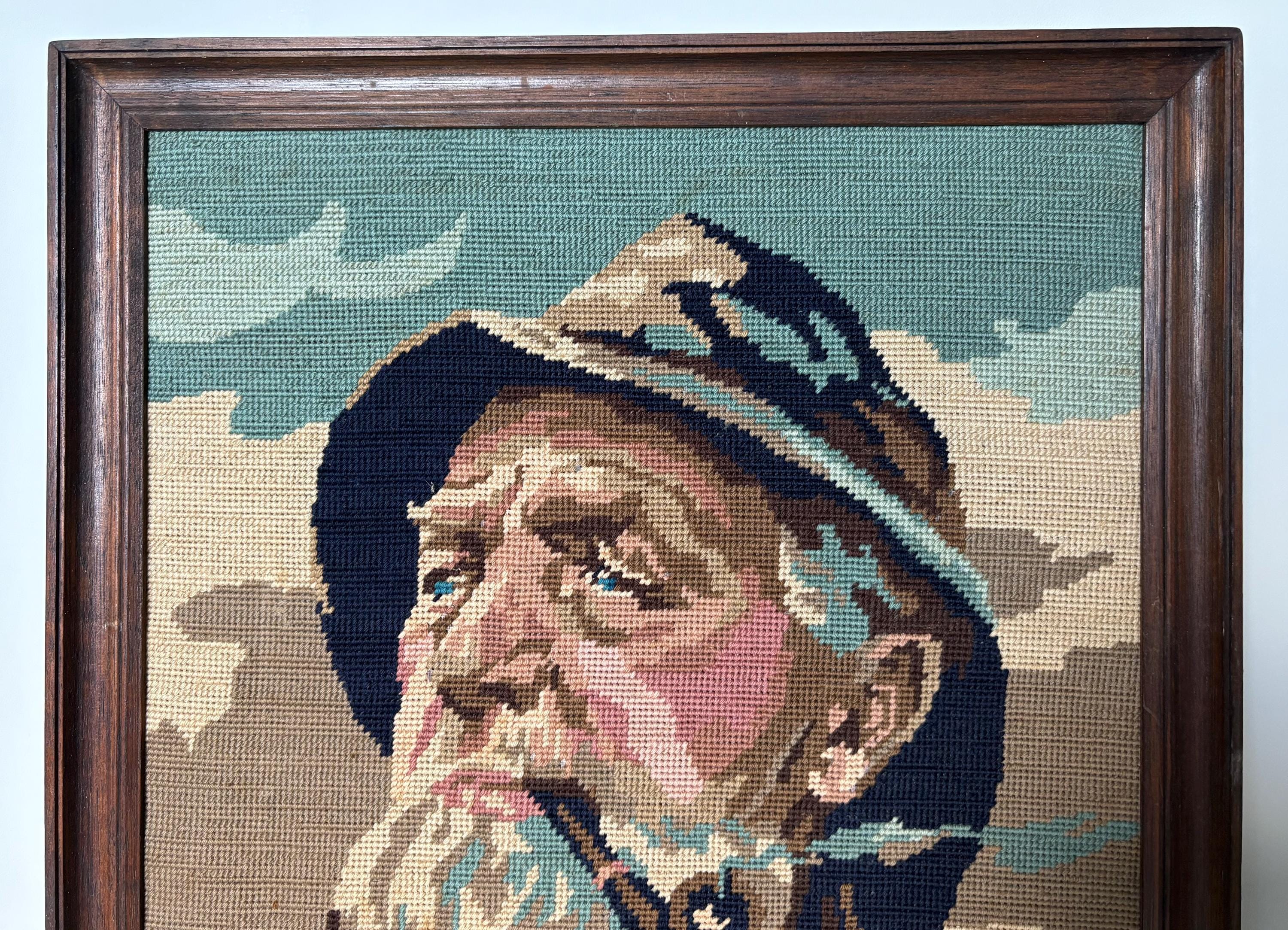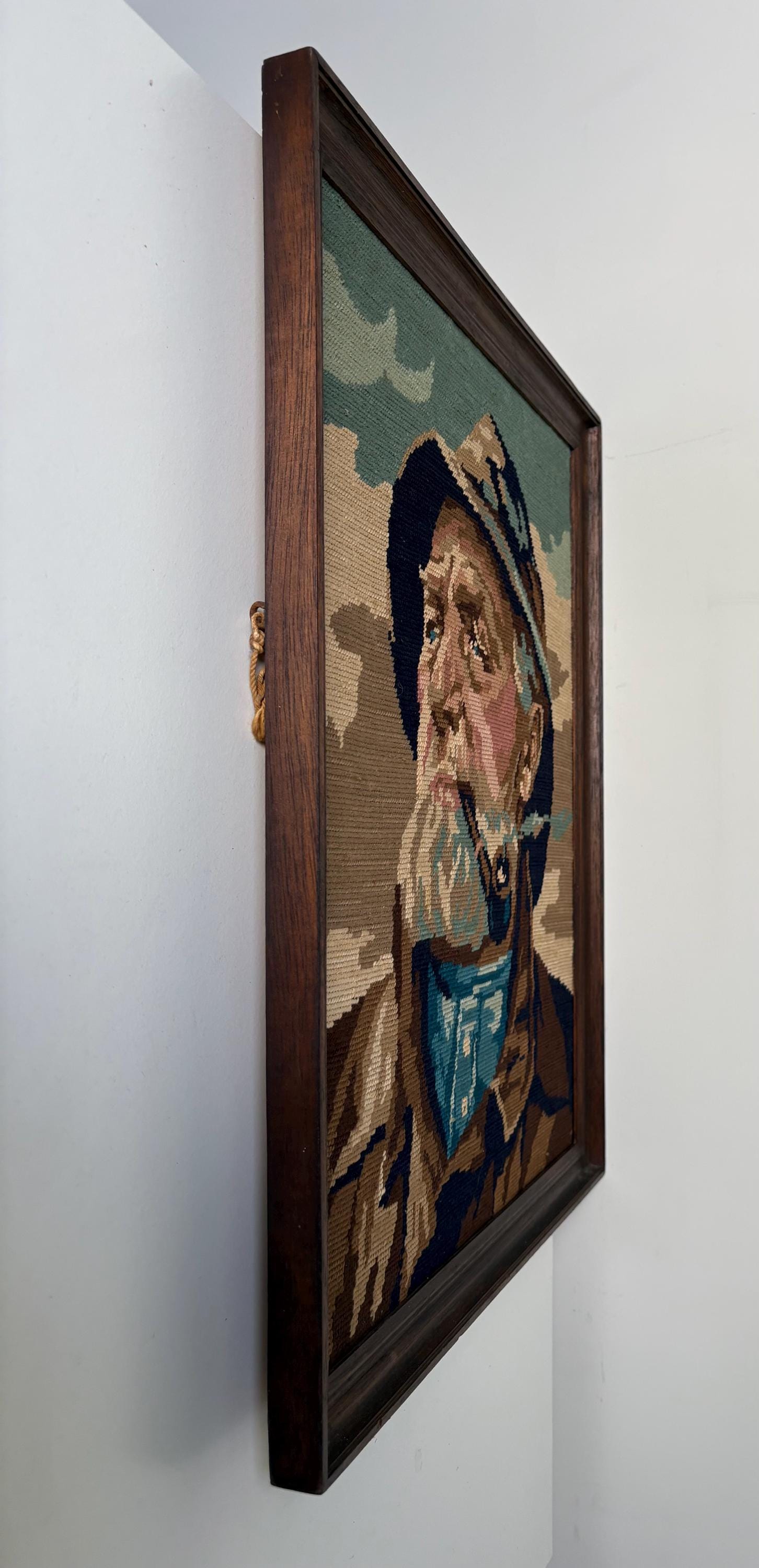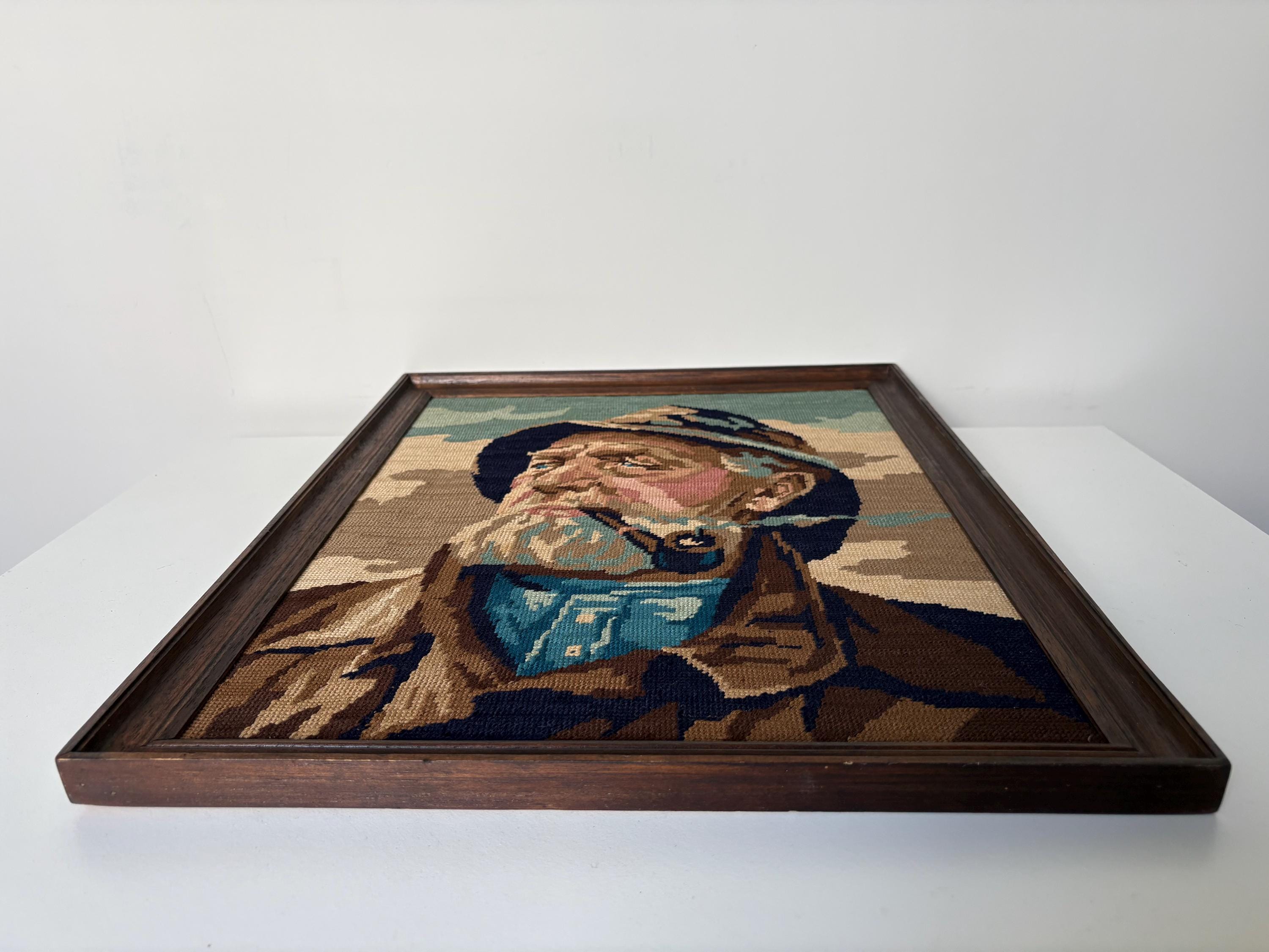 Very nice vintage wood framed embroidery portrait of Dorus Rijkers, a pipe-smoking fisherman, an old sailor. Mid century wall art from the 1970's. Original by Harry Haerendel.