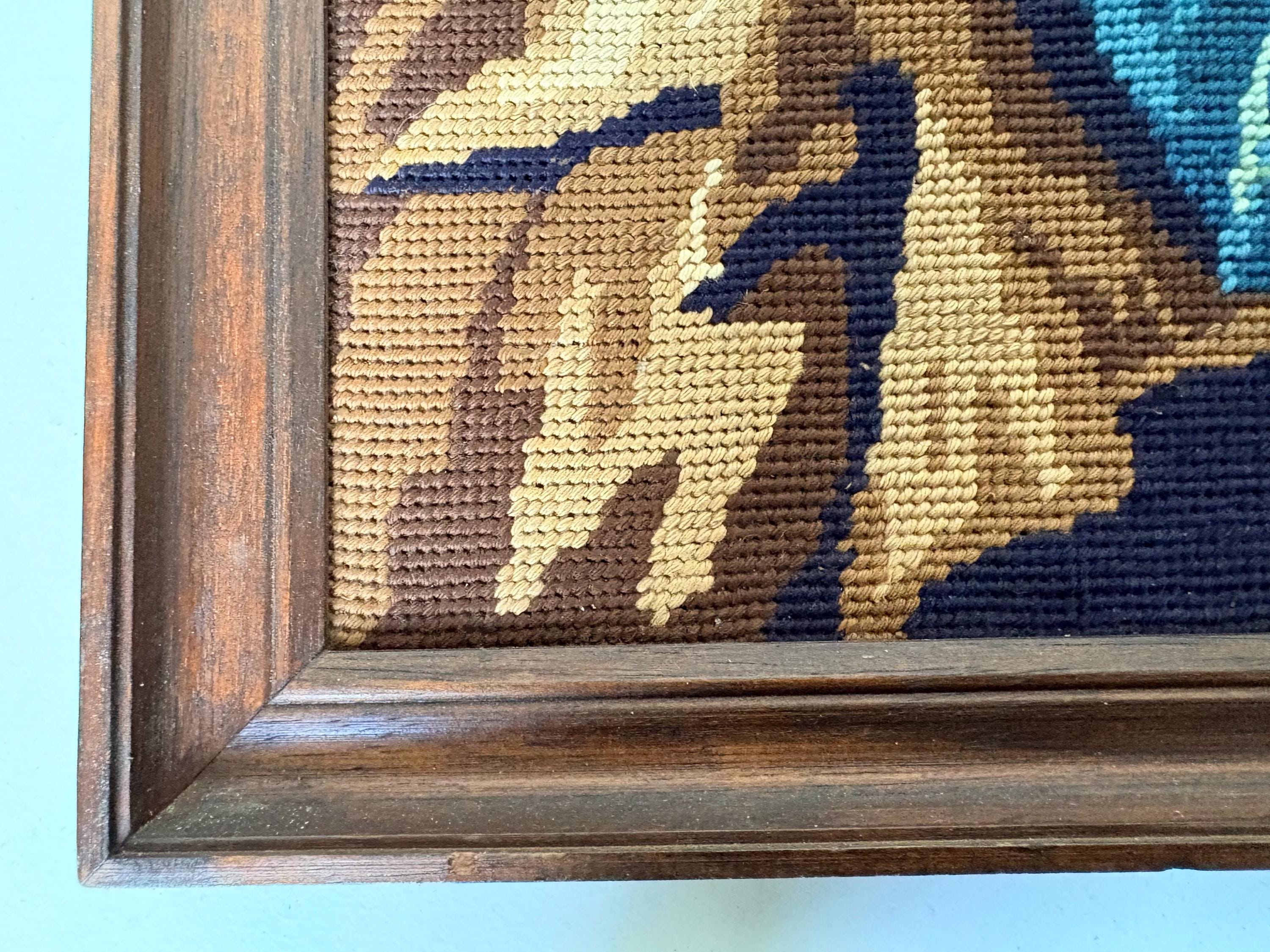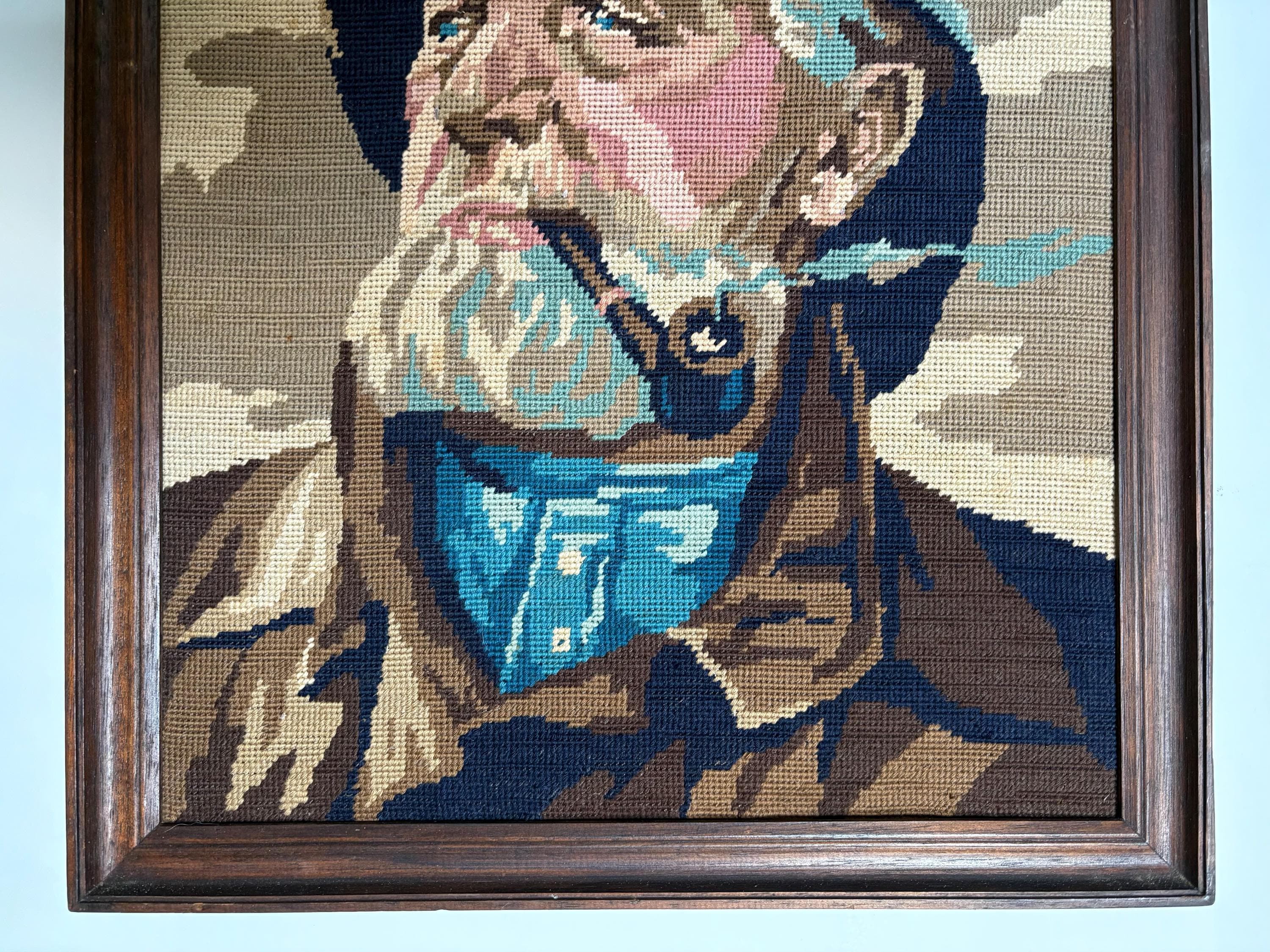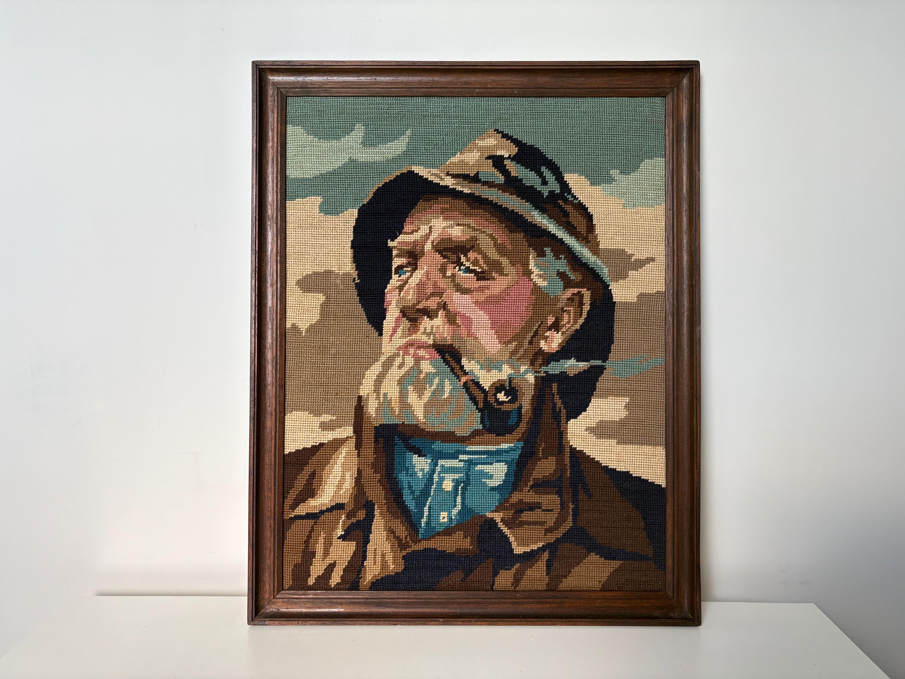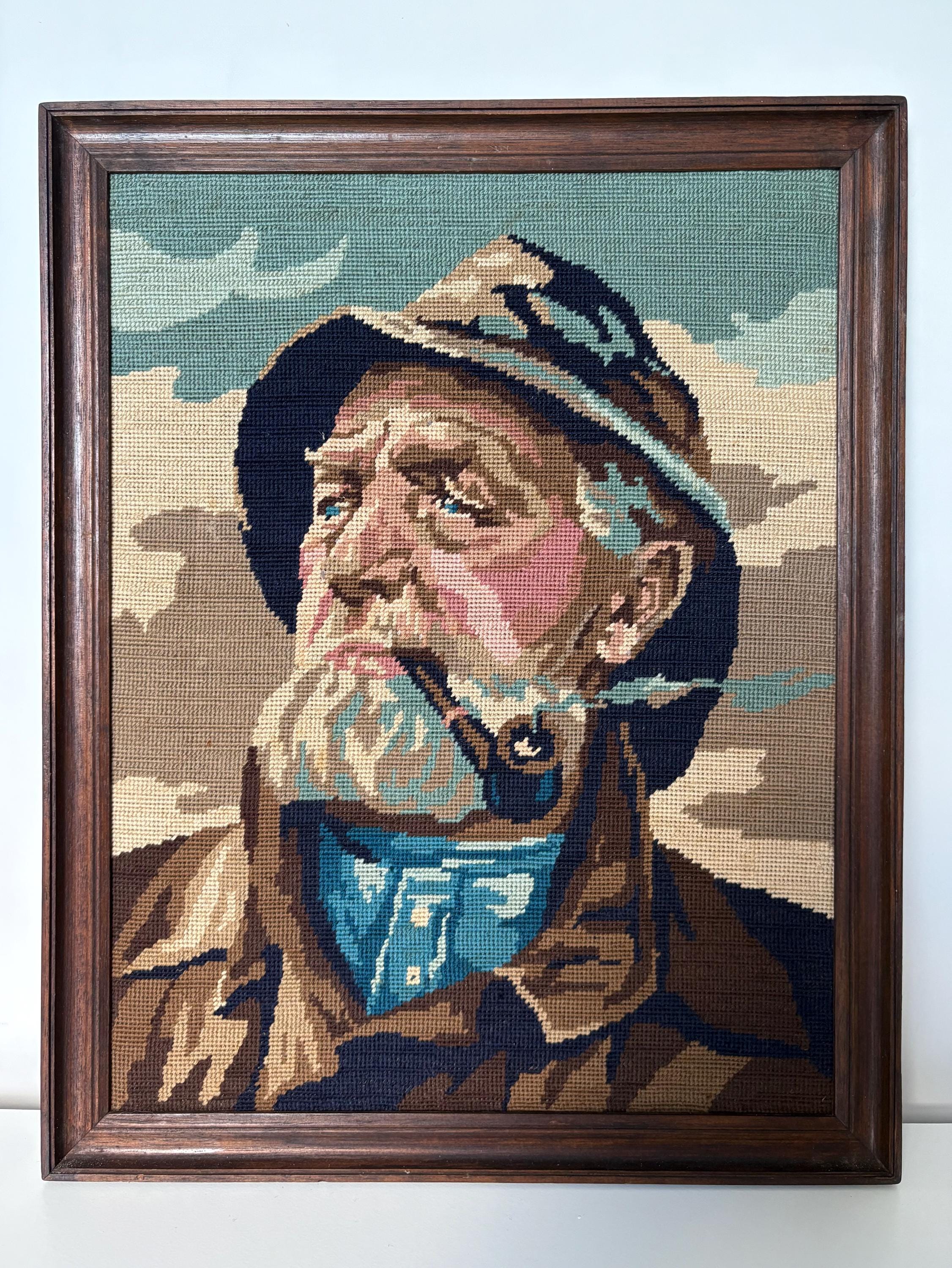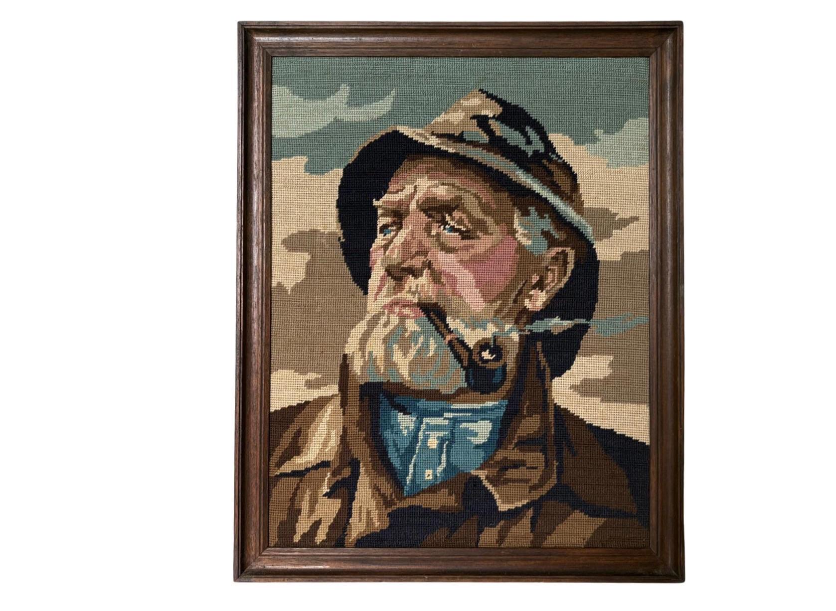 Very nice vintage wood framed embroidery portrait of Dorus Rijkers, a pipe-smoking fisherman, an old sailor. Mid century wall art from the 1970's. Original by Harry Haerendel.