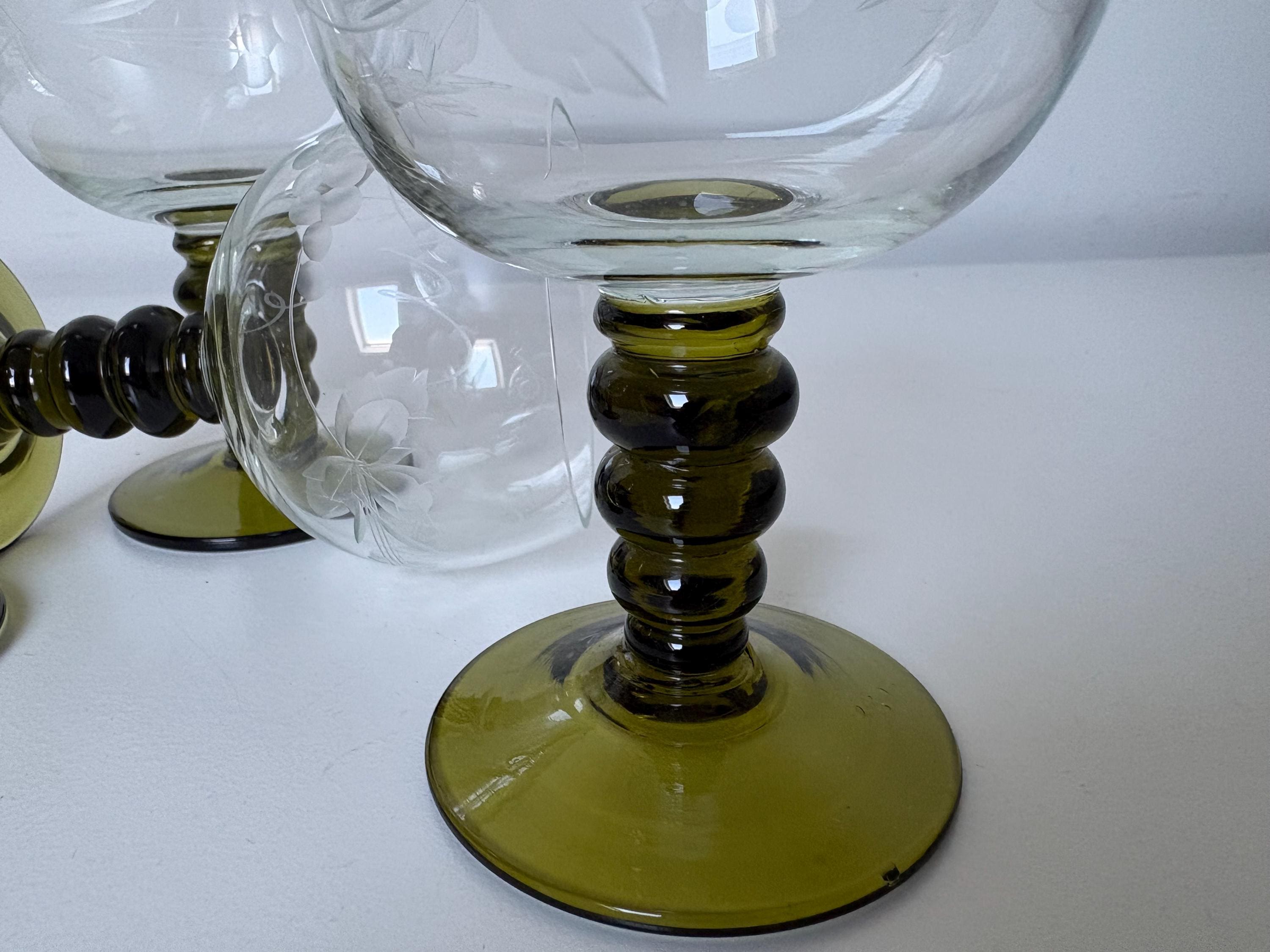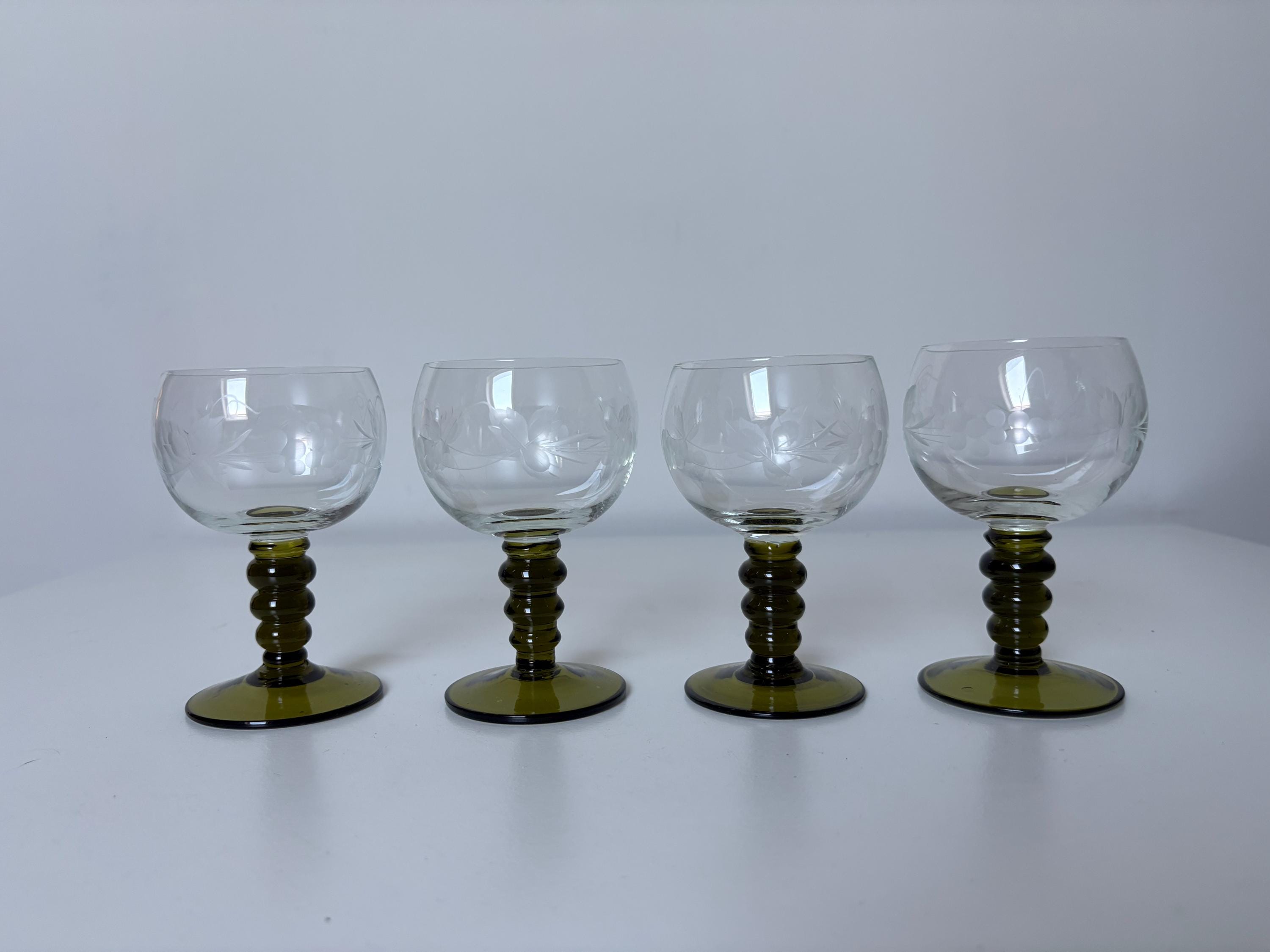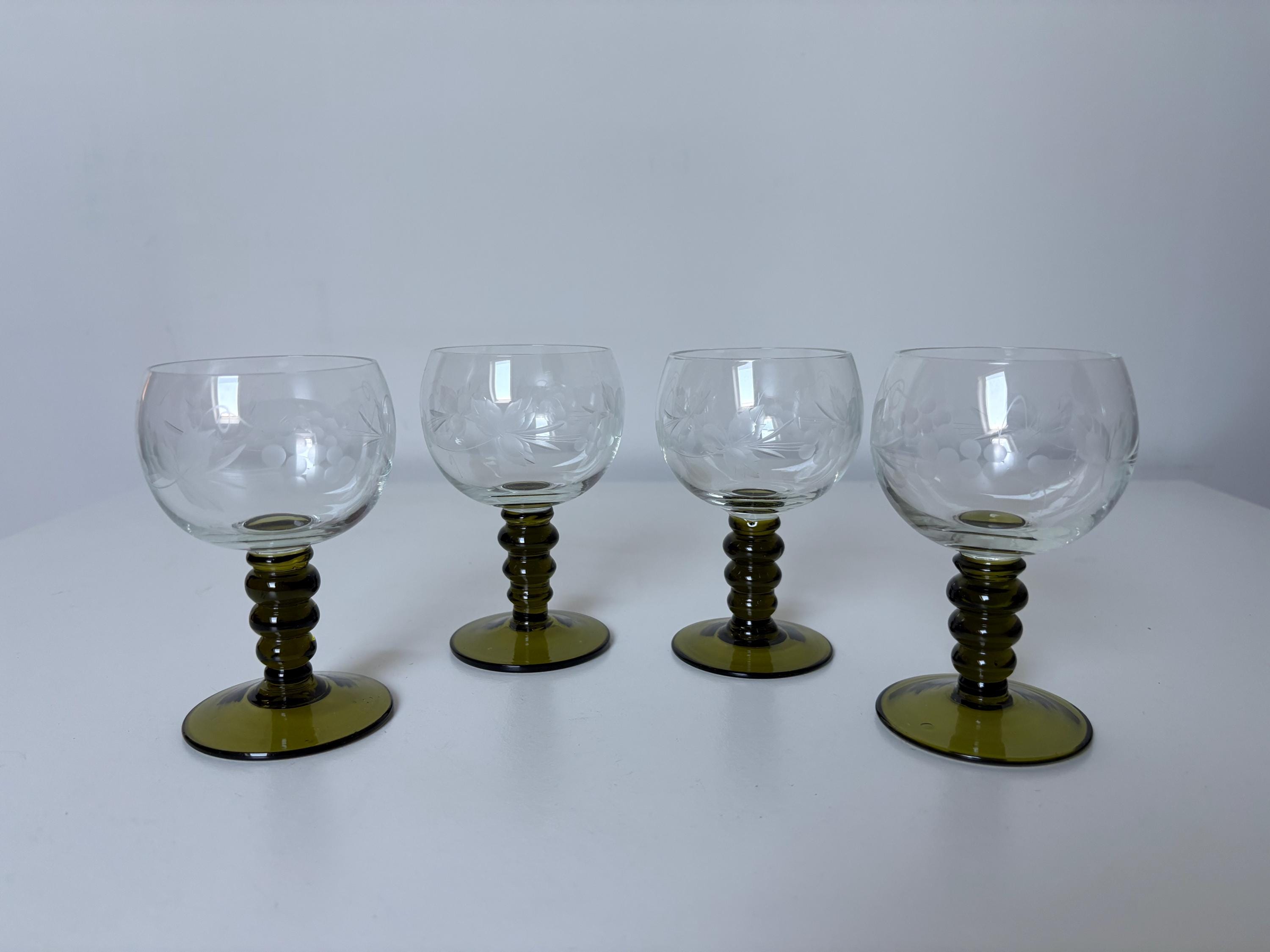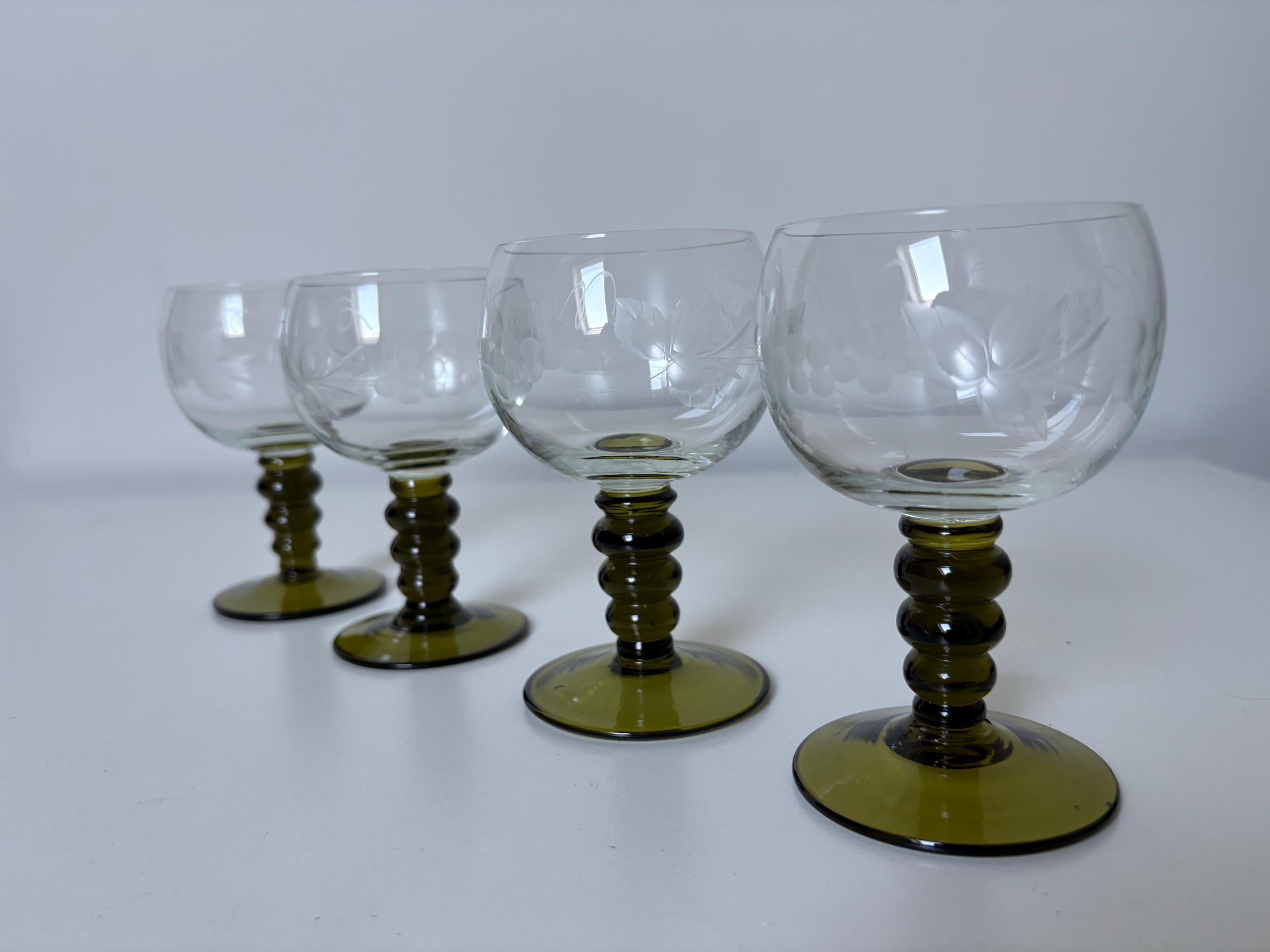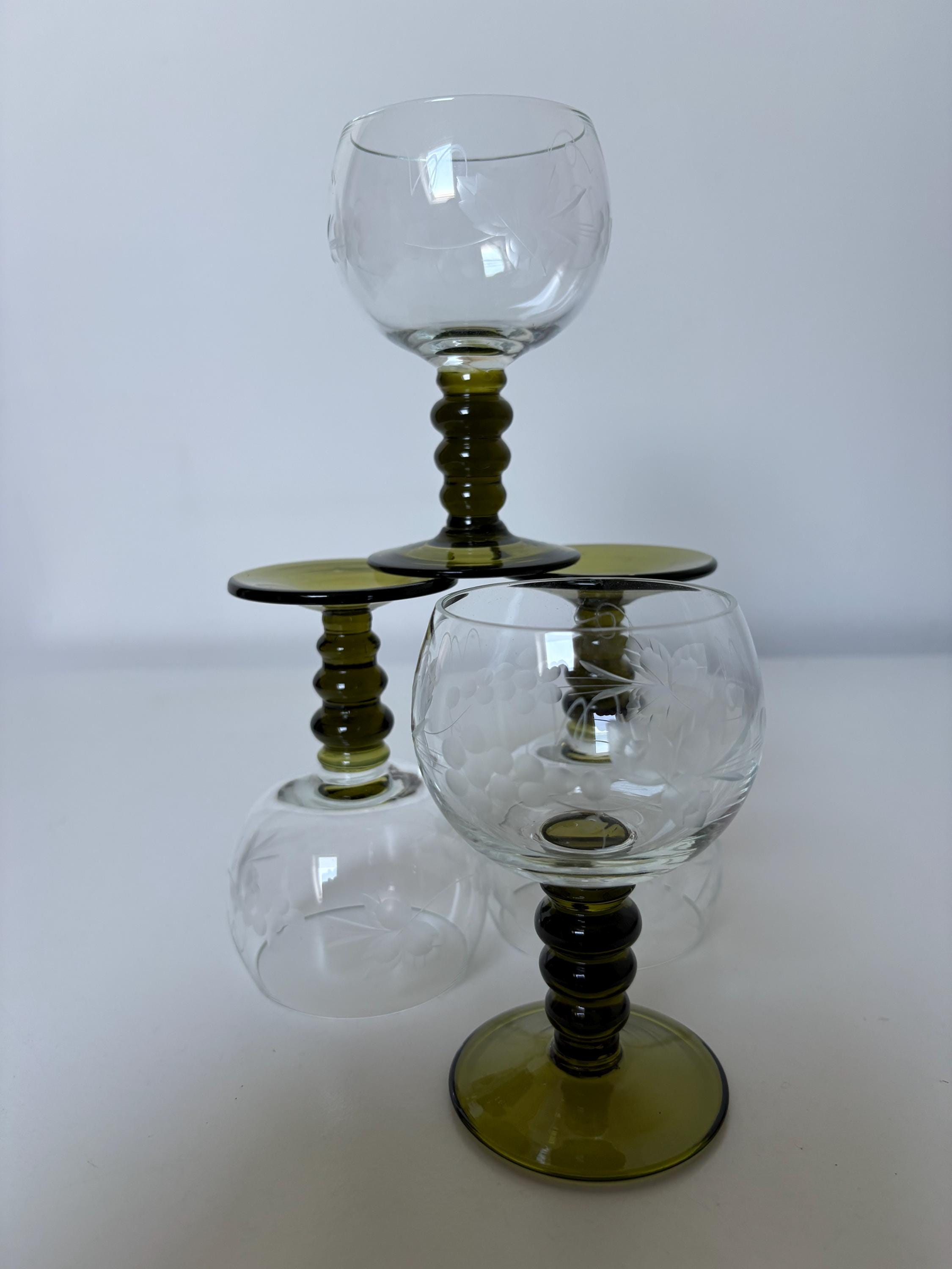 Set of 4 Alsace wine glasses, rummer glasses, a graceful chalice with an olive green colored stem in an uncommon form, vintage from the 1950s. These old but trendy glasses have a nice traditional etched decor depicting grapes, curls and leaves.