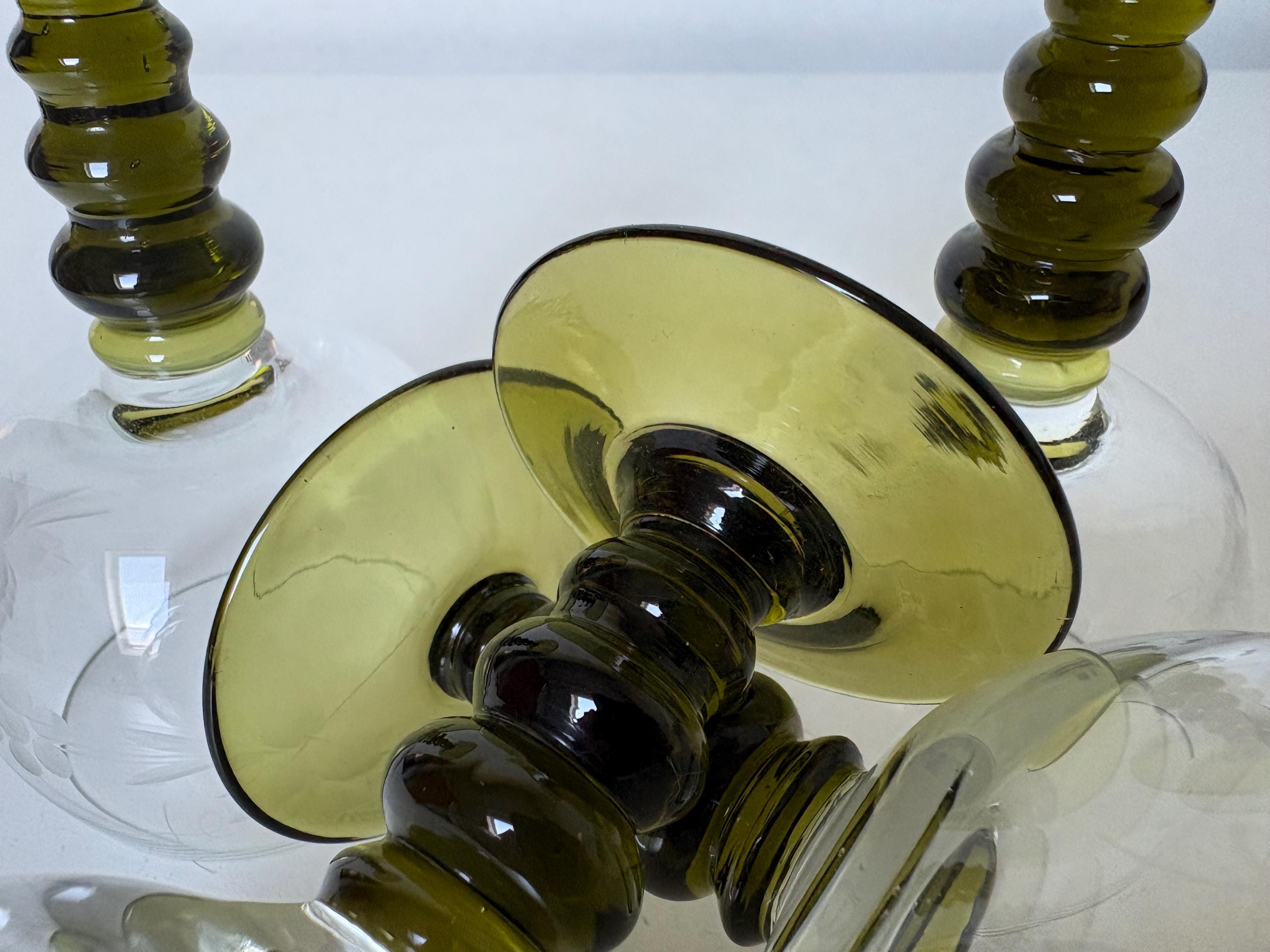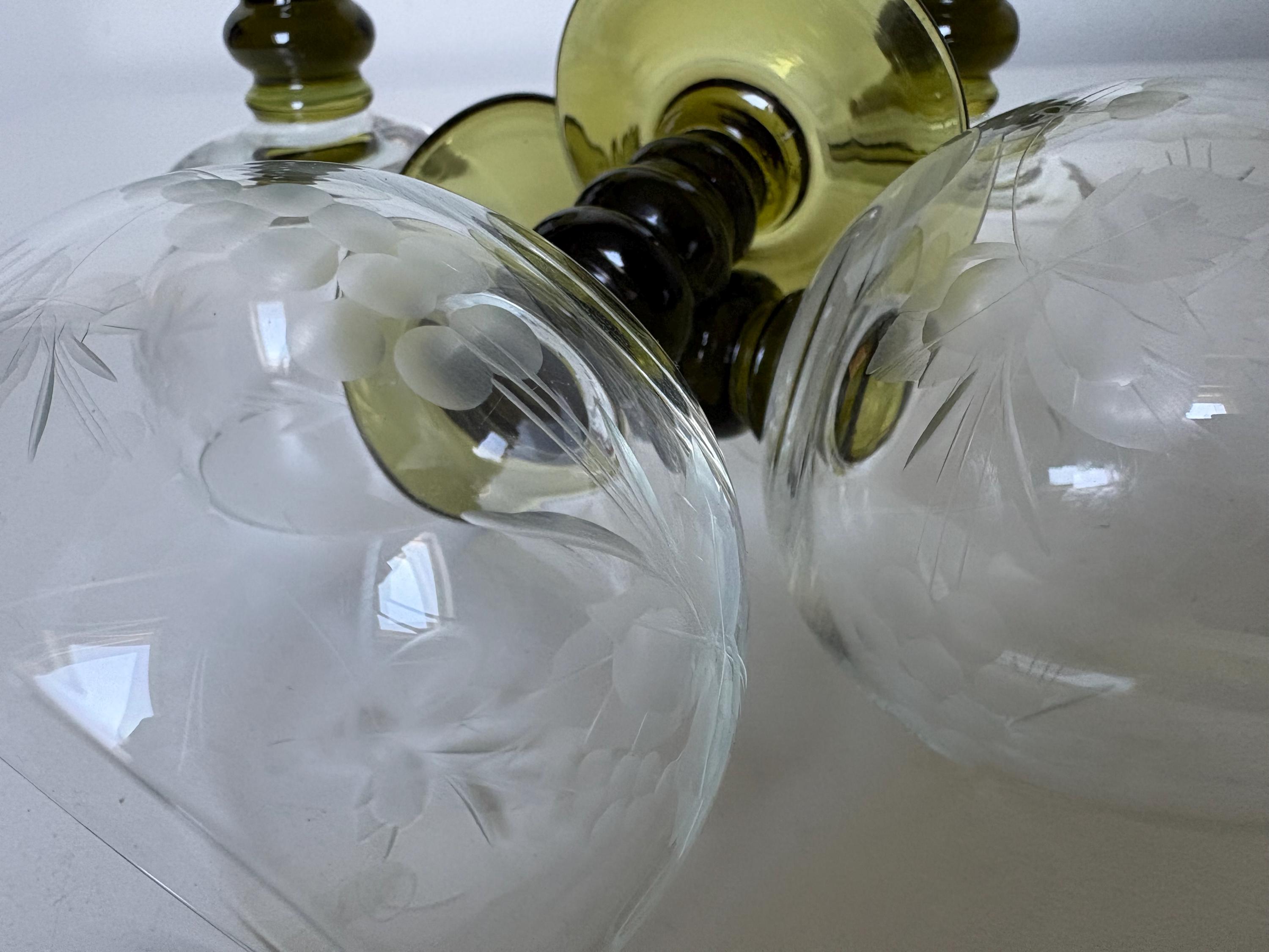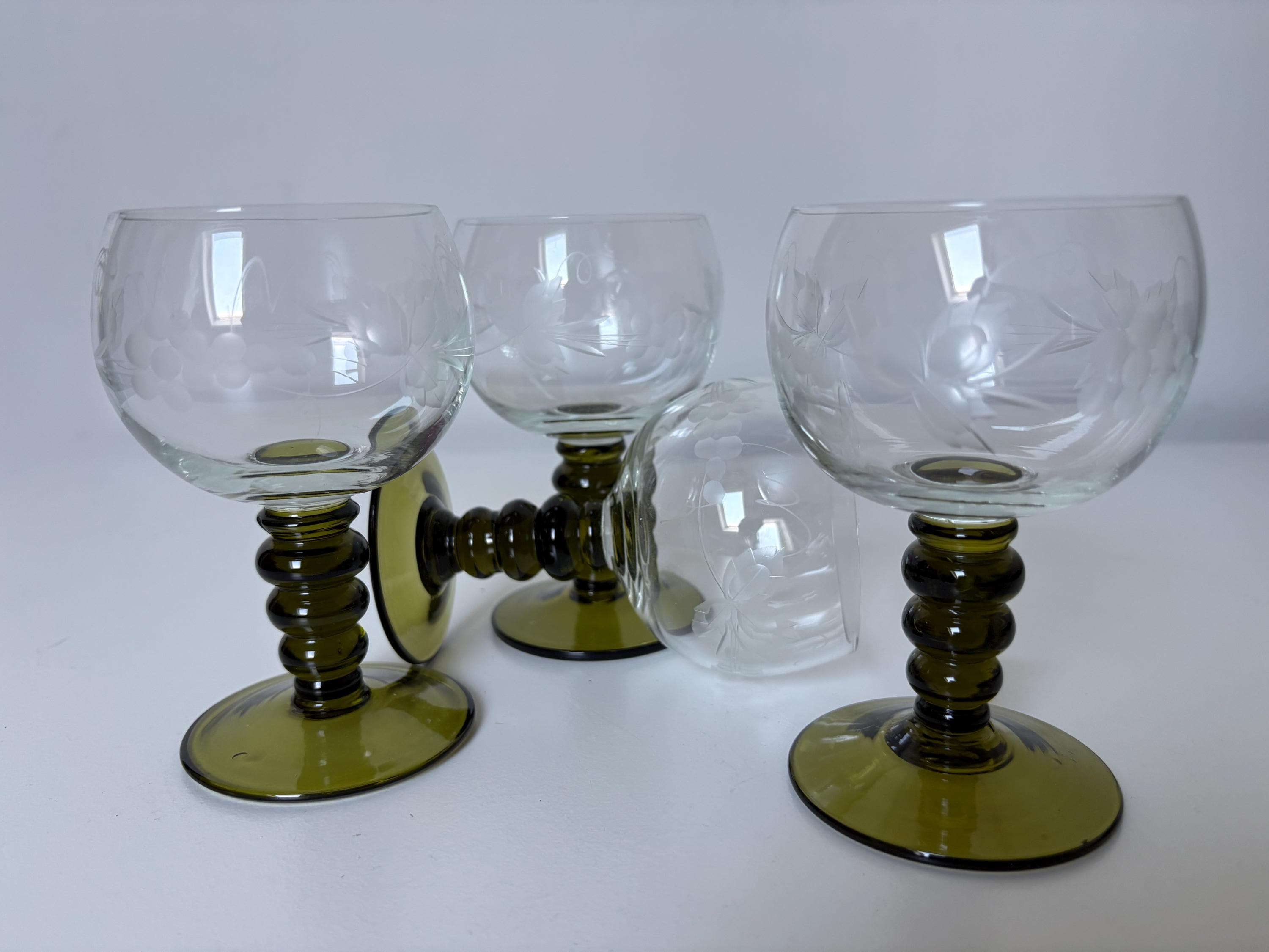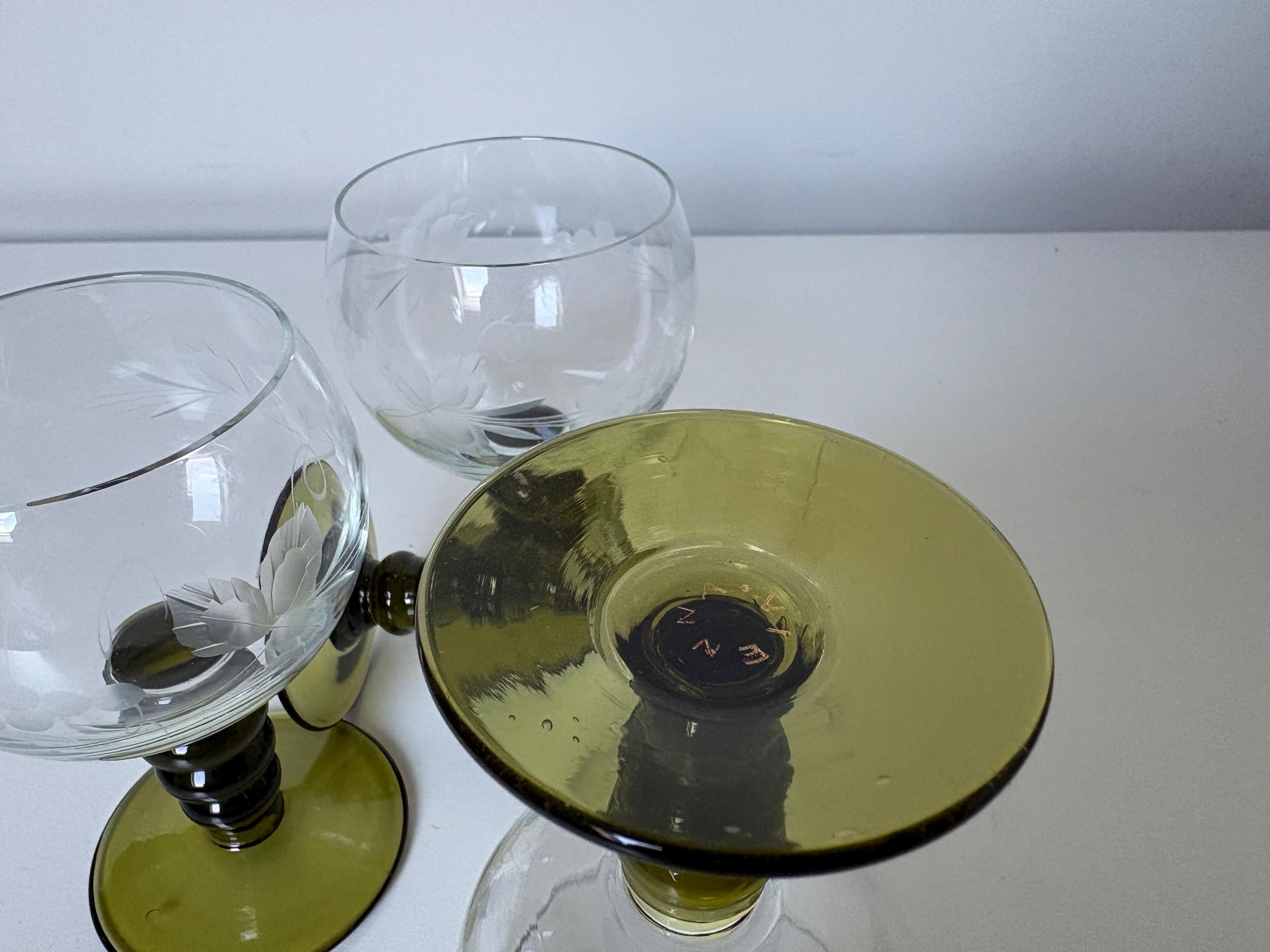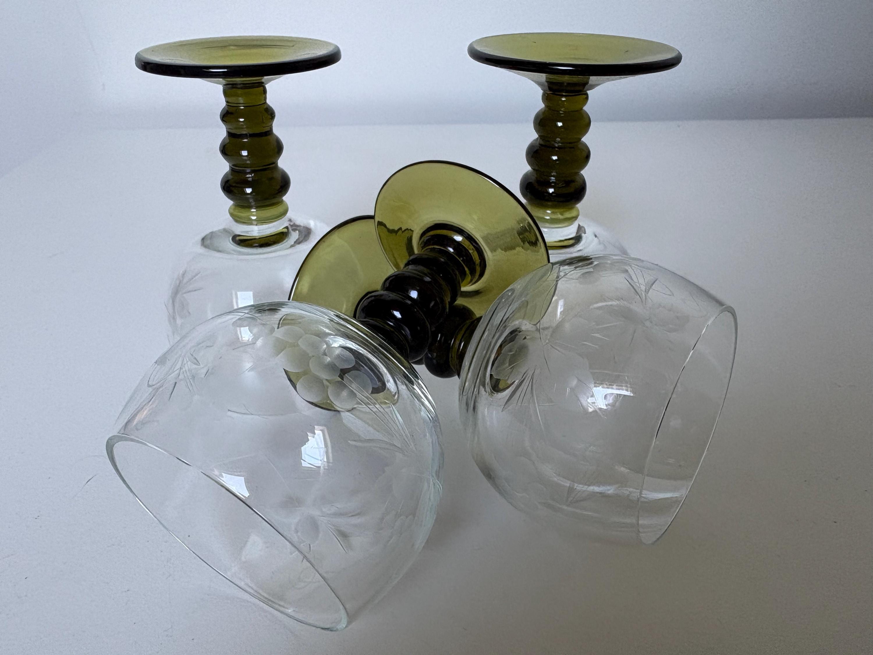 Set of 4 Alsace wine glasses, rummer glasses, a graceful chalice with an olive green colored stem in an uncommon form, vintage from the 1950s. These old but trendy glasses have a nice traditional etched decor depicting grapes, curls and leaves.