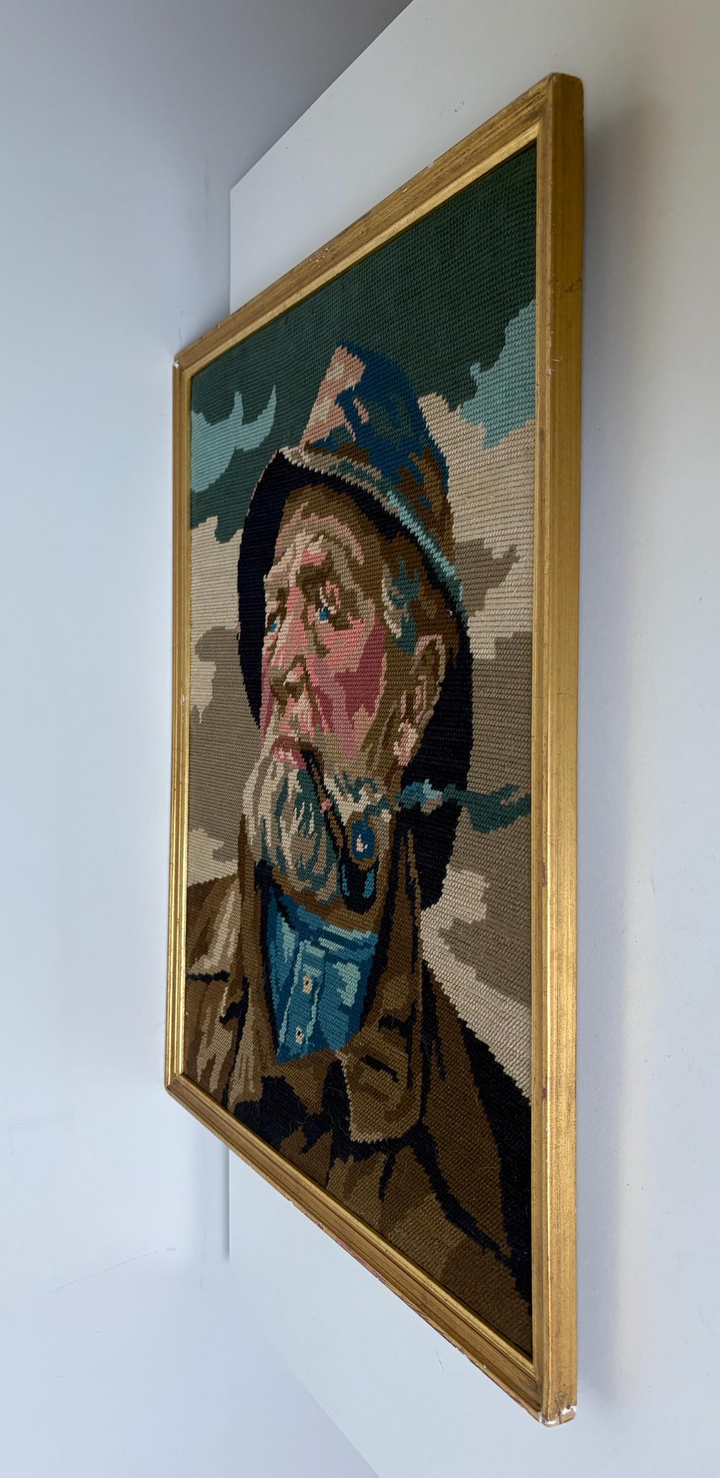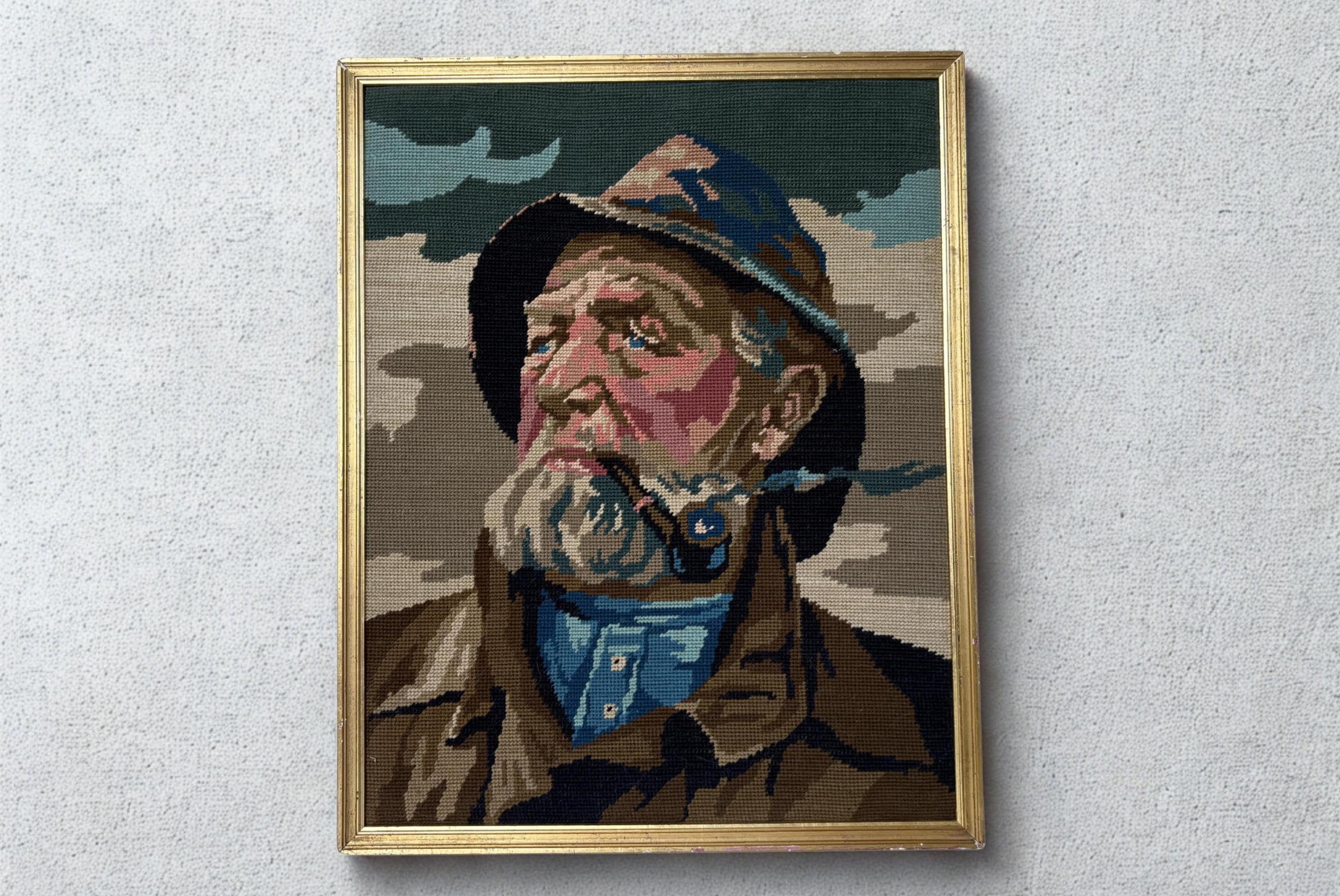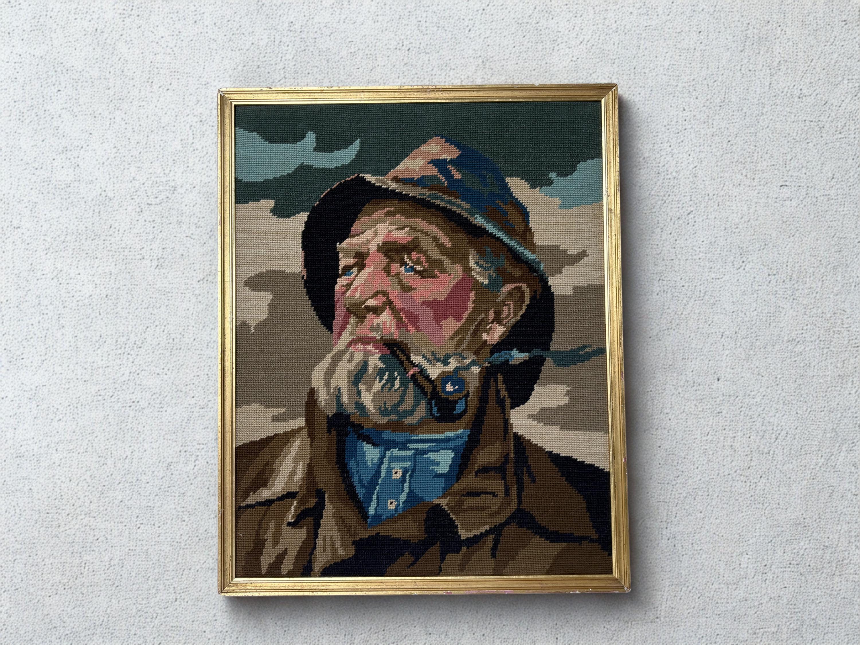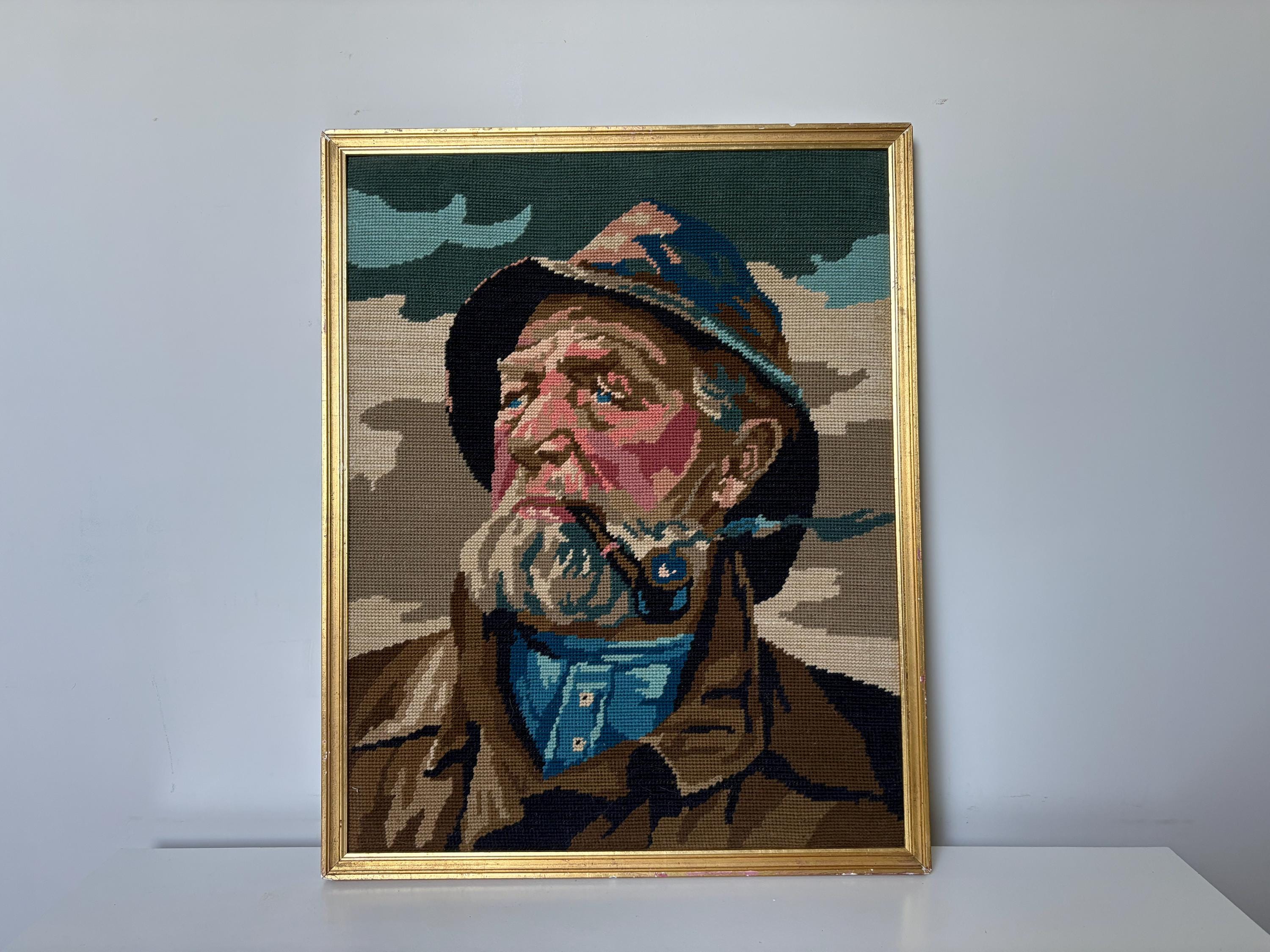 Very nice vintage embroidery portrait, art print of a pipe-smoking fisherman, an old sailor, mid century wall art from the 1970's. In a gold painted wooden frame.