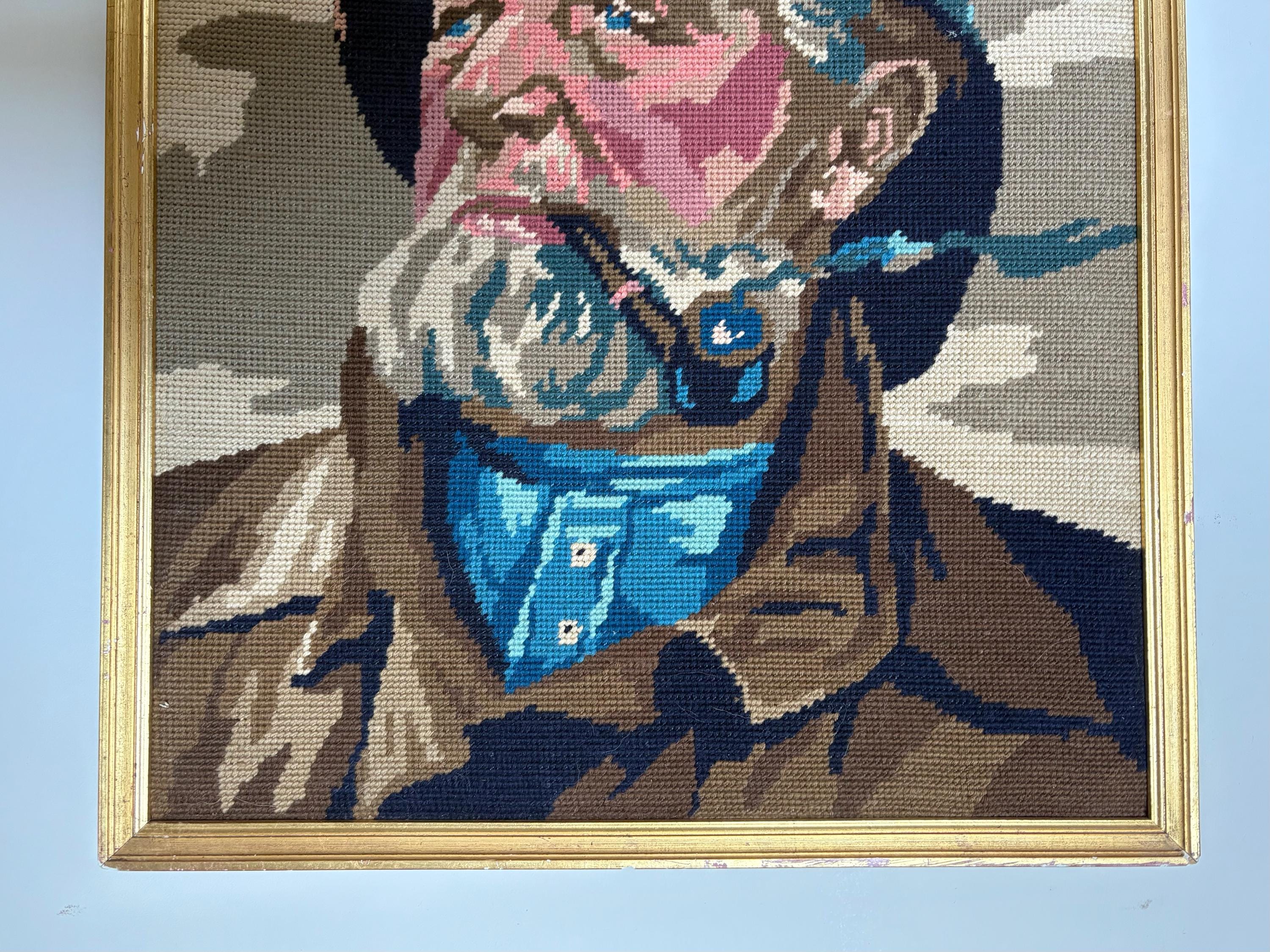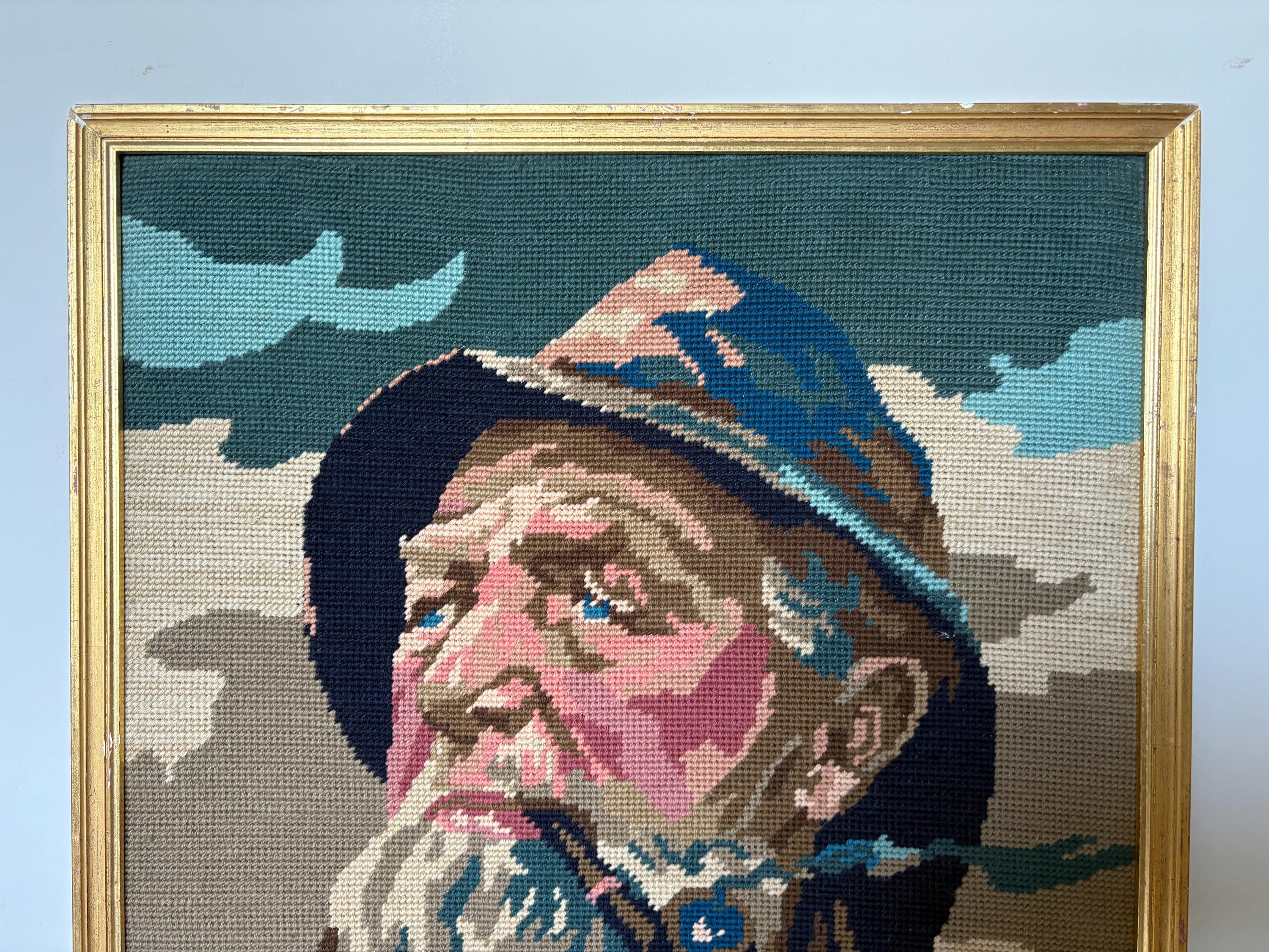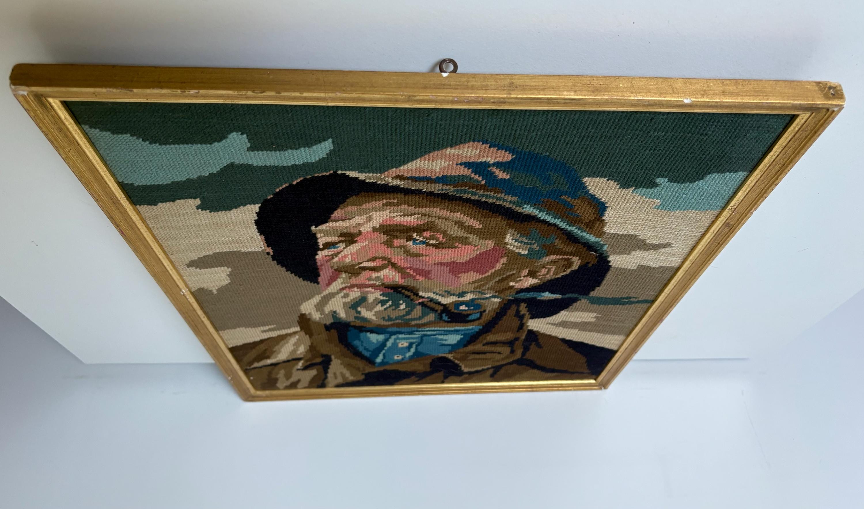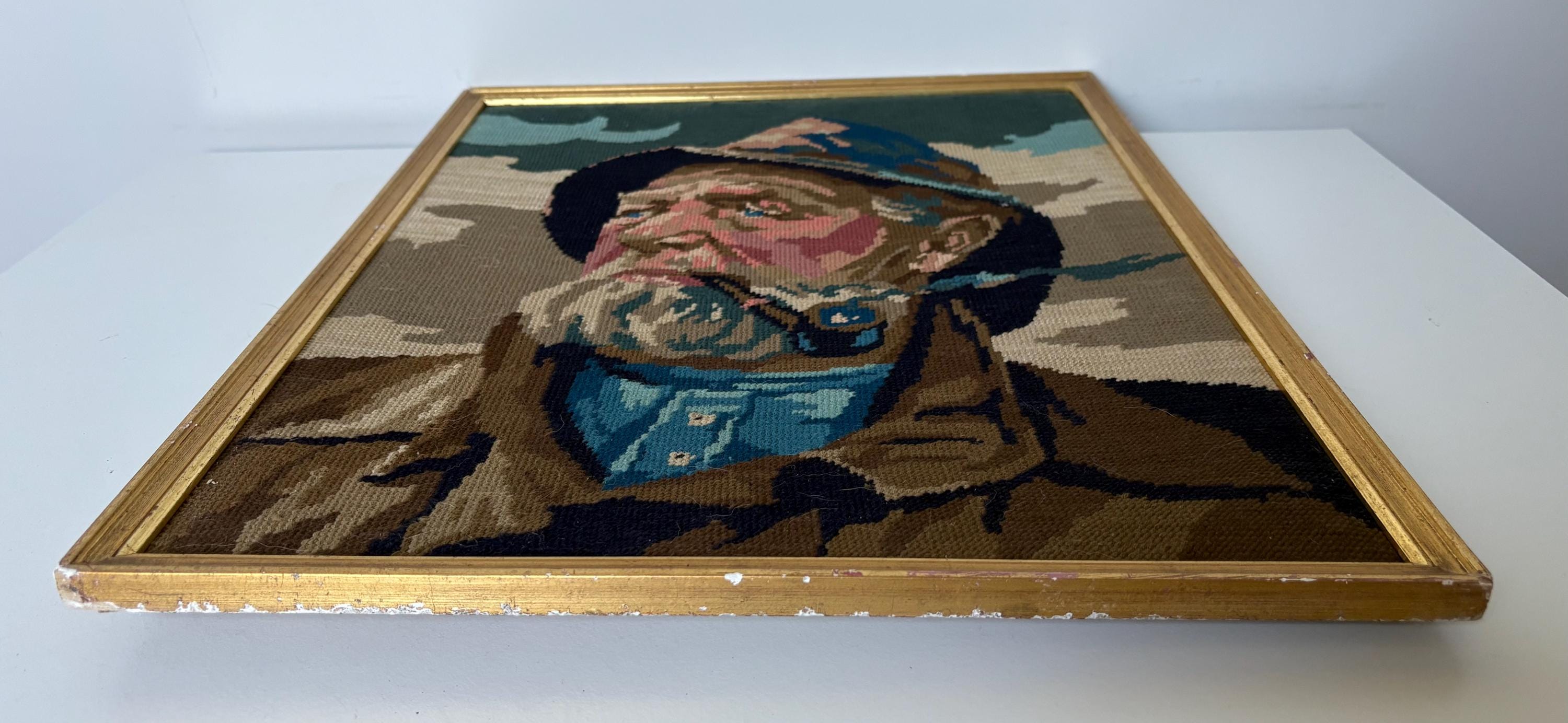Very nice vintage embroidery portrait, art print of a pipe-smoking fisherman, an old sailor, mid century wall art from the 1970's. In a gold painted wooden frame.