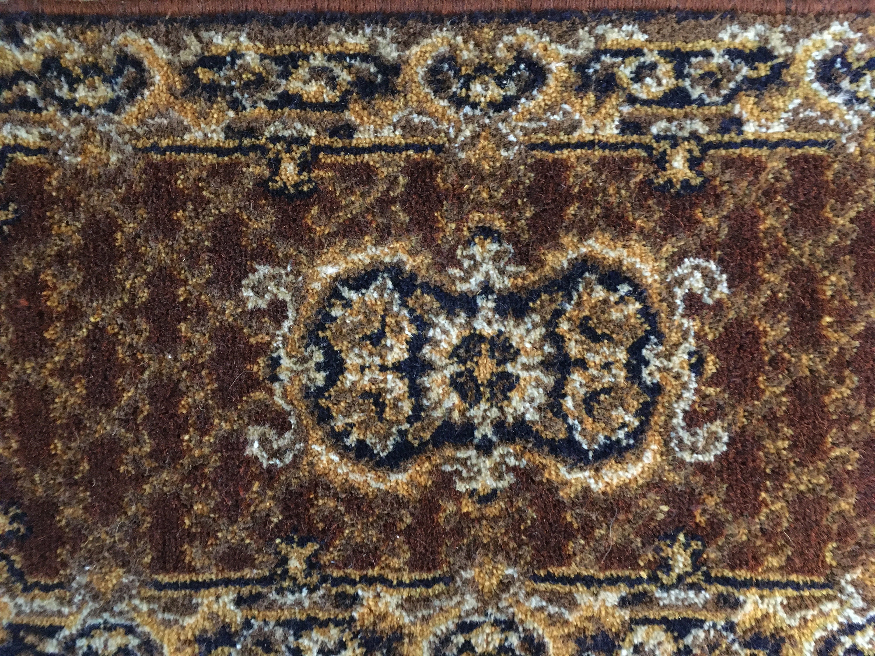 Small table rug / small carpet / table topper / table runner made of wool, brown, beige, yellow, green and black accents.