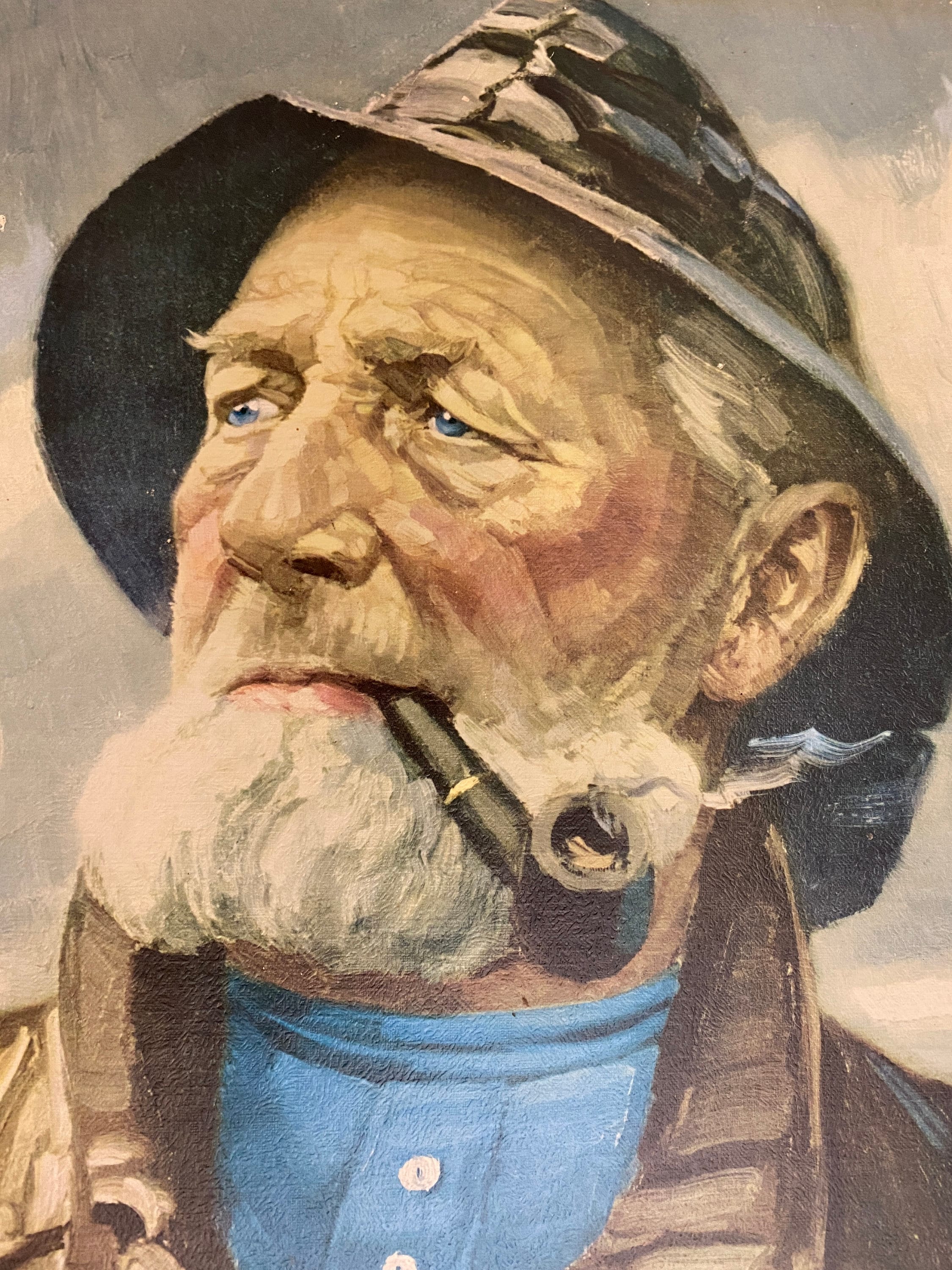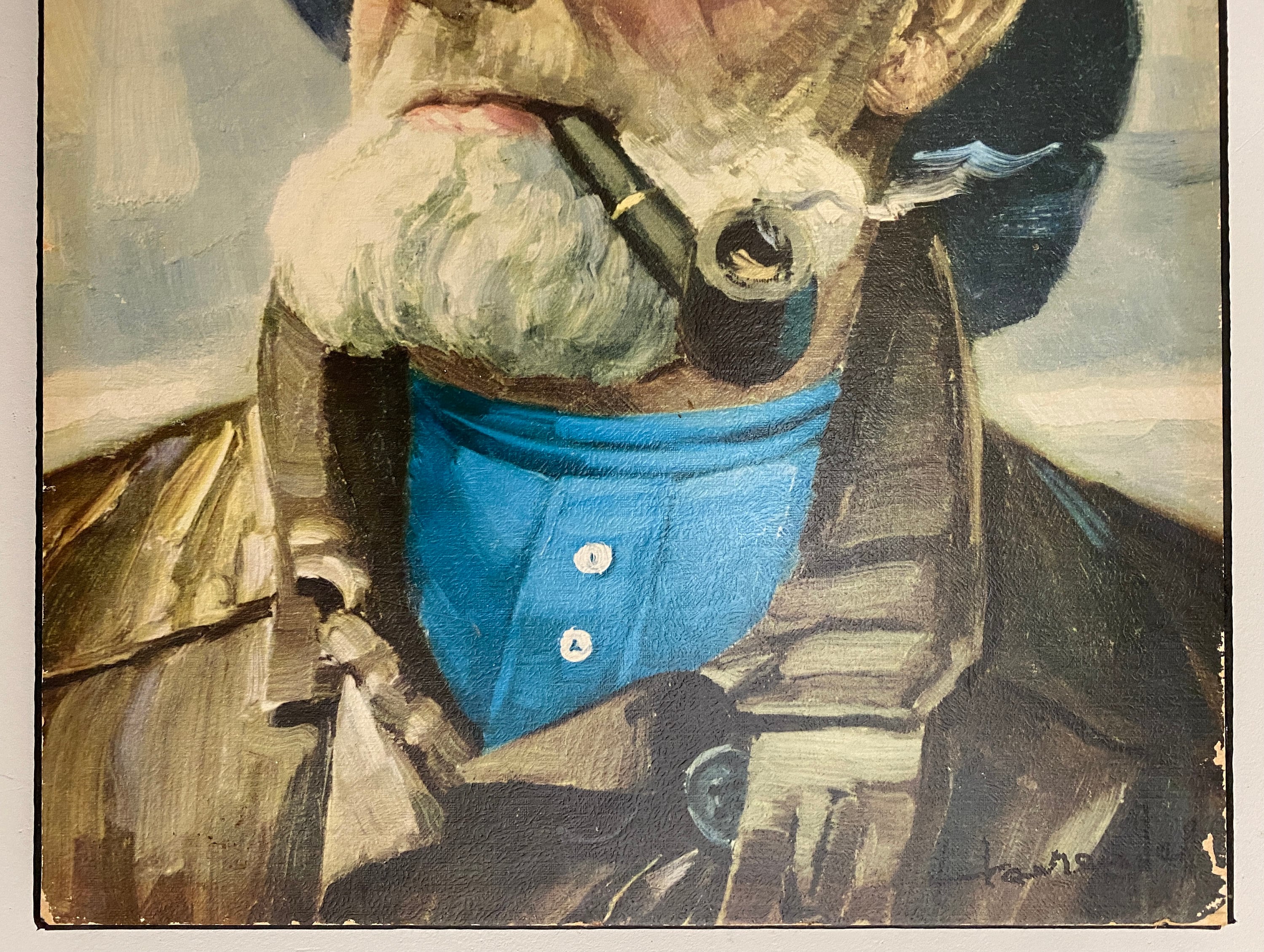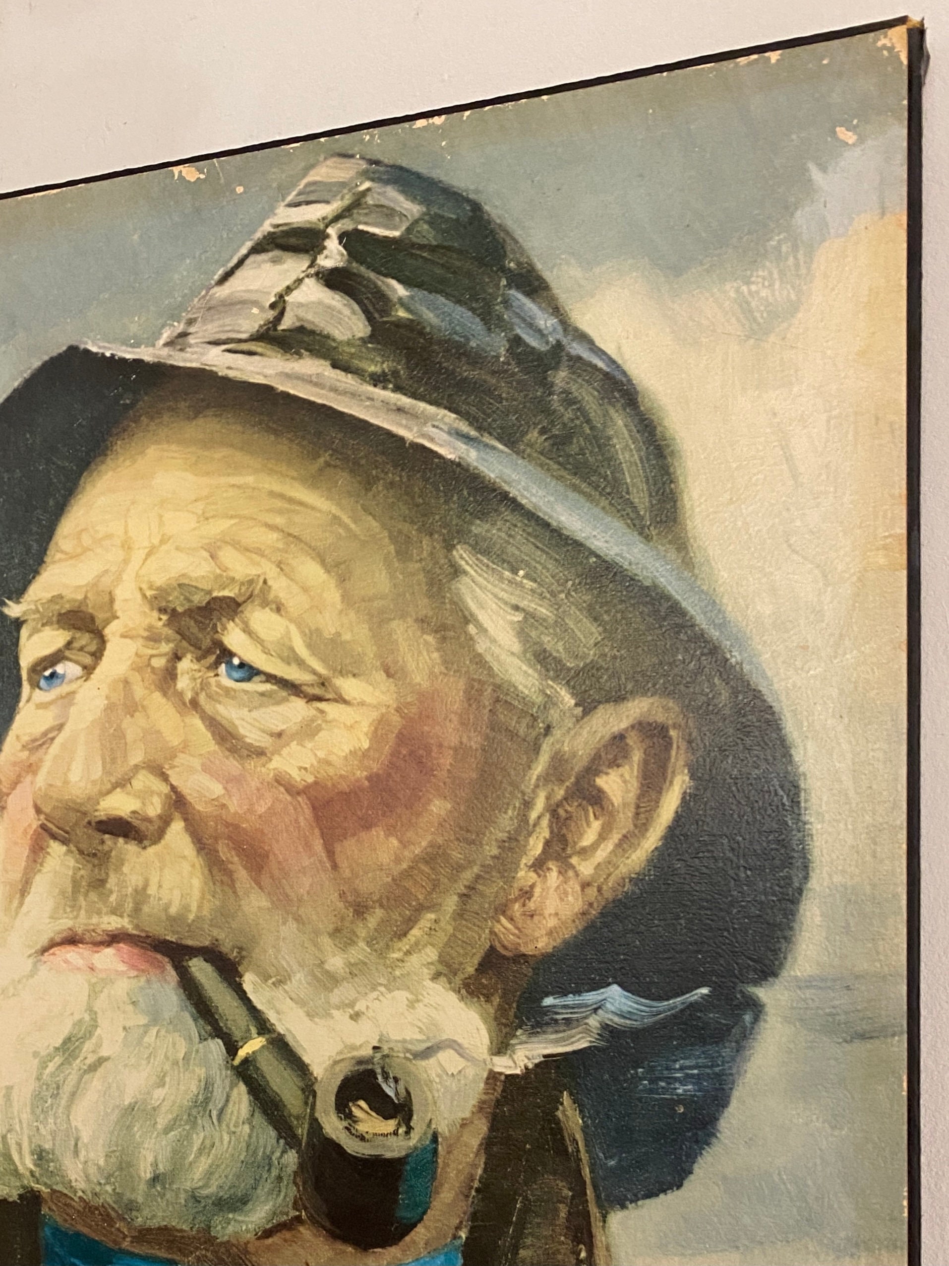 Very nice vintage portrait, art print glued on chipboard of a pipe-smoking fisherman, an old sailor, mid century wall art 1970’s. Original by Harry Haerendel.