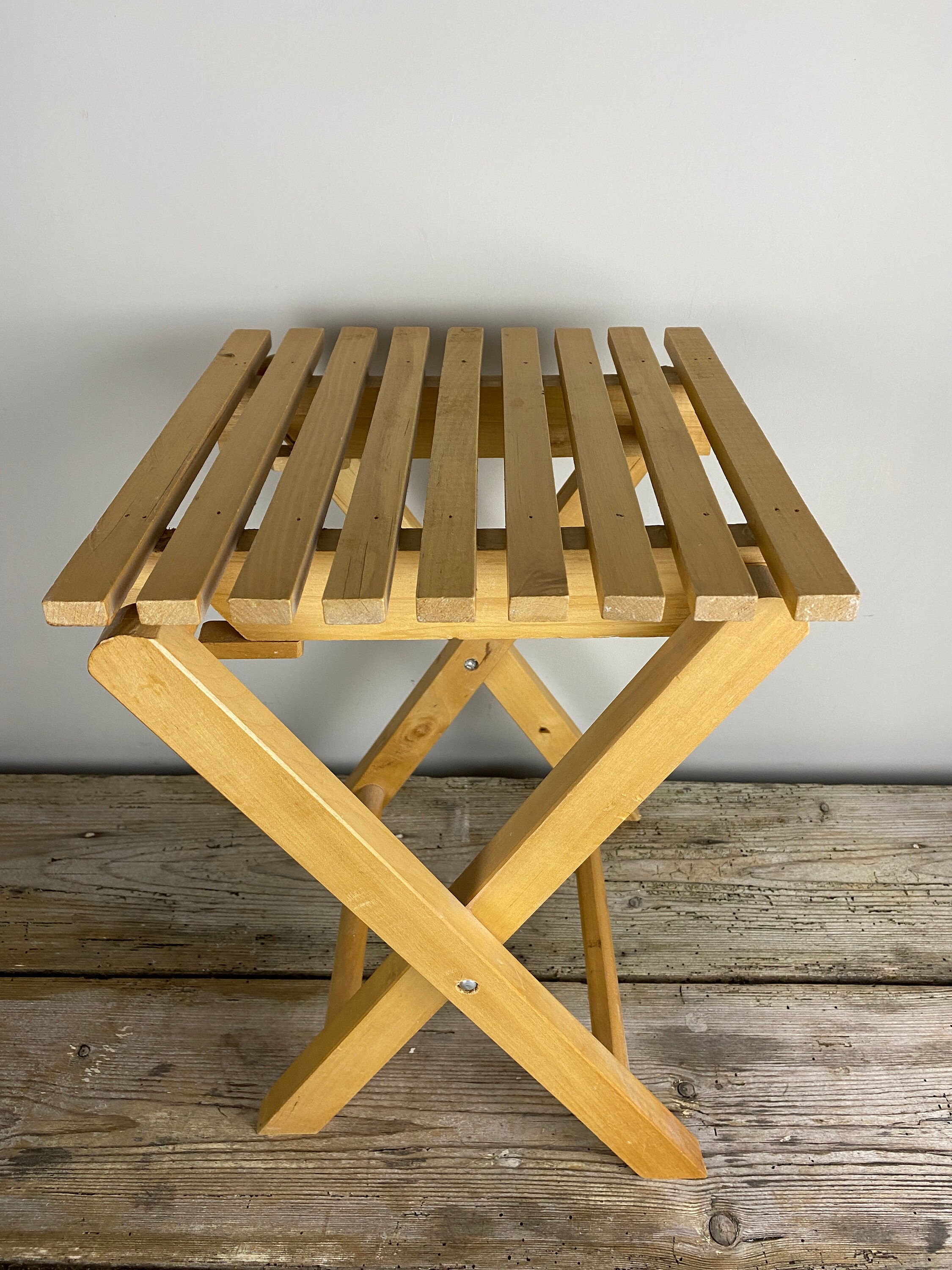 Foldable slatted wooden plant stand, plant table, plant stool, Bohemian decor. Lovely vintage from the 1980's