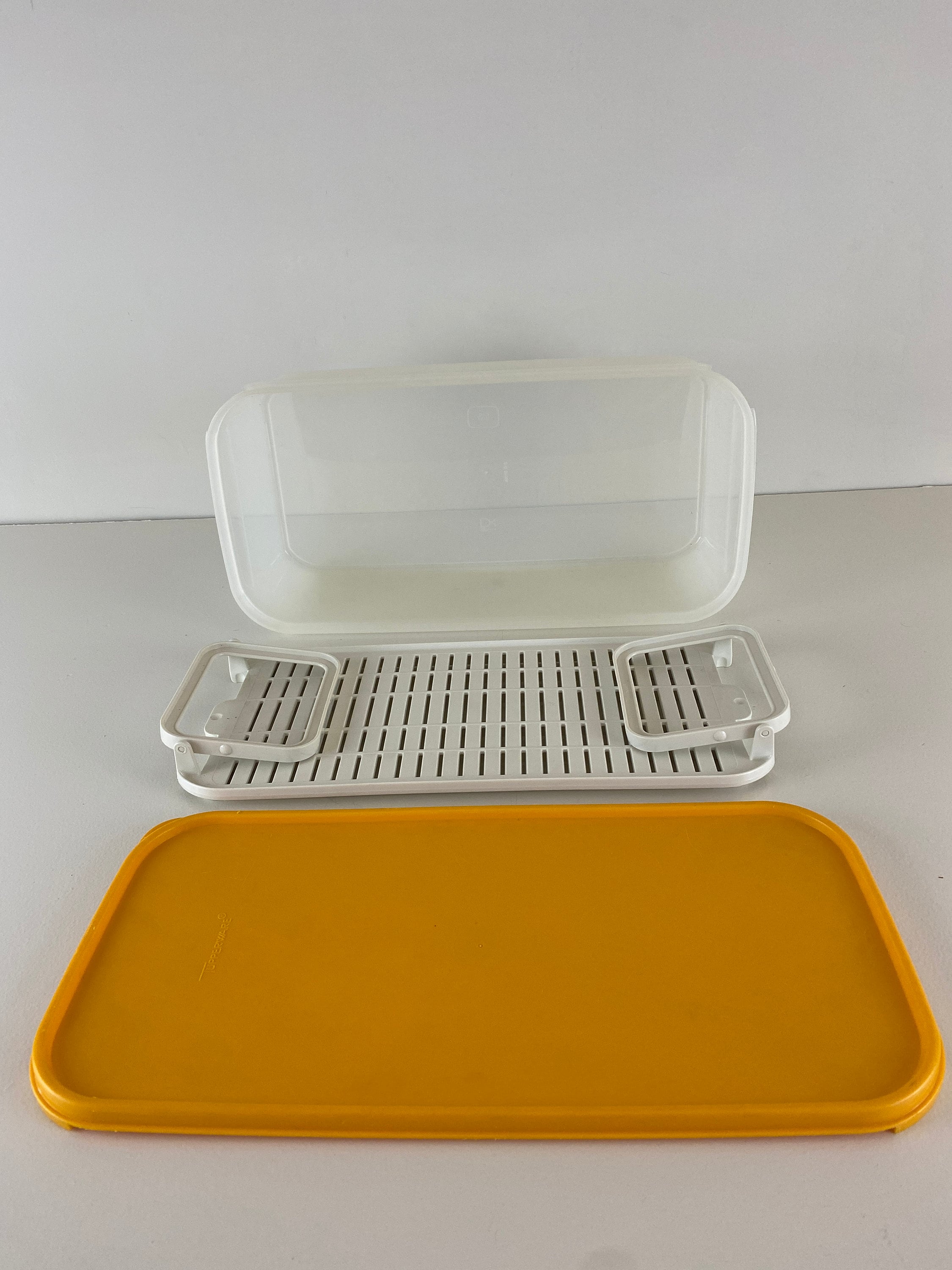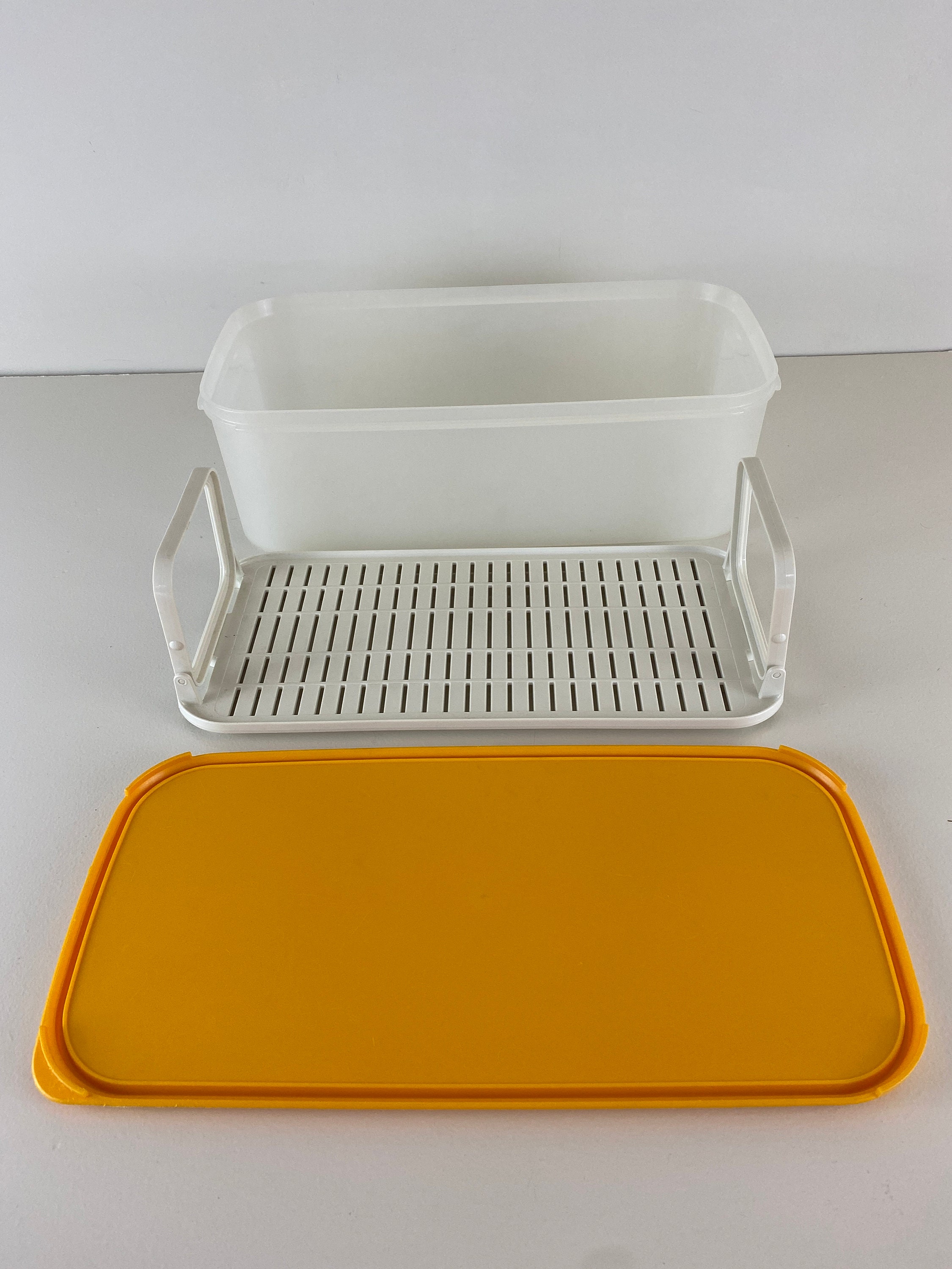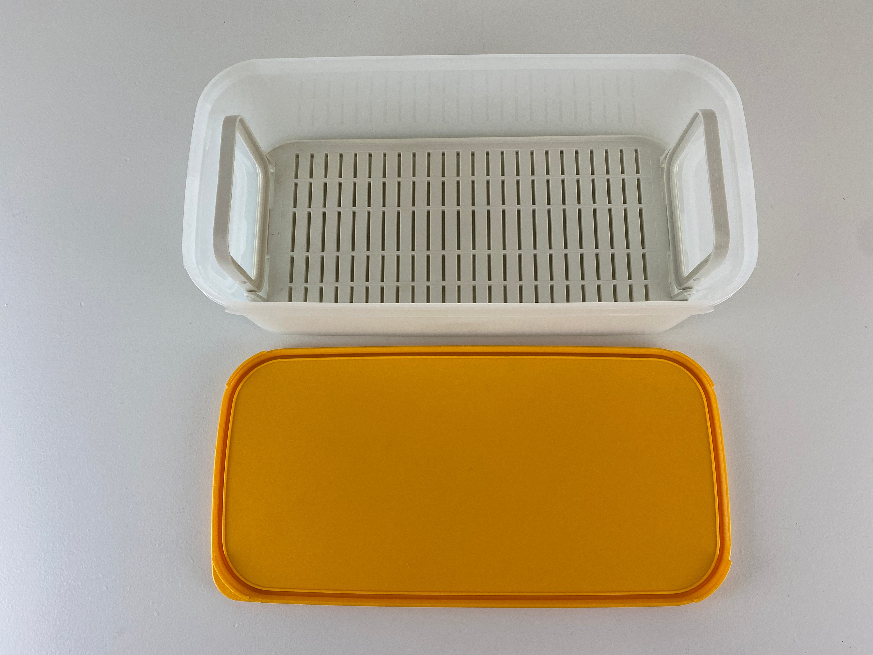 Vintage Tupperware bread box in yellow and white. This bread container has a removable insert. A lovely addition to your vintage retro kitchen.