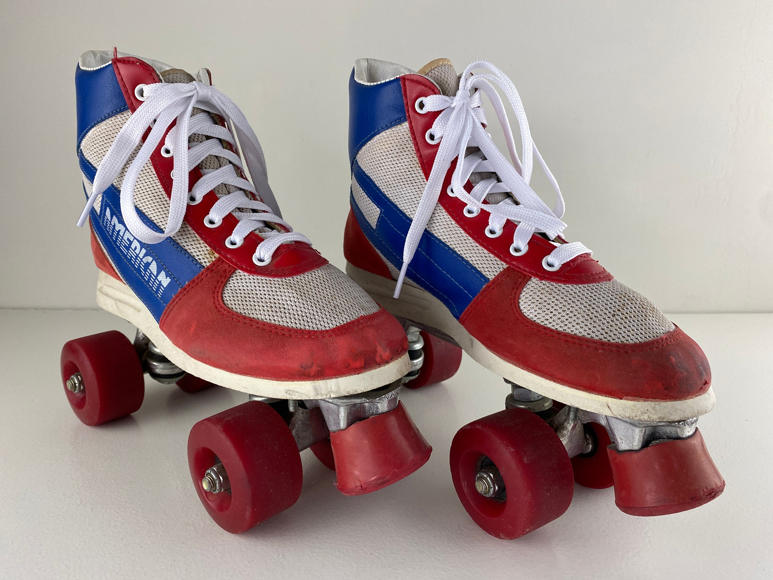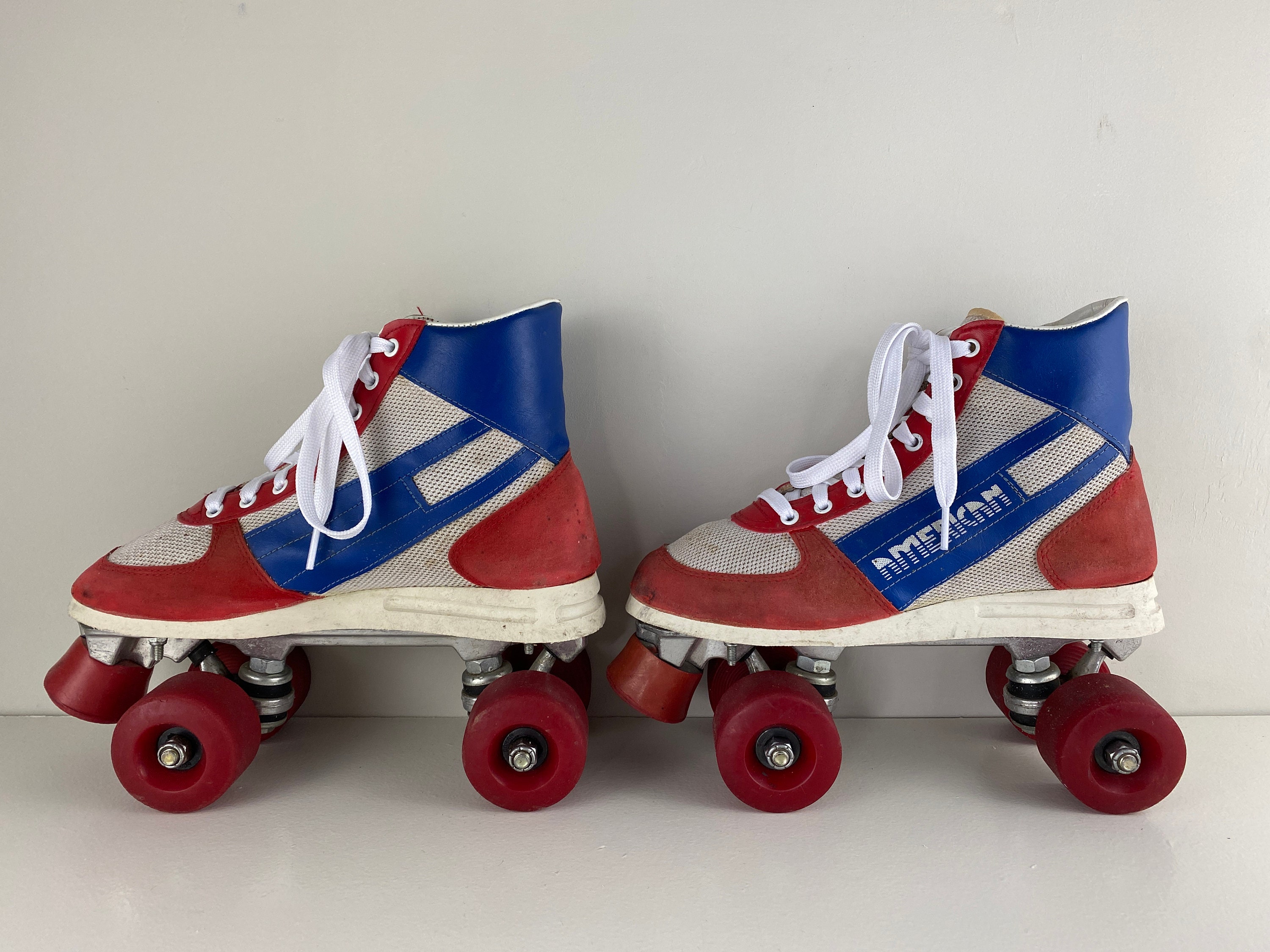 Vintage ‘80s roller skates white fabric, blue faux leather, red suede and white laces. Red wheels and stoppers. With the text "American". EU 39 USwoman 7.5, USman 6.5, UK 6.0. The toe to heel length outside is app. 27.5 cm (10.83 inches). The toe to heel length is app. 25.5 cm (10.04"). The inner soles measures 24.5 cm (9.65").