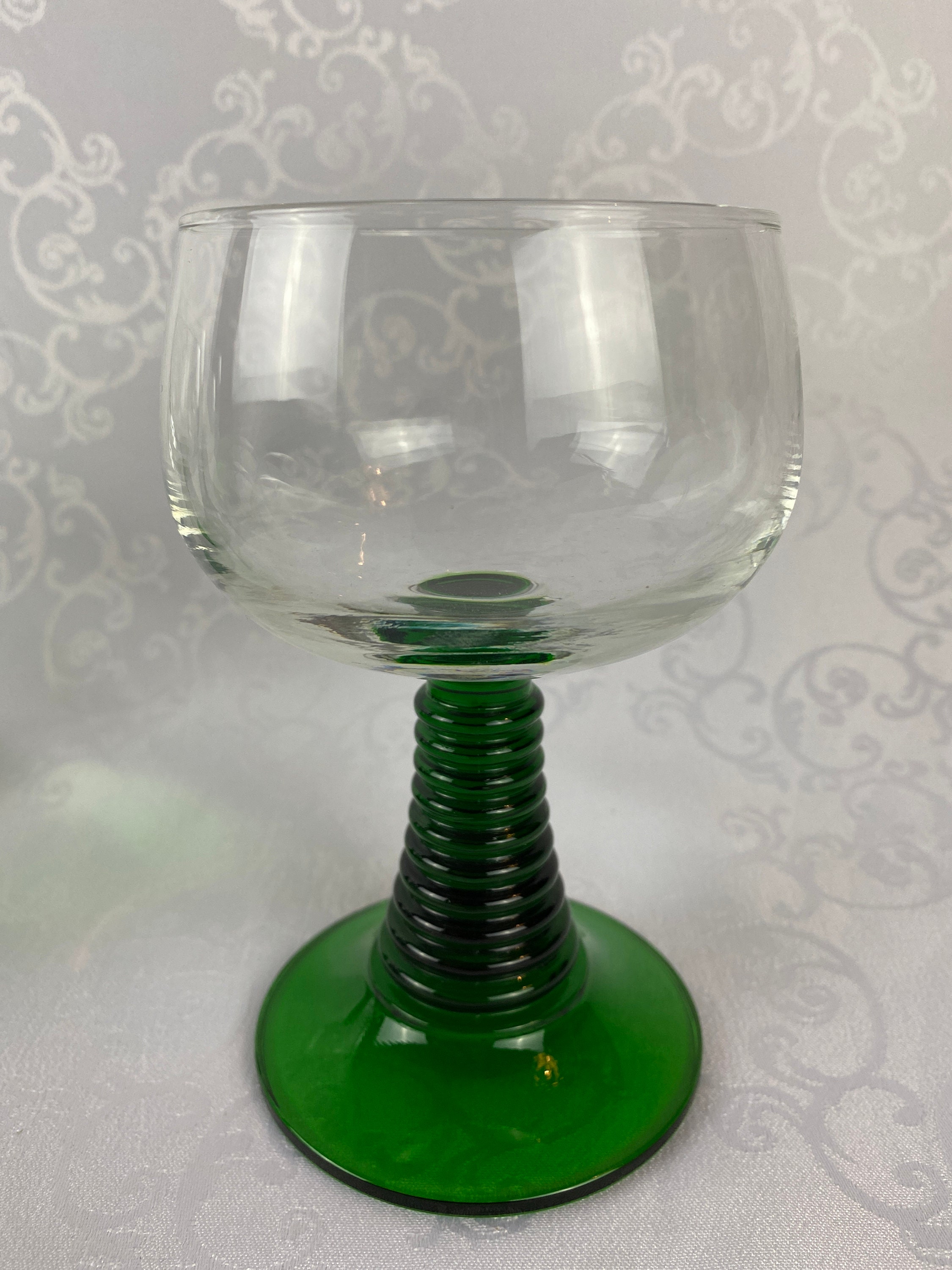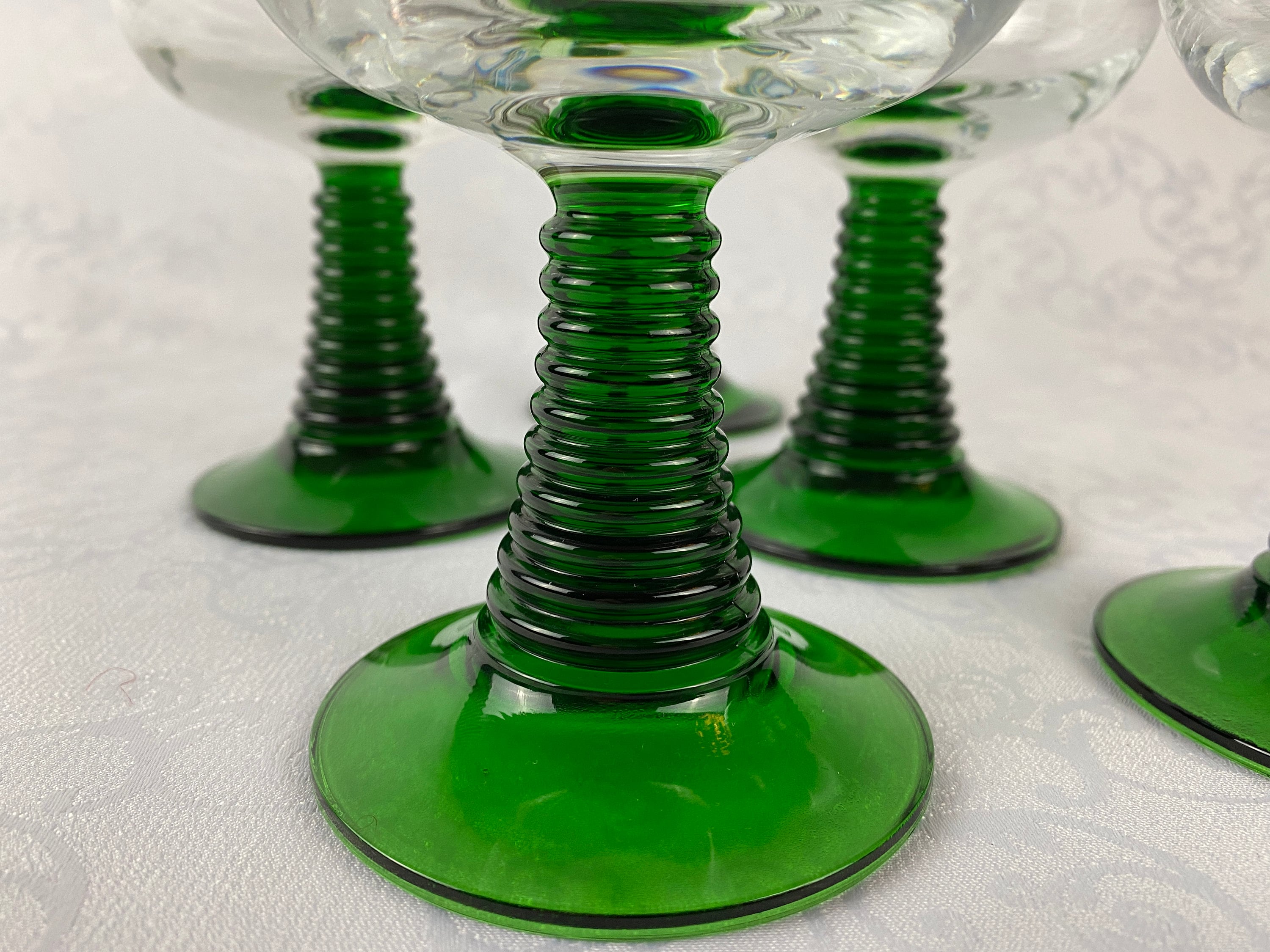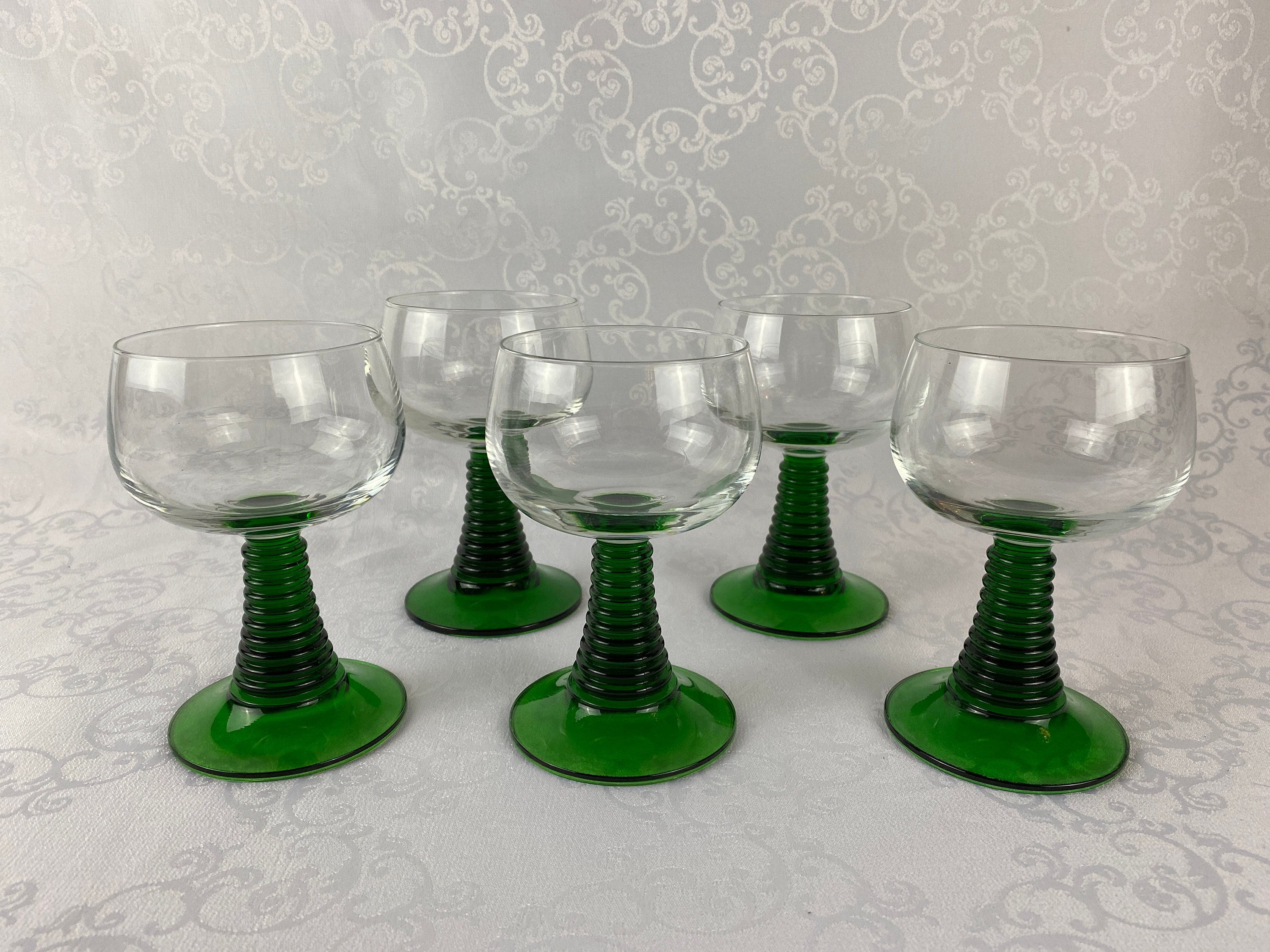 Set of 5 large Roemer wine glasses with a green colored ribbed stem. Made in France. Vintage mid century design from the 1970's. A lovely addition for your retro barware collection.