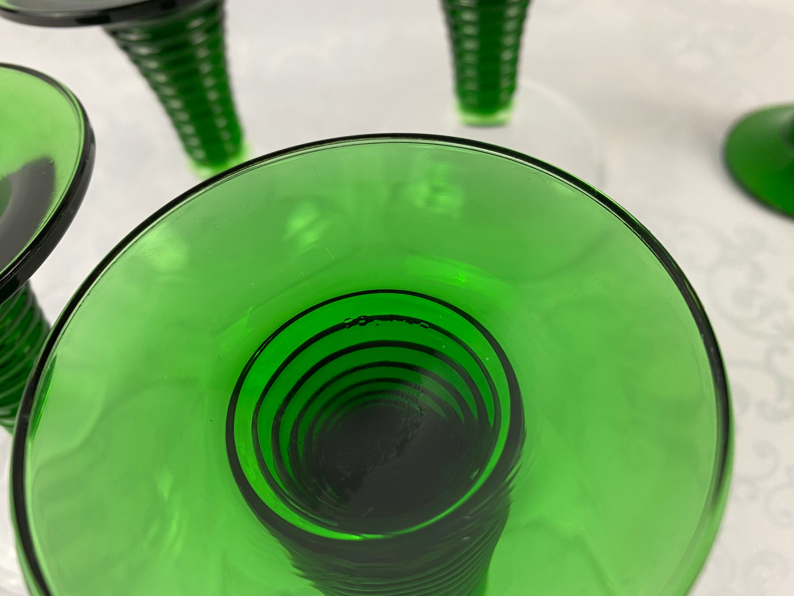 5 large green stemmed wine glasses, green colored ribbed stem, roemer glasses, vintage mid century design barware from the 1970's, France